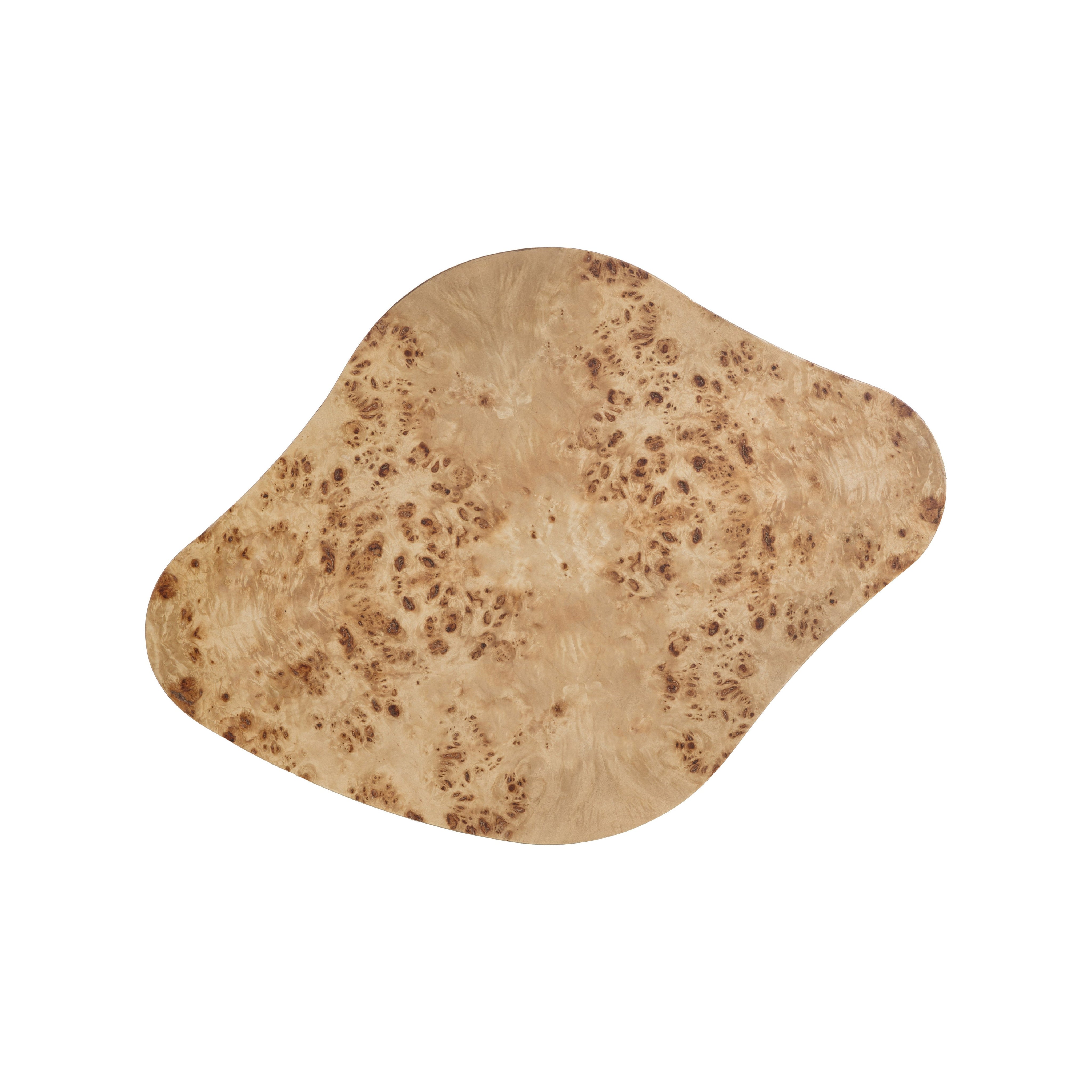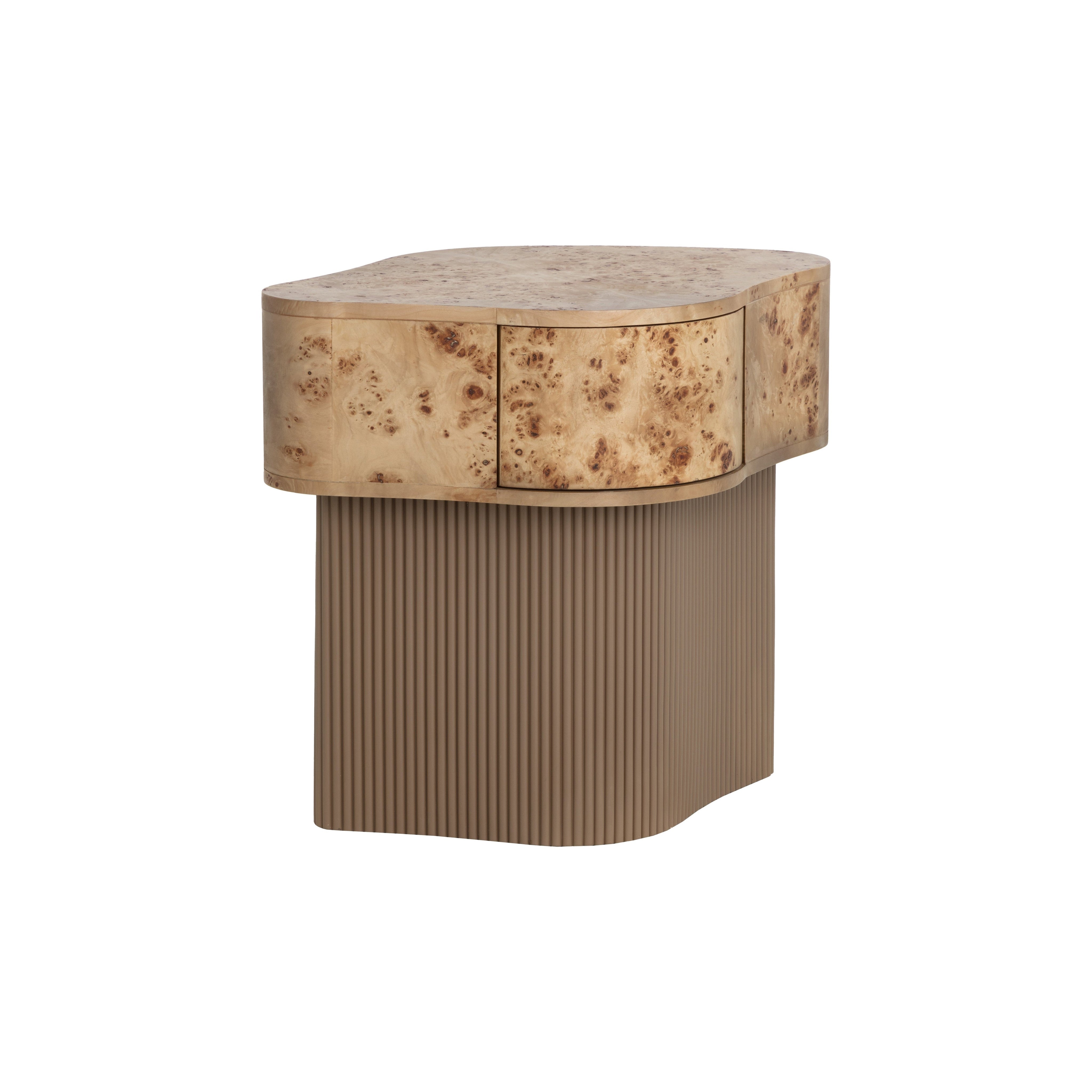 With its freeform silhouette and bold burl grain, the Fayra Nightstand makes a striking addition to any space. The asymmetrical top is wrapped in natural burl veneer, showcasing organic, one-of-a-kind patterns. A single push-to-open drawer is seamlessly integrated into the form, set above a ribbed resin base with a lacquered finish.