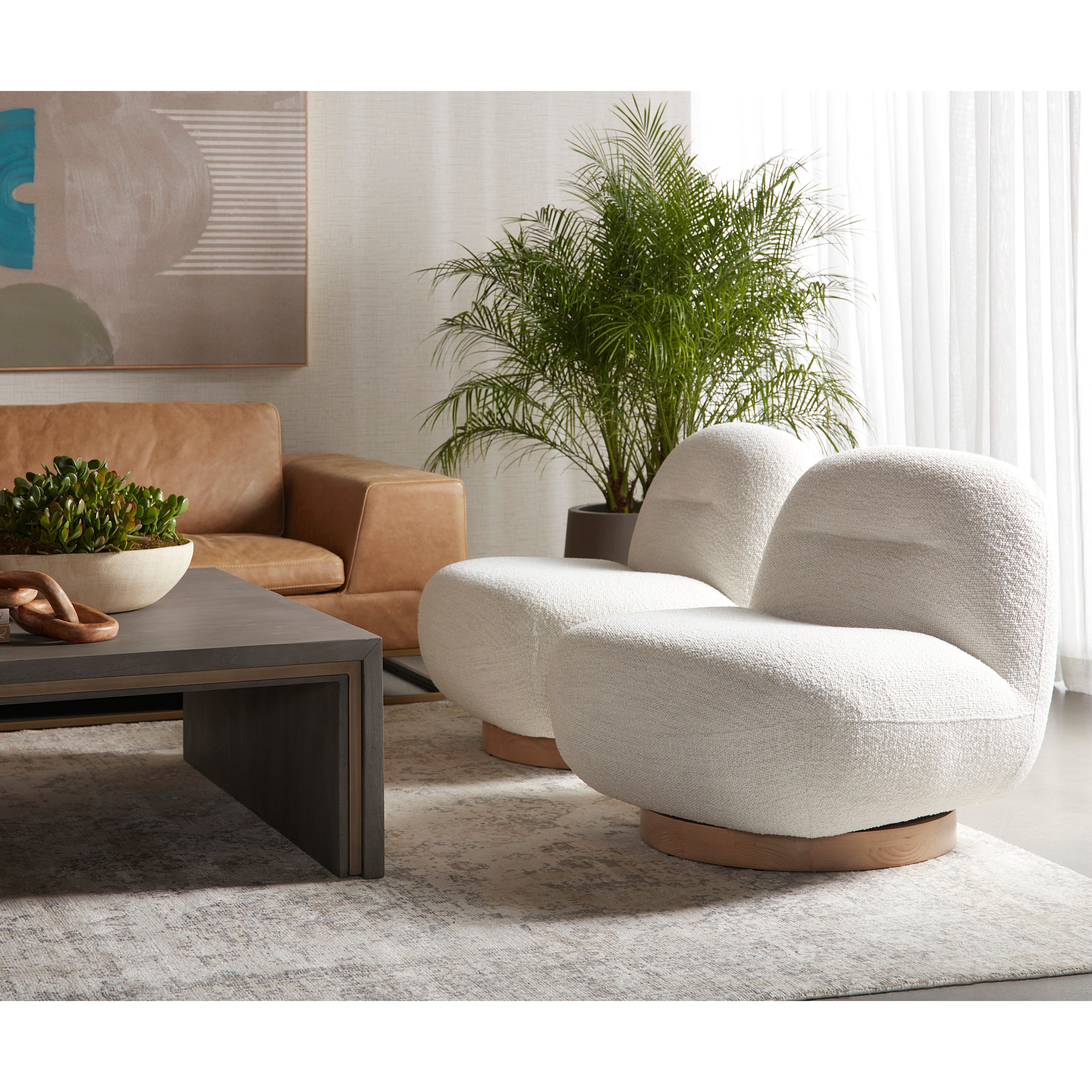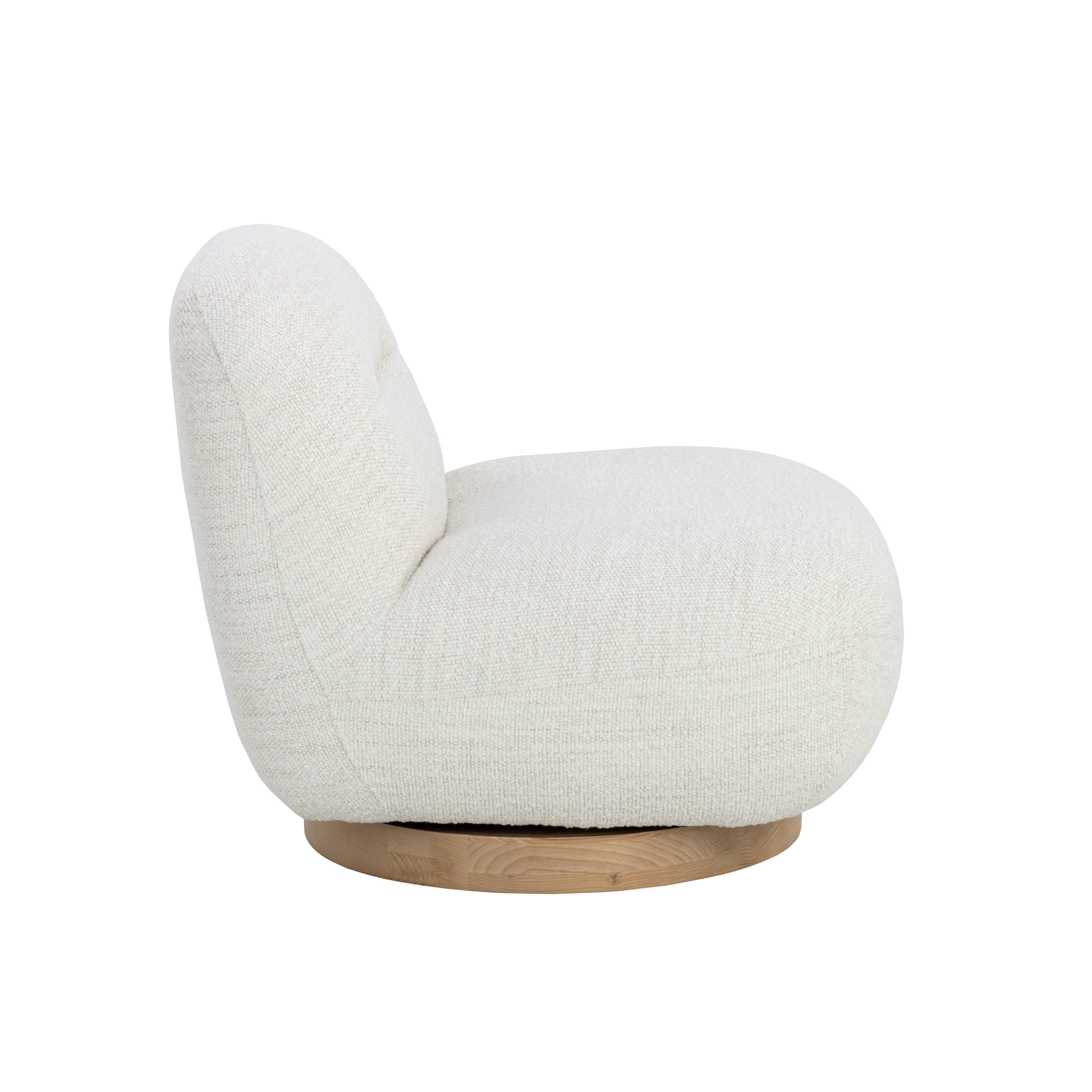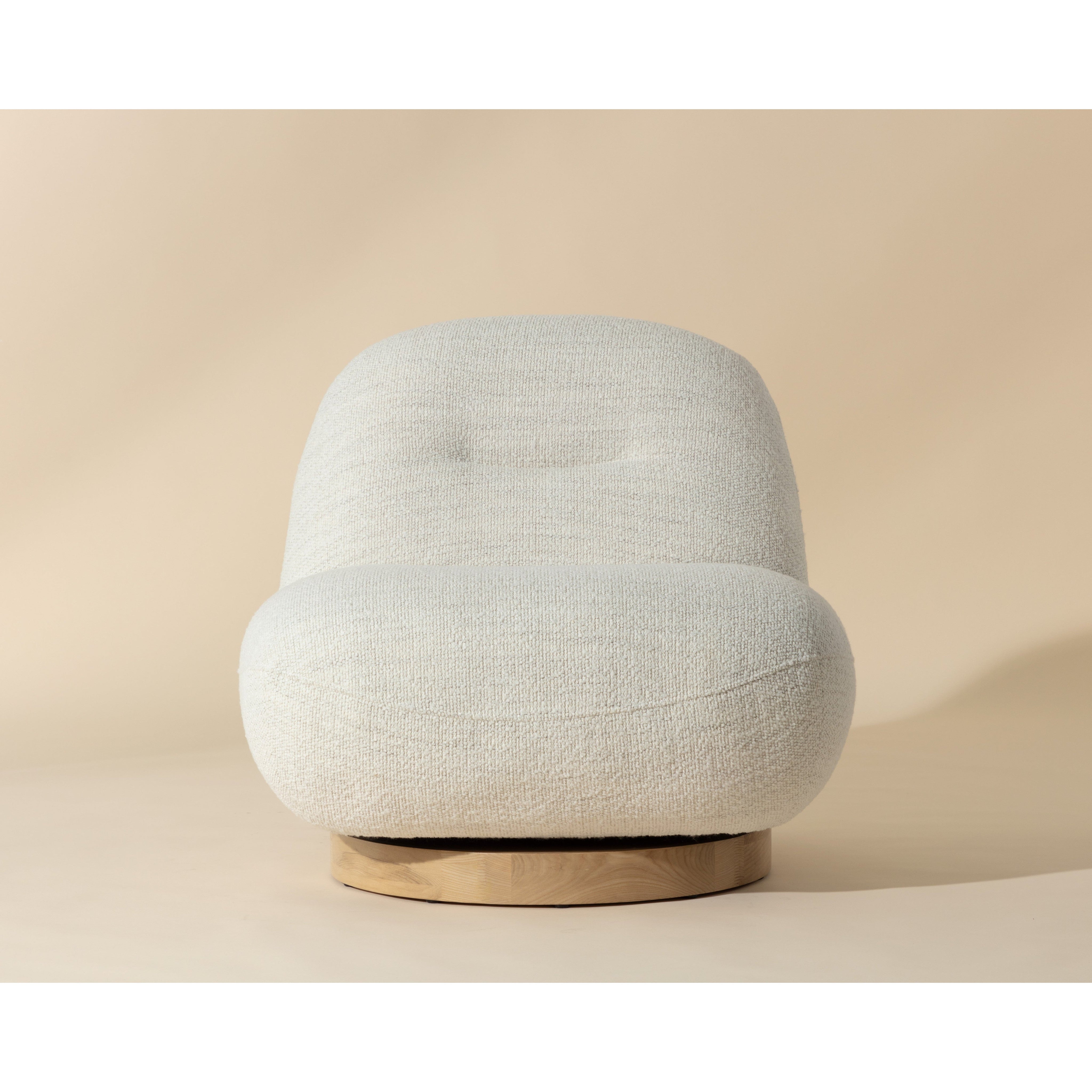 The Franze Swivel Lounge Chair exudes comfort and style. Features a minimalist silhouette upholstered in our merino pearl performance fabric. A blonde ash wood base completes the look. Performance fabric is moisture repellent, durable and easy to clean. As wood is an organic, porous material, these pieces will contain natural variation of texture and may also exhibit fine indentations and cracks. Wood pieces will also display a disparity of colour and grain, and visible knots and burls that add to the character of each piece.