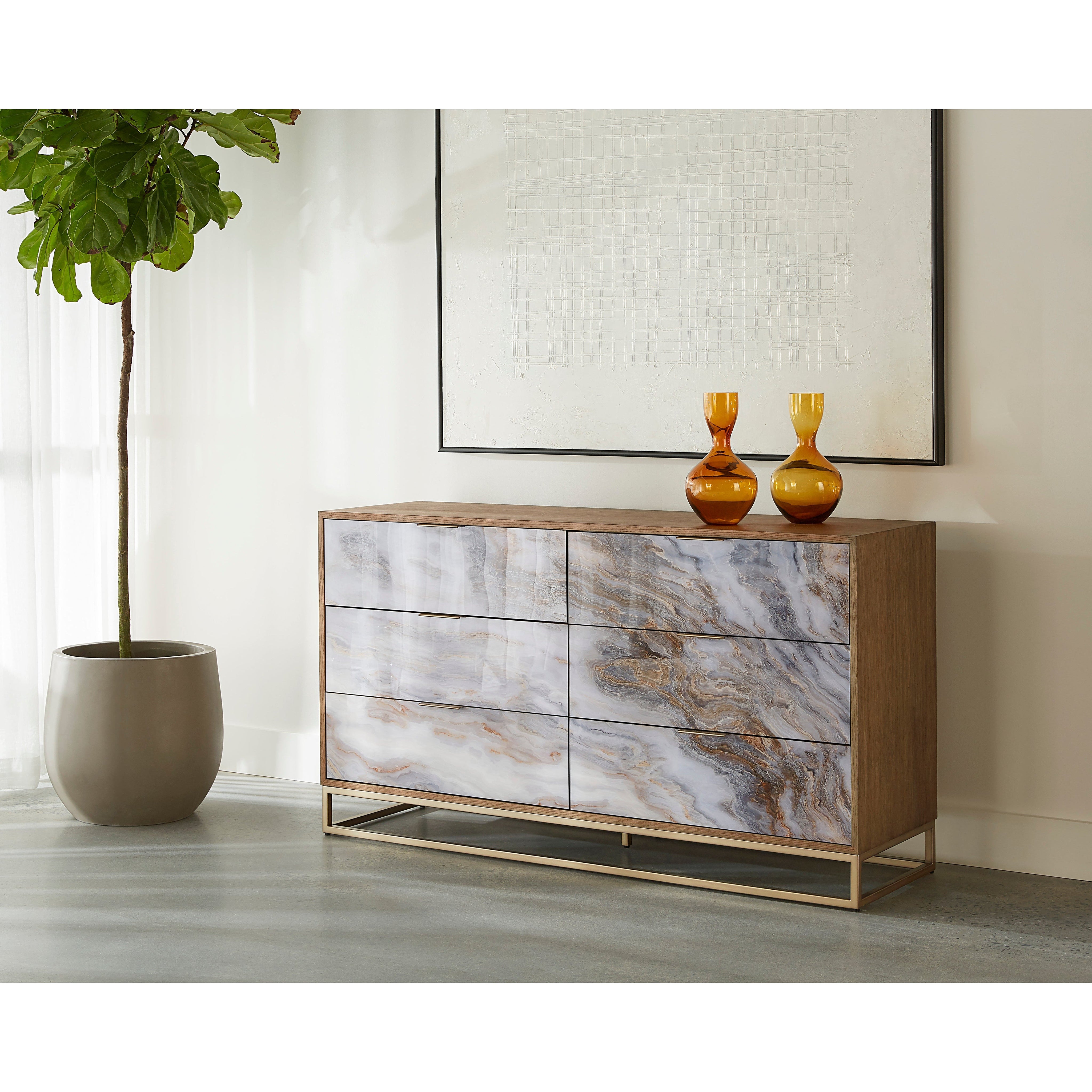 Incorporate a touch of extravagance to any bedroom space with this brilliant dresser that is full of rich detail. Features a brown oak veener body with printed acrylic doors that share a likeness to mother of pearl. Ample storage is available inside the six cabinets which includes soft close doors. Completed with a steel base in a brass finish. Anti-tip kit included.