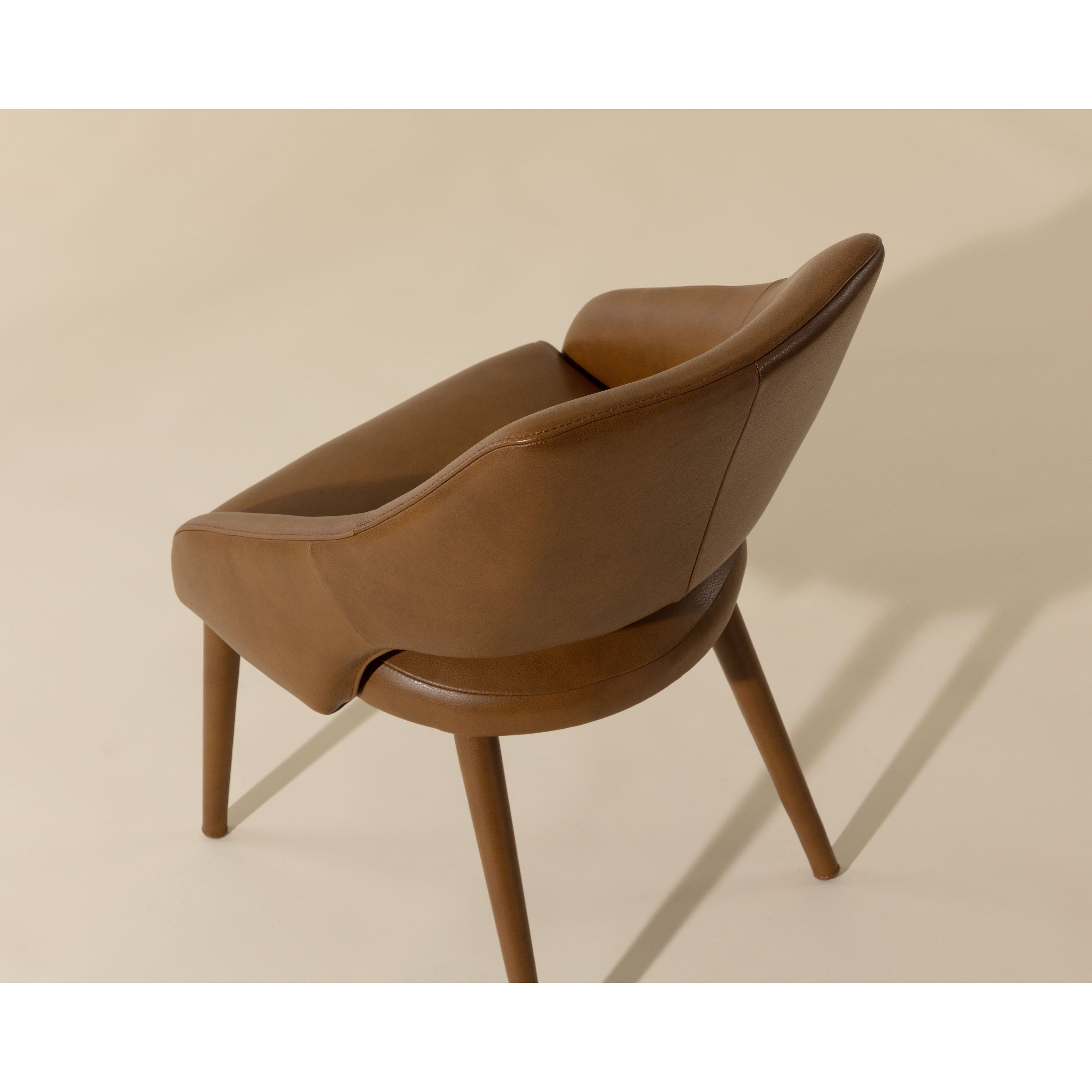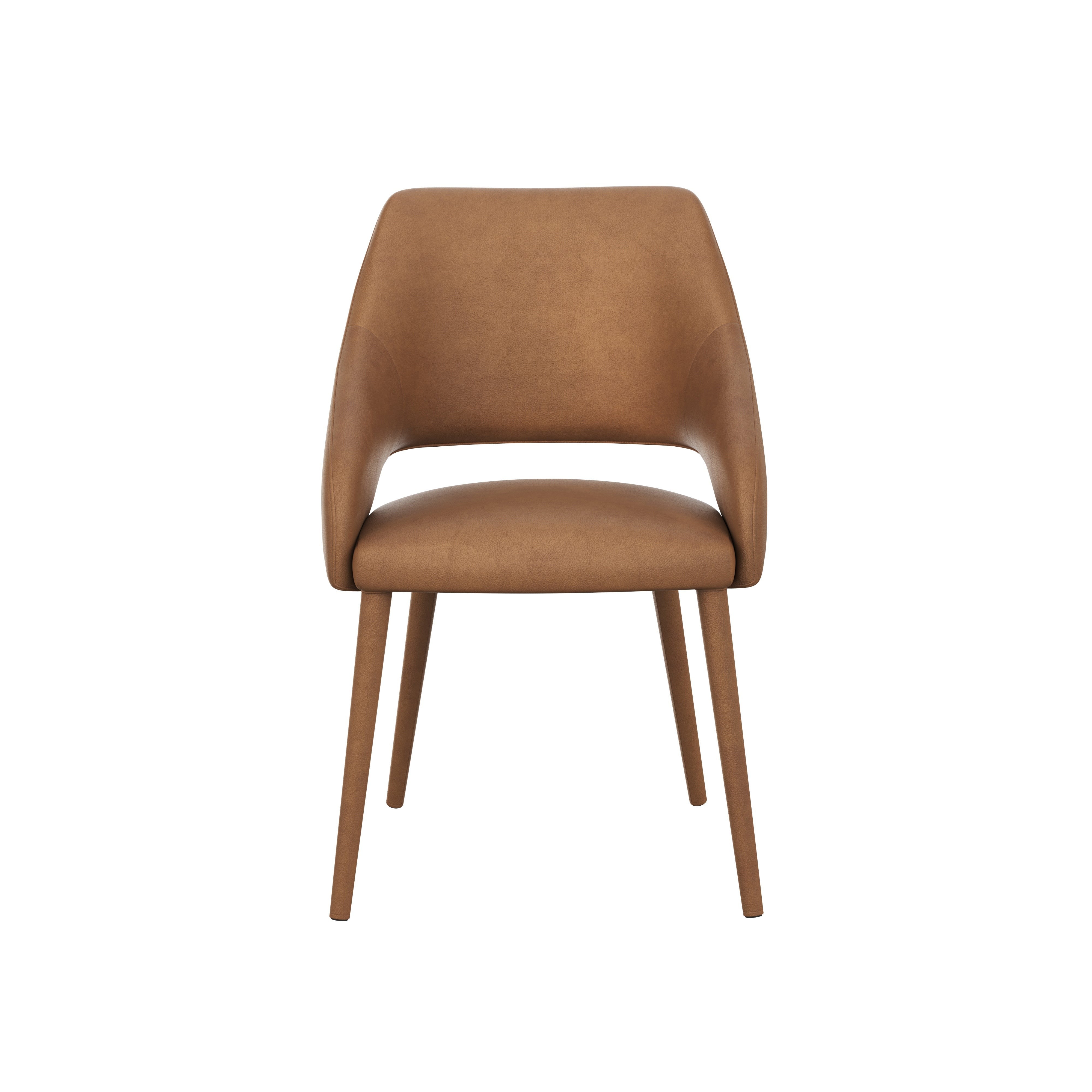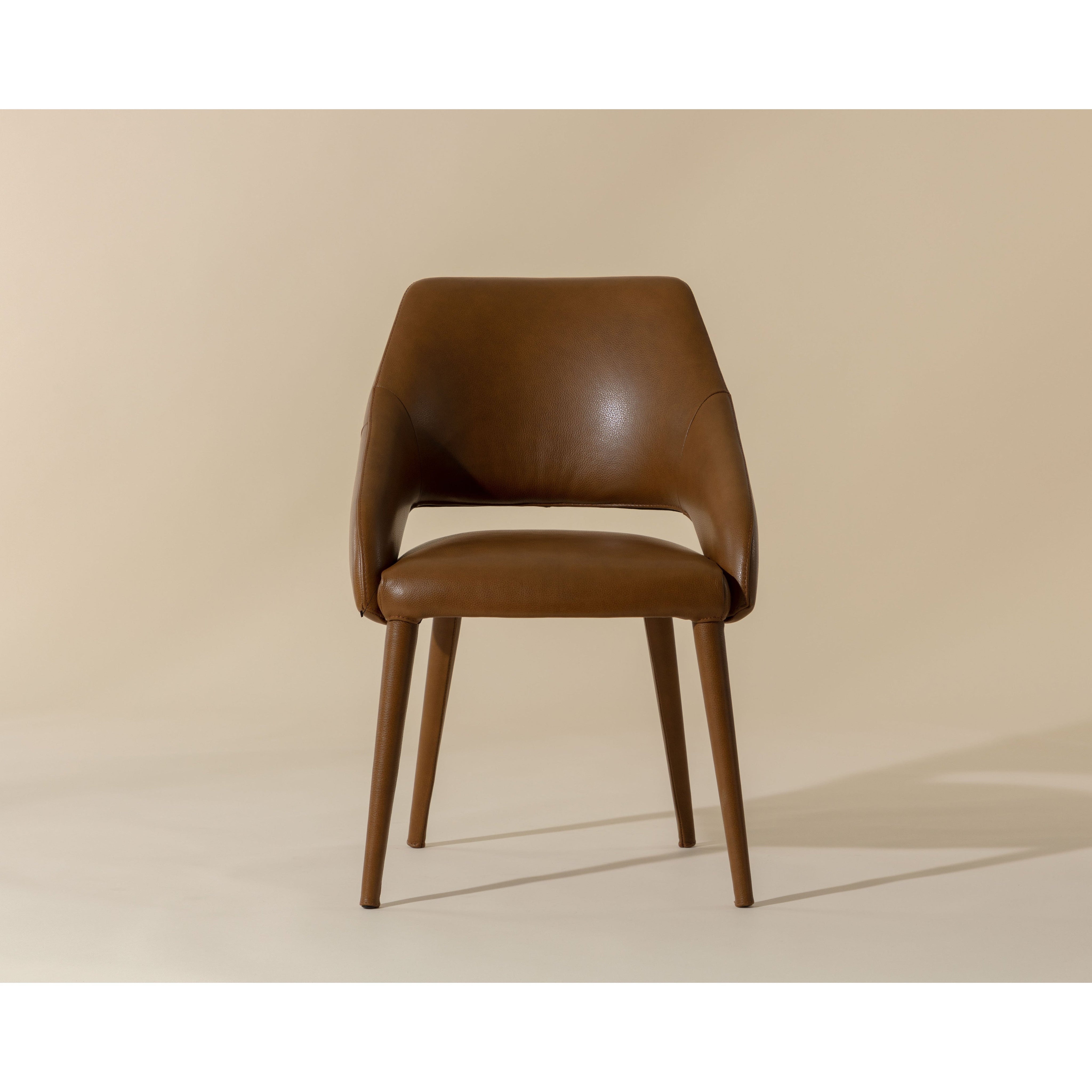With a modern and monochromatic design, the Galen Dining Armchair will stun in any dining space. Fully upholstered in missouri cognac leather, its minimal profile features sloped arms and a cutout back rest for everyday comfort. Handle with Care: This design has been crafted with 100% leather. Leather is a natural material; as such, colour variations, markings, wrinkles, grooves and light scratches are acceptable and appreciated characteristics. No two pieces are alike. Visit our Product Care page for more information on how to ensure the lasting beauty of this piece.