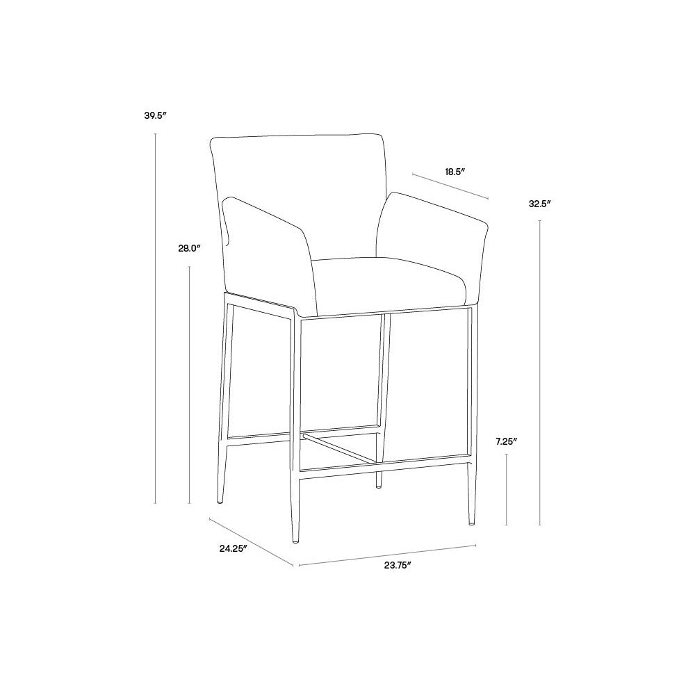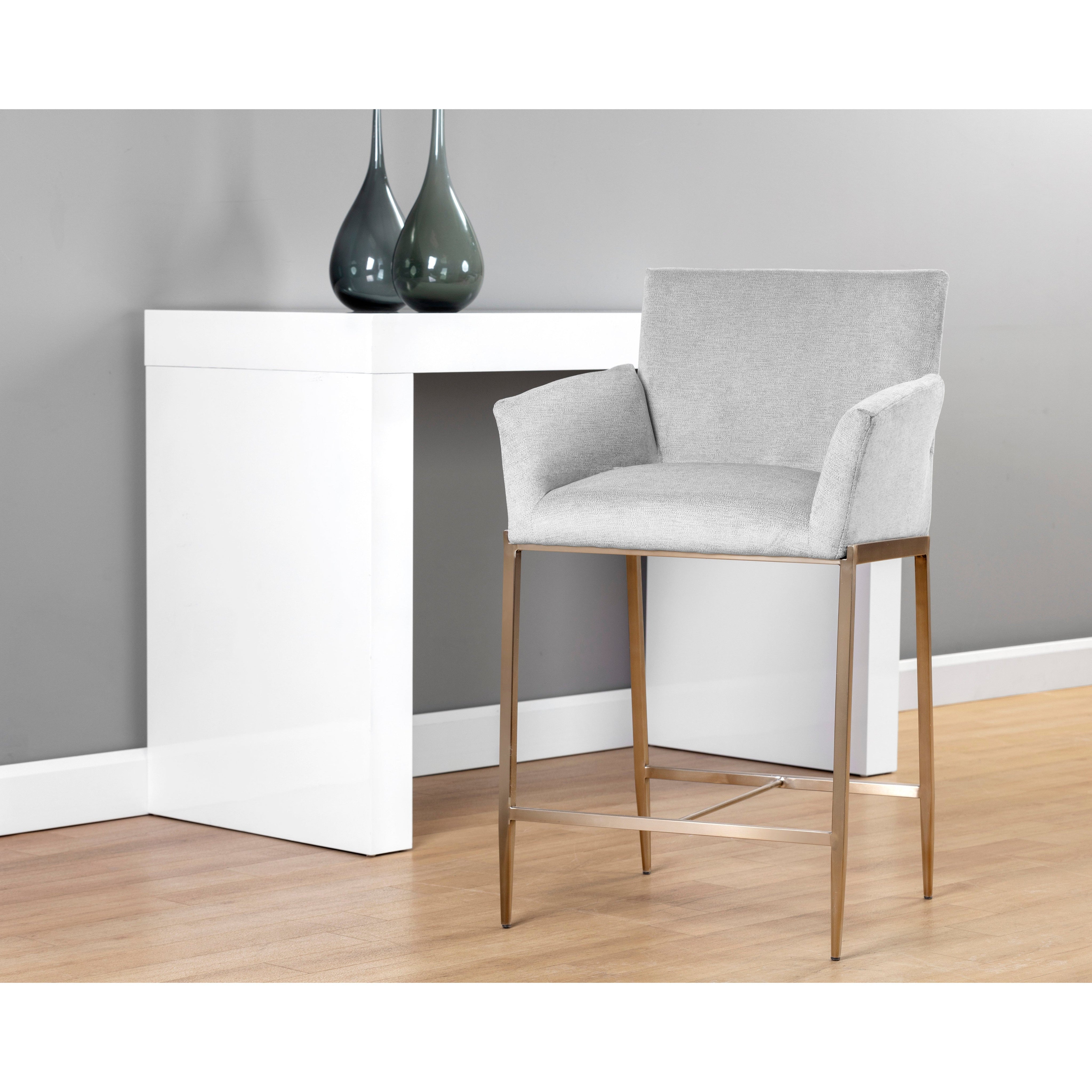 A modern counter stool with contemporary finishes. This charming counter stool sits comfortably while bringing a touch of elegance to dining spaces. Finished in polo club stone performance fabric with an antique brass frame. Performance fabric is moisture repellent, durable and easy to clean. Suitable for various dining, kitchen and bar spaces of all sizes.