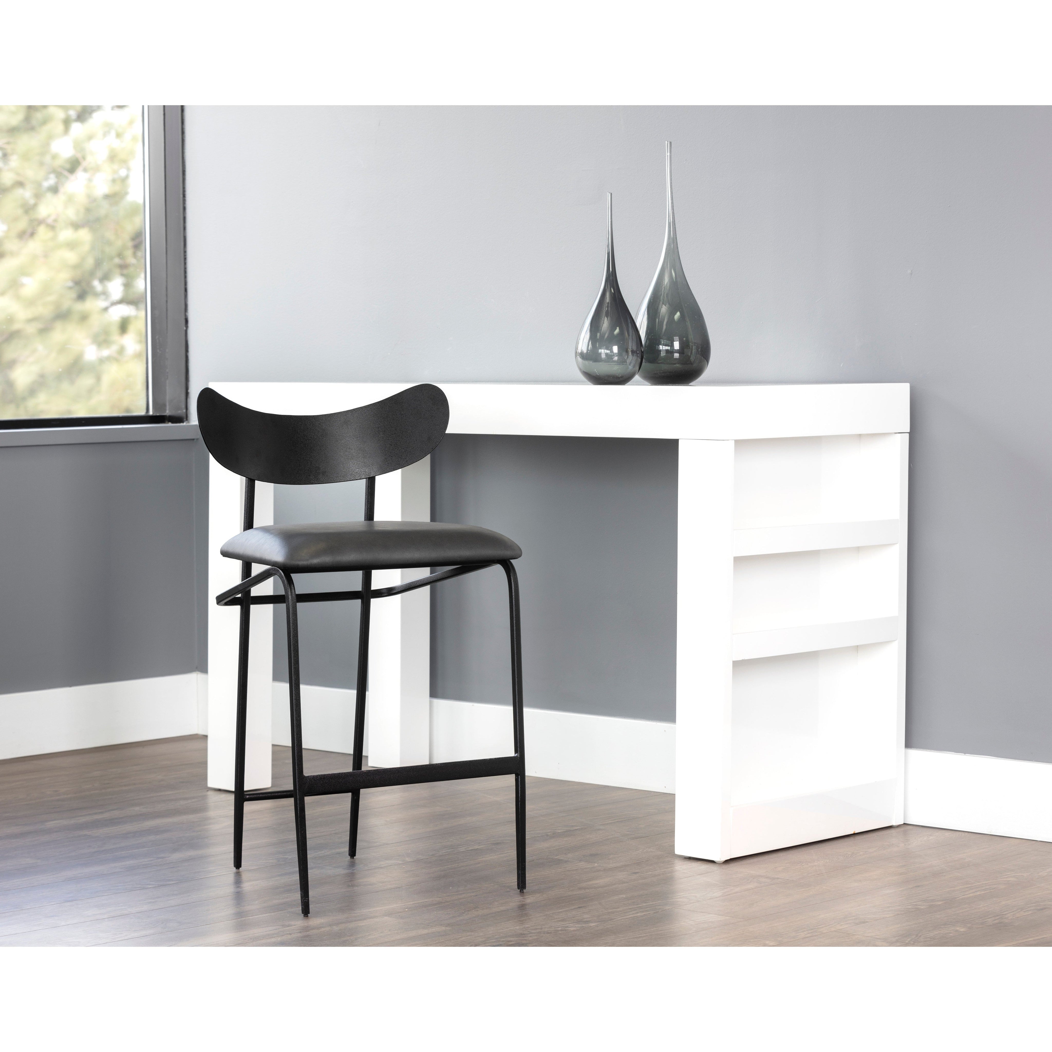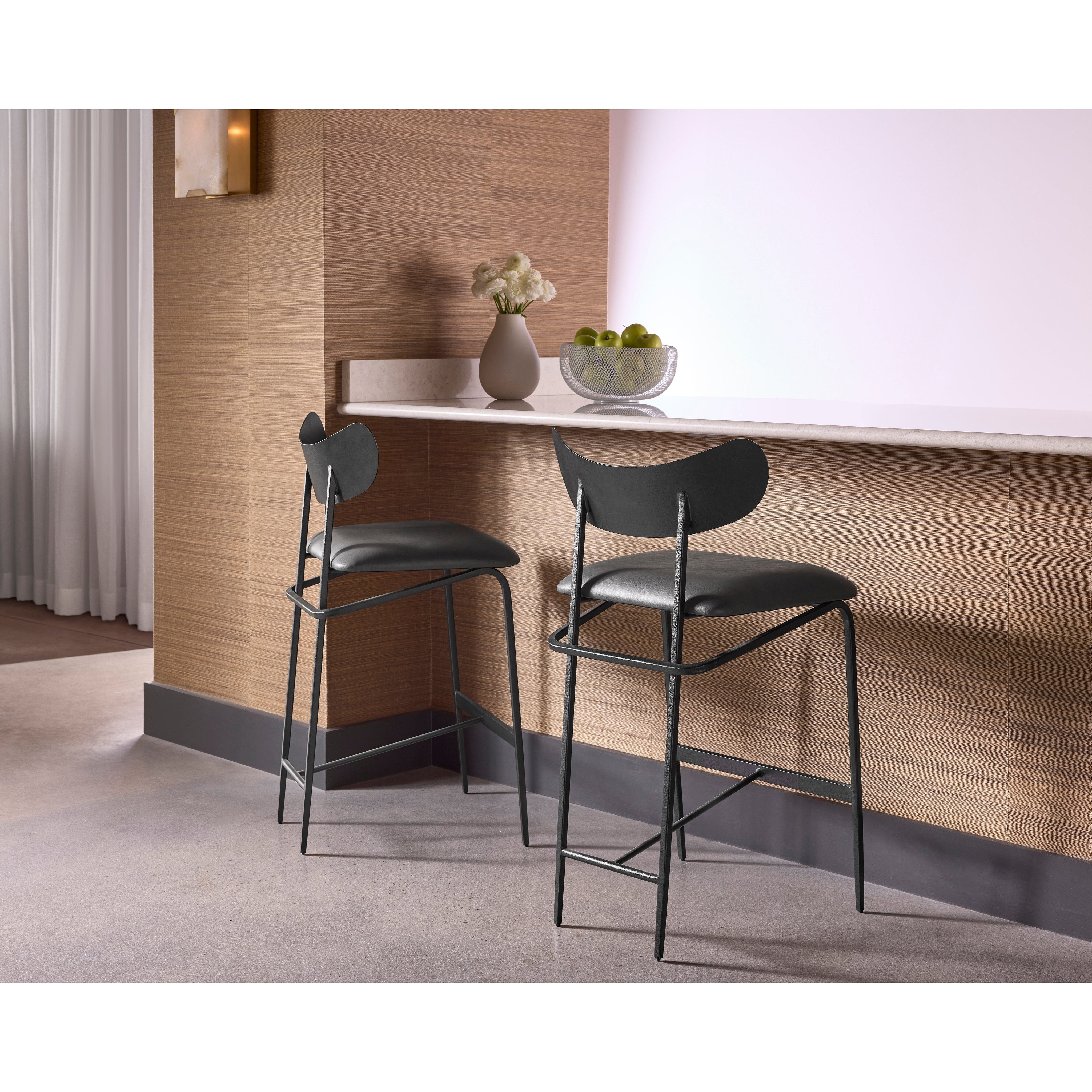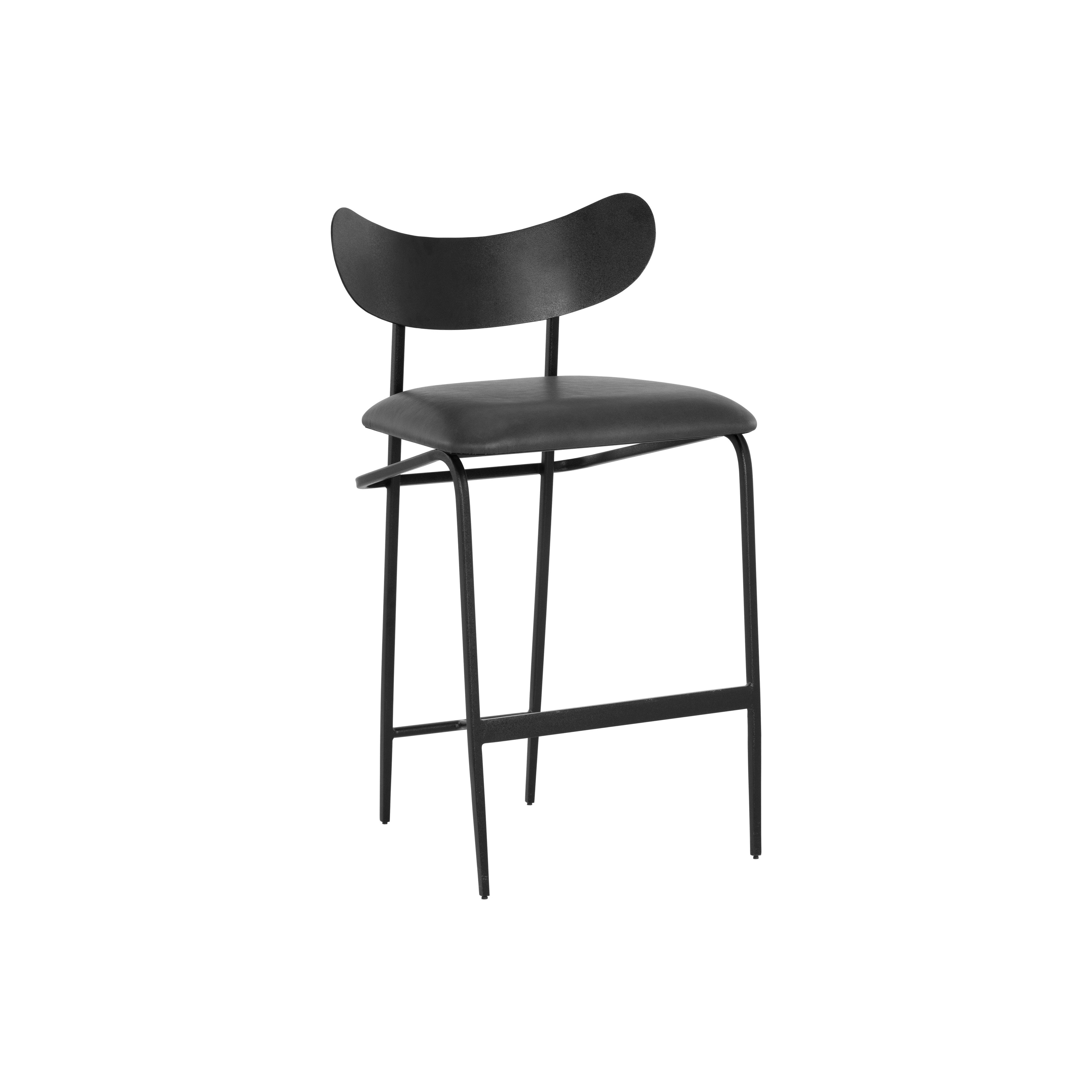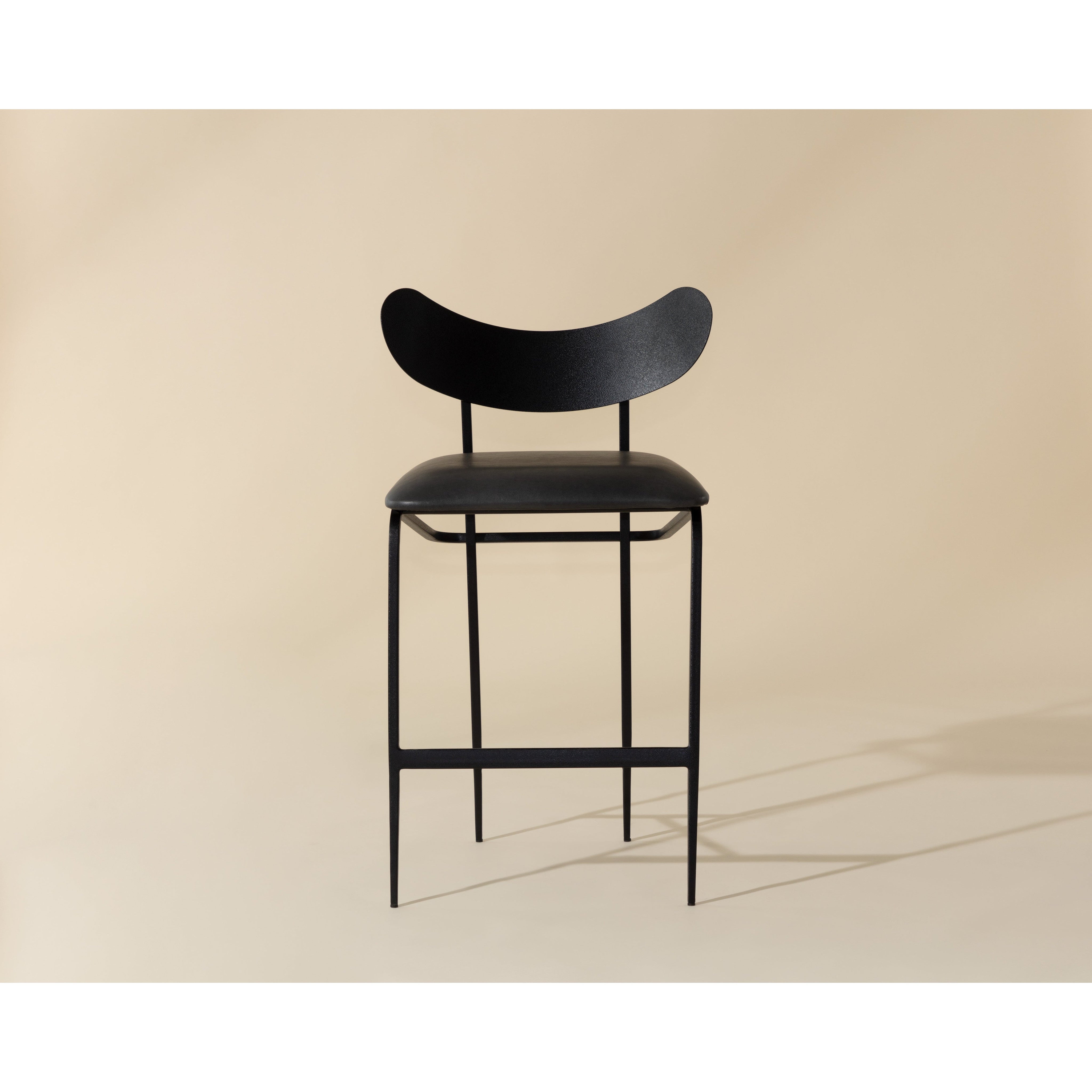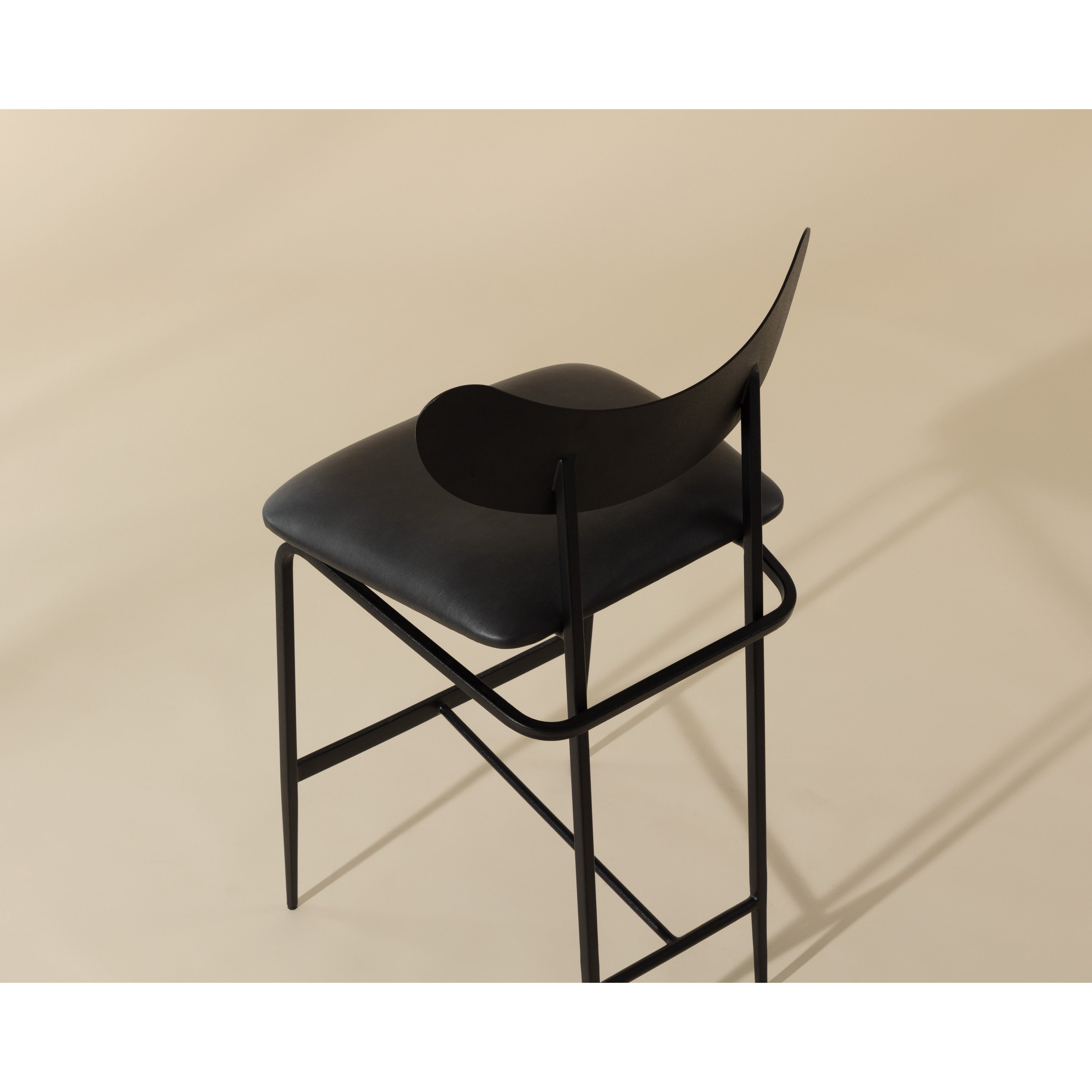 A unique mid-century modern inspired counter stool crafted in India. Features seat in bravo portabella faux leather with a sculpted seatback and frame in black steel. Suitable for various dining, kitchen and bar spaces of all sizes. Handle With Care: This design has been crafted with faux leather. Faux leather is manufactured to reflect the natural characteristics of leather; as such, colour variations, markings, wrinkles, grooves, and light scratches are appreciated characteristics. No two pieces will be alike. Visit our Product Care page for more information on how to ensure the lasting beauty of this piece. Made in India. With refined craftsmanship, this design was brought to life by skilled local artisans. Due to the nature of handcraftsmanship, unique imperfections such as fissures, markings and variations in colour and shape are welcomed and appreciated characteristics for a truly one-of-a-kind piece.