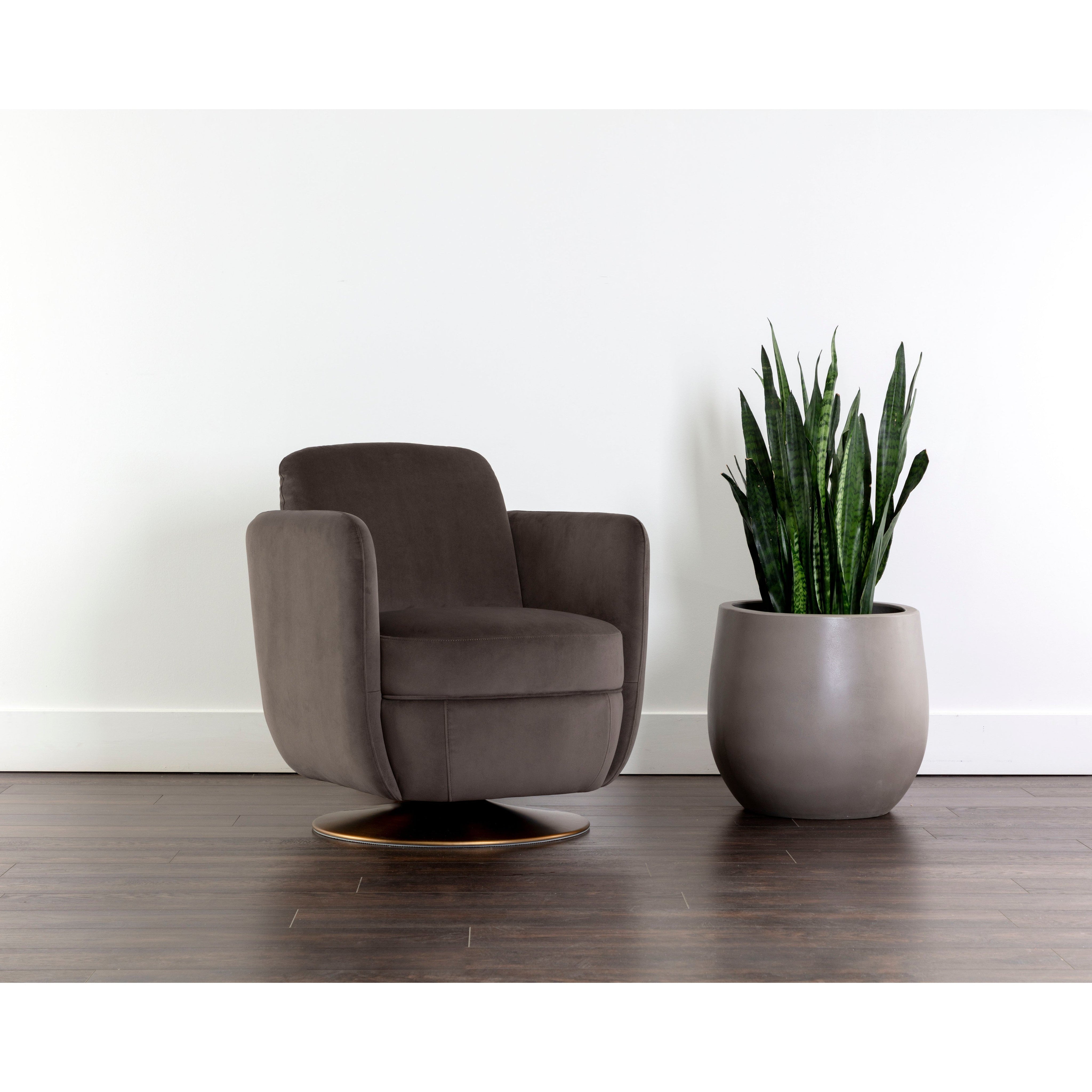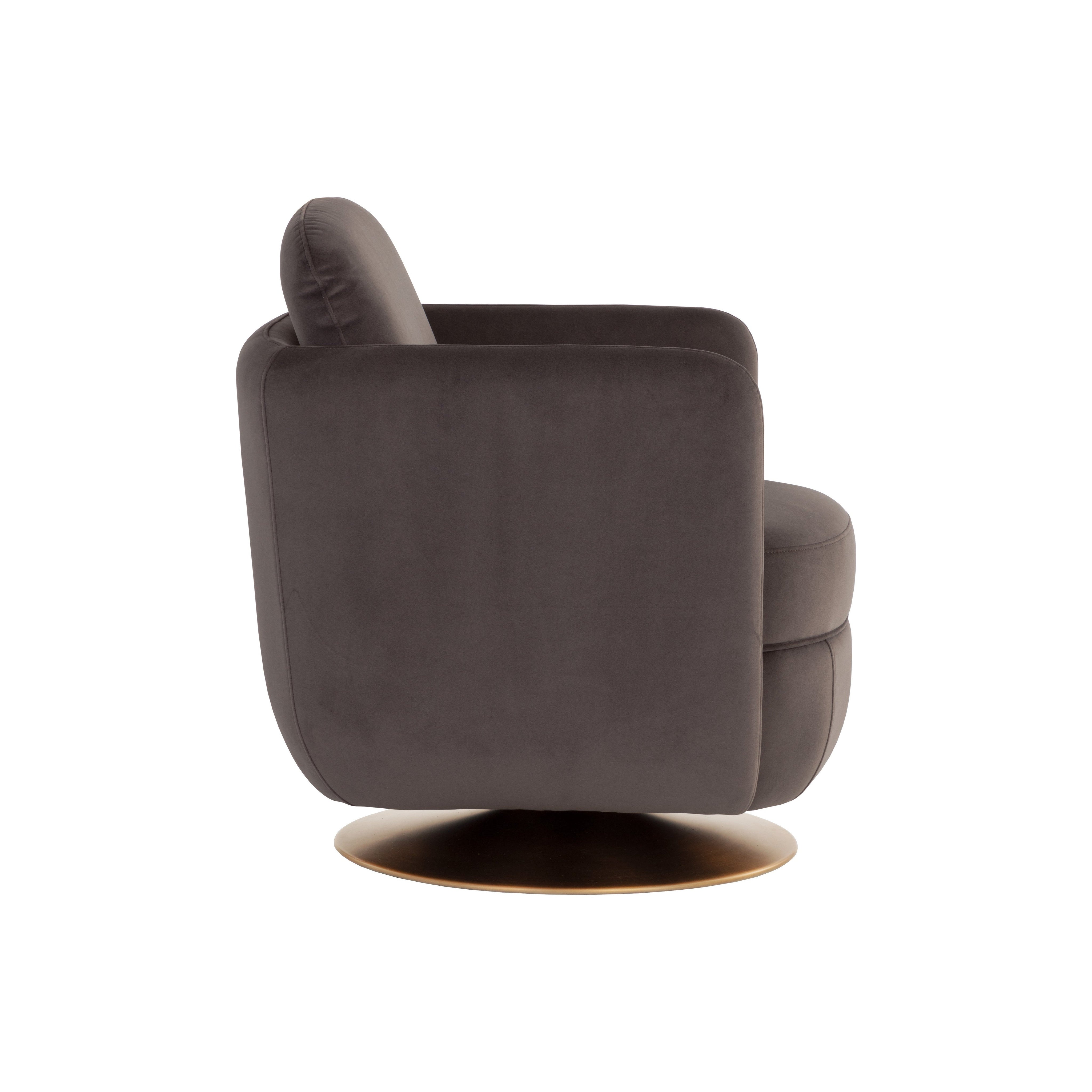 Add a compelling touch of contemporary style with this eye-catching swivel lounge chair. Stocked in meg ash fabric and completed with a round, antique gold stainless steel base. Also available in bergen navy fabric.