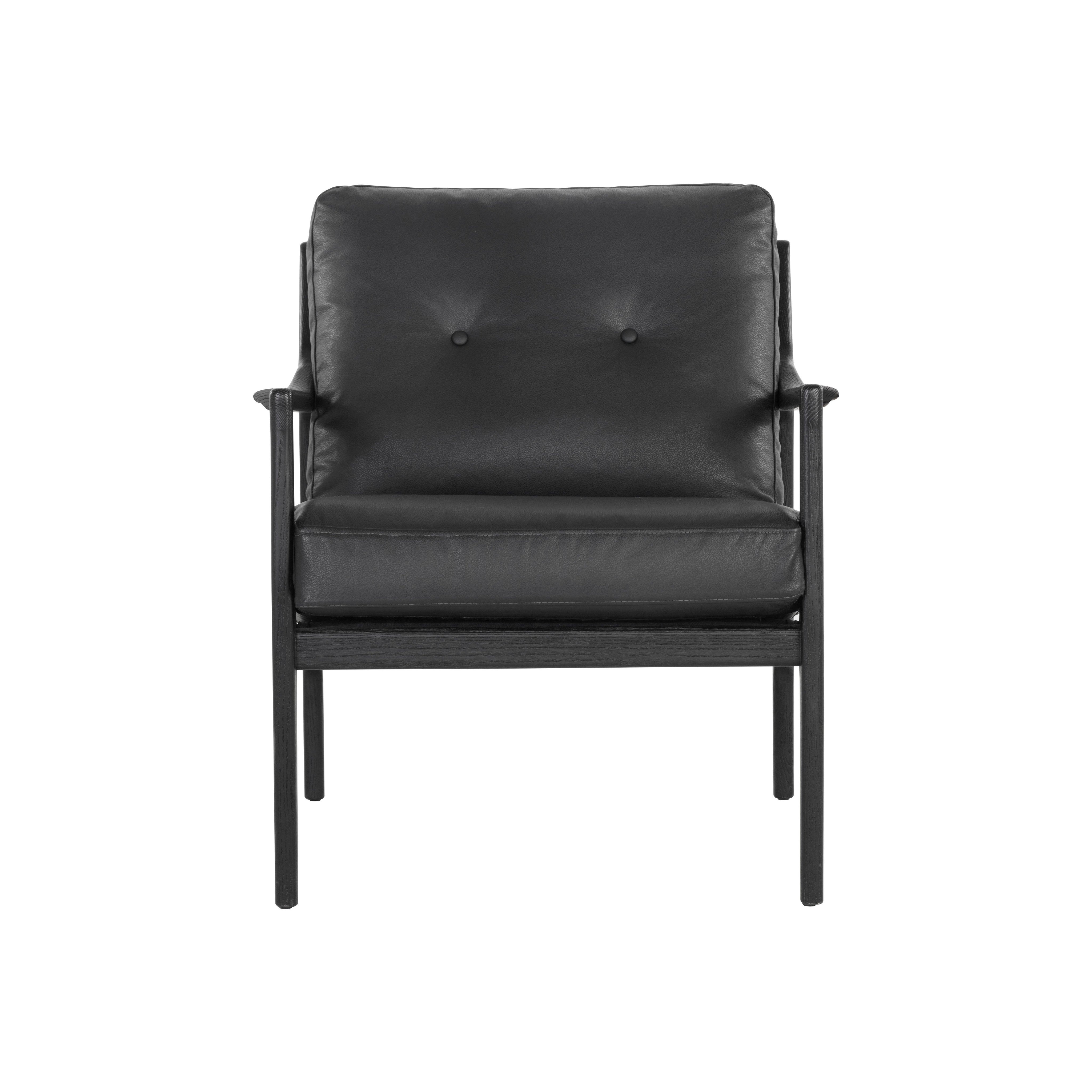 A bold and masculine lounge chair crafted in Vietnam. Features a mid-century inspired frame in black solid oak wood with a black leather seatback. Button tufting completes the look. Handle with Care: This design has been crafted with leather. Leather is a natural material; as such, colour variations, markings, wrinkles, grooves and light scratches are acceptable and appreciated characteristics. No two pieces are alike. Visit our Product Care page for more information on how to ensure the lasting beauty of this piece.