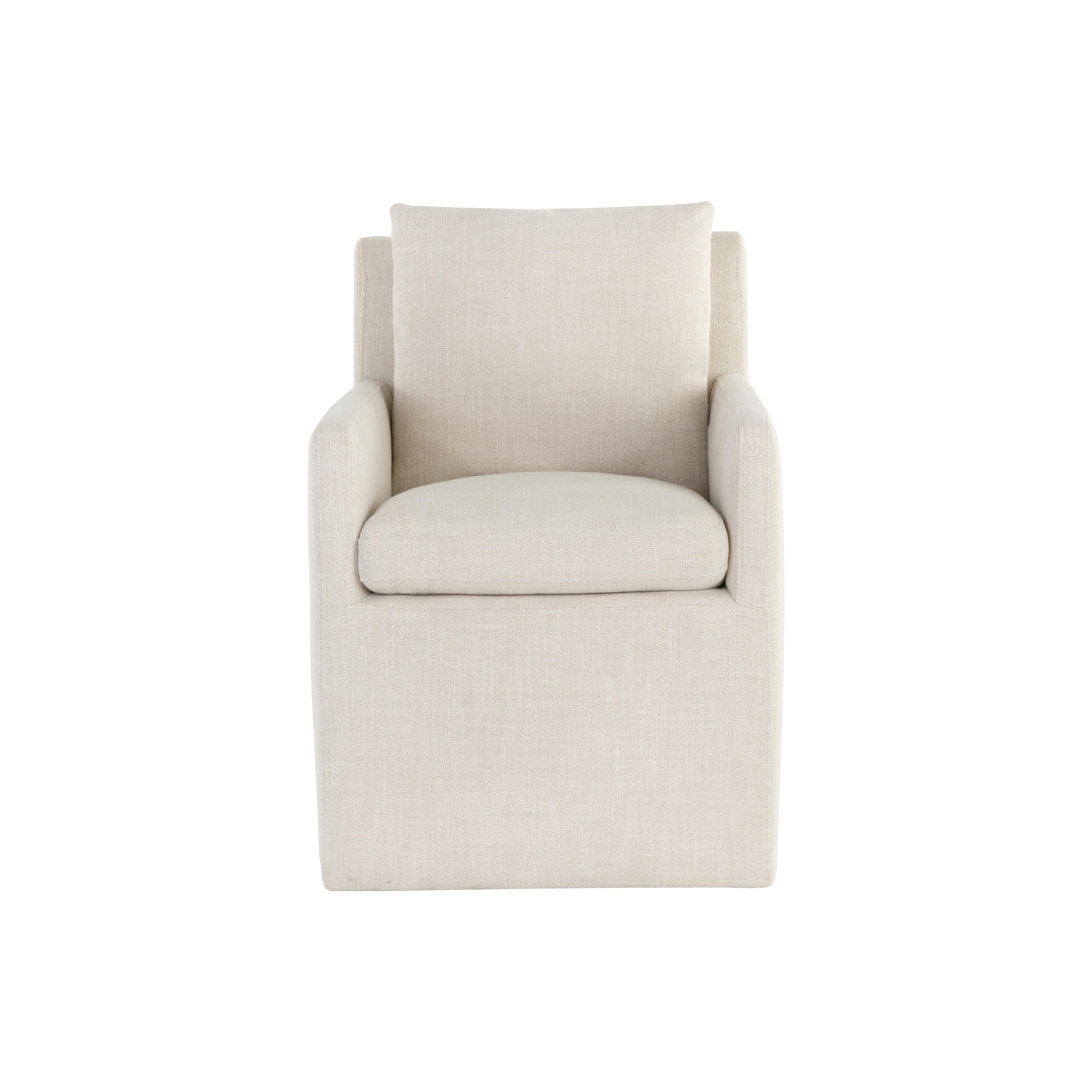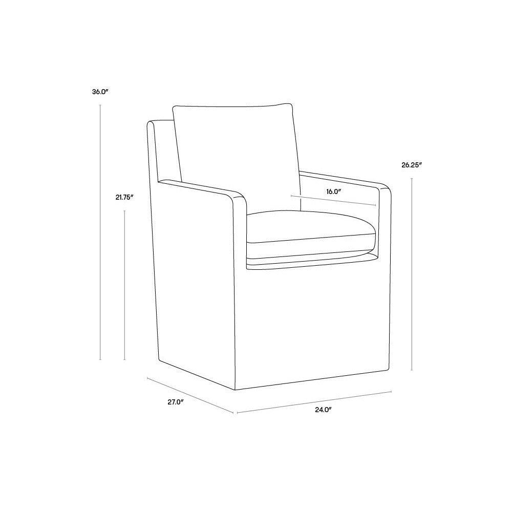 A formal and comfortable wheeled dining armchair that is full of classic appeal. Stocked in effie linen fabric. As this piece features feather-filled cushions, occasional rotation and fluffing is required to maintain its lasting comfort and beauty. Visit our Product Care page for more information.
