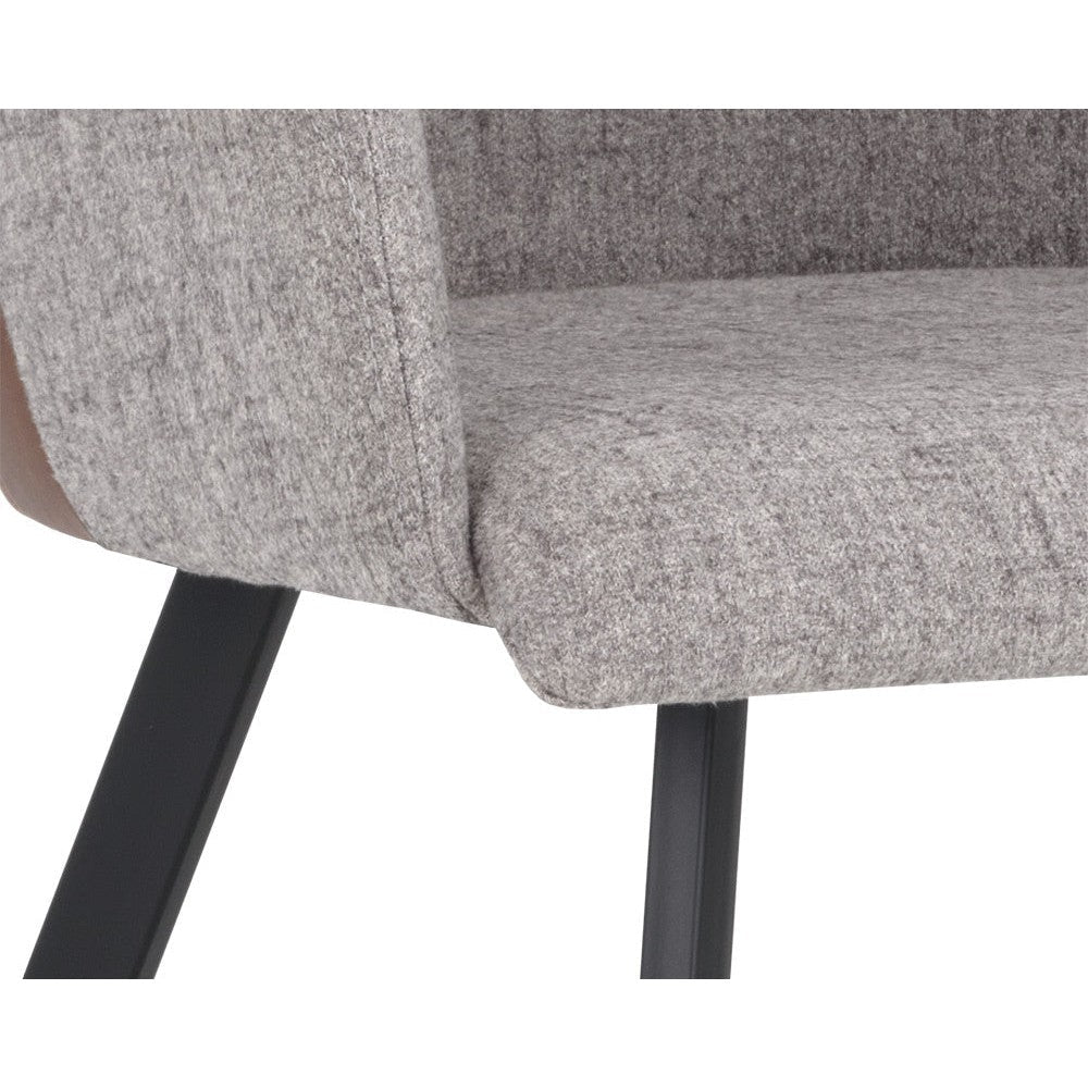 This modern dining armchair will provide comfort and style to any residential or commercial space. Features an interior seat in November grey fabric and a contrasting channel stitched exterior seatback in bravo cognac faux leather. Finished with sturdy black powder-coated iron legs. Handle With Care: This design has been crafted with faux leather. Faux leather is manufactured to reflect the natural characteristics of leather; as such, colour variations, markings, wrinkles, grooves, and light scratches are appreciated characteristics. No two pieces will be alike. Visit our Product Care page for more information on how to ensure the lasting beauty of this piece.