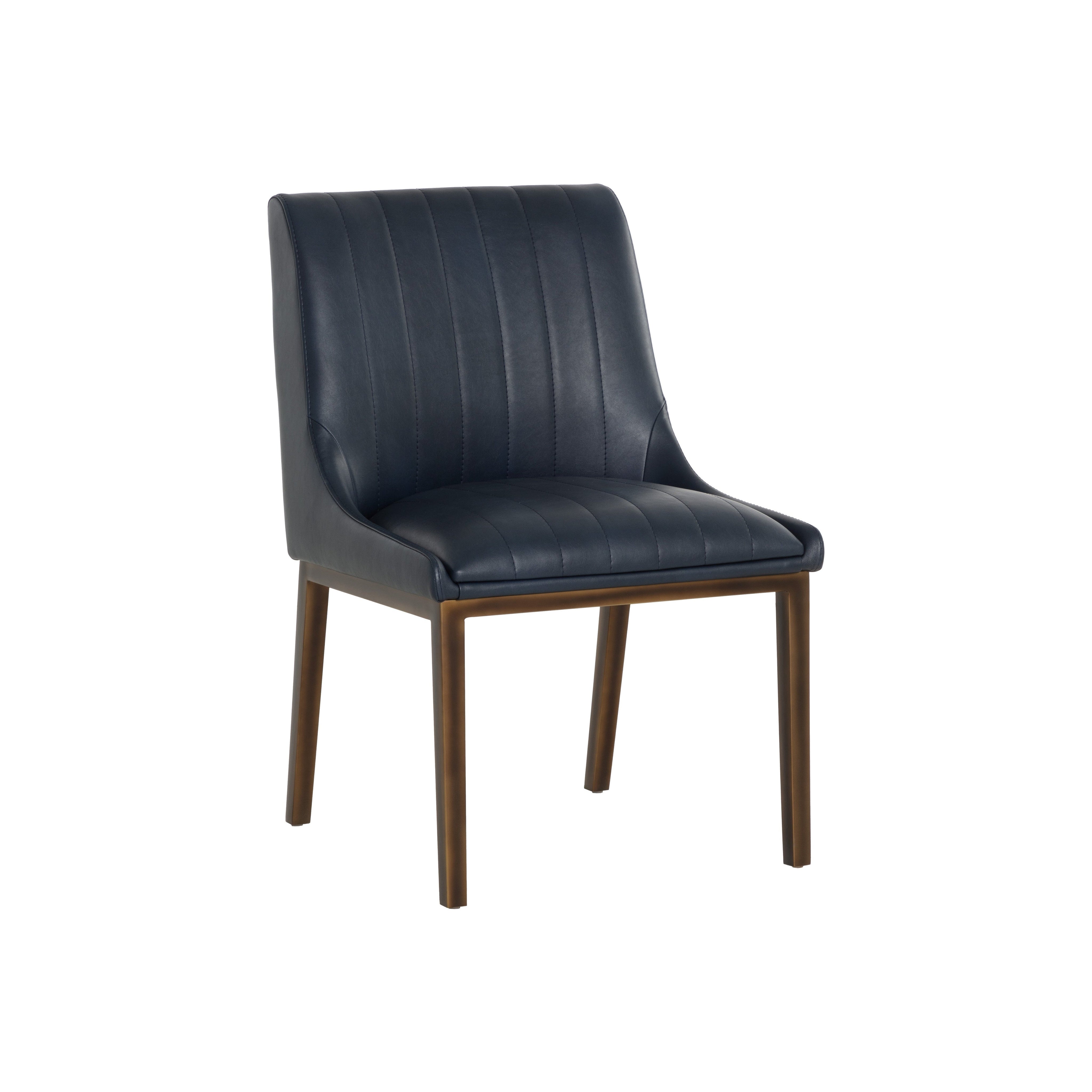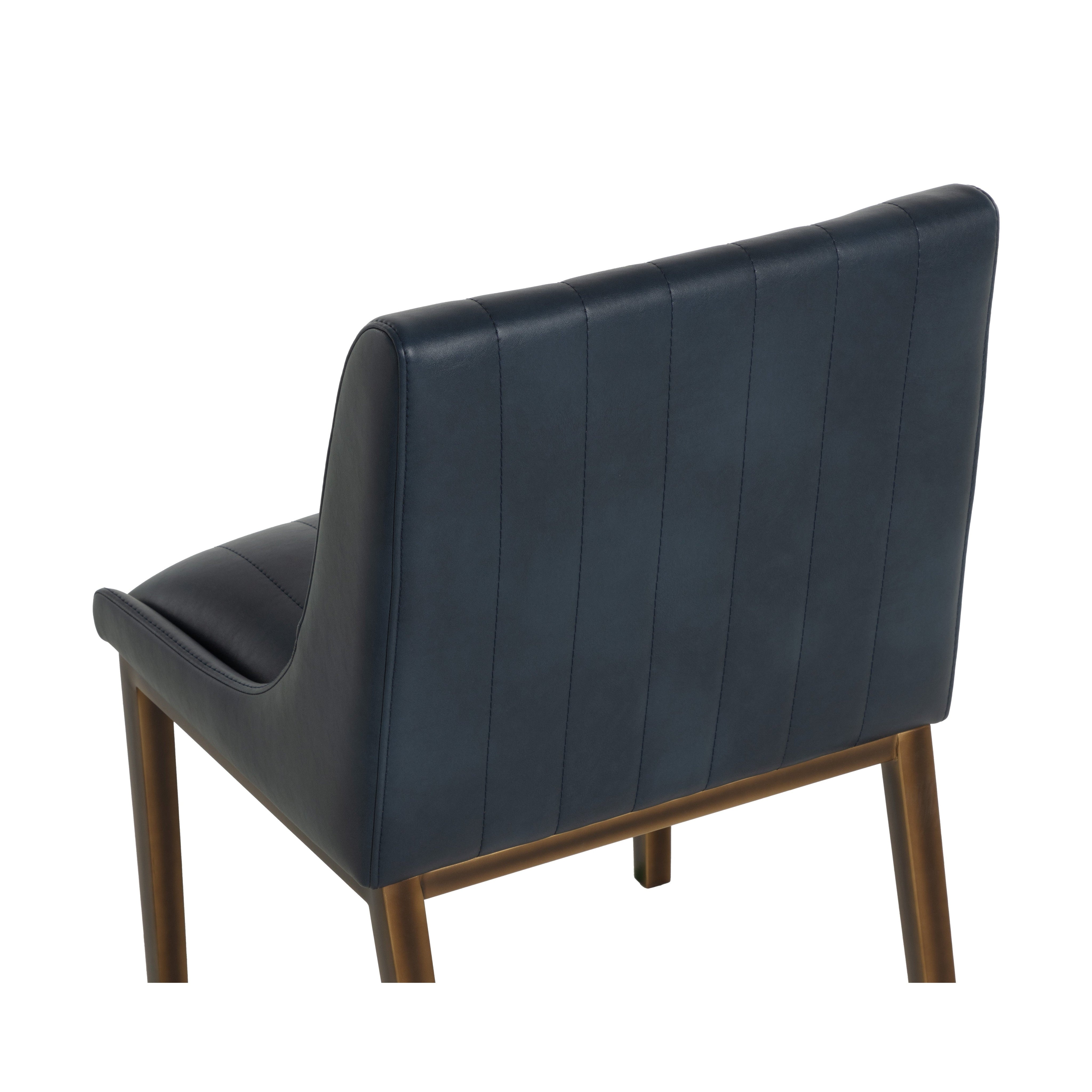 A sleek, urban designed dining chair featuring bold vertical stitching on the seat and back in masculine bravo admiral faux leather. Finished with a rustic bronze steel frame. Place in dining and office spaces for a retro look.