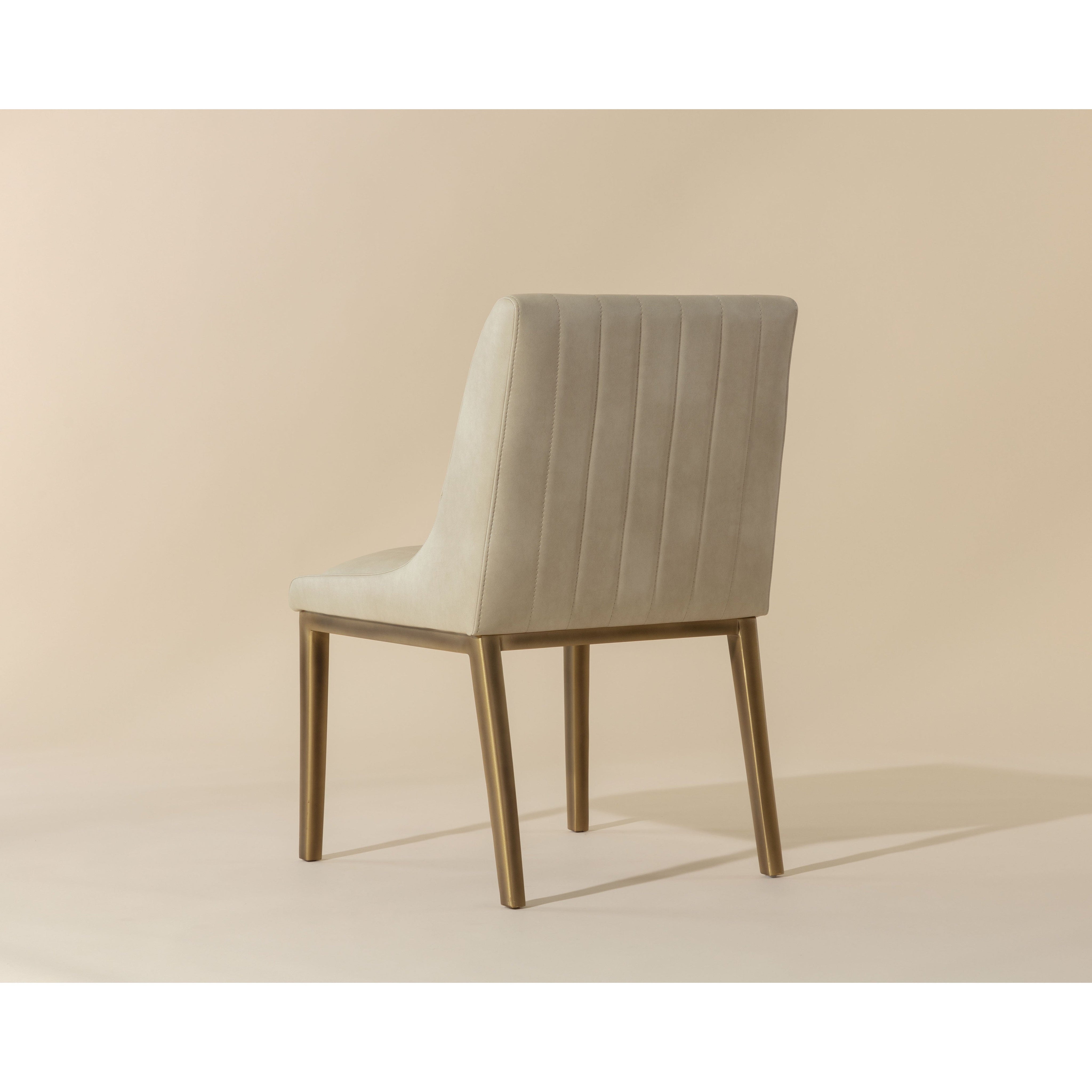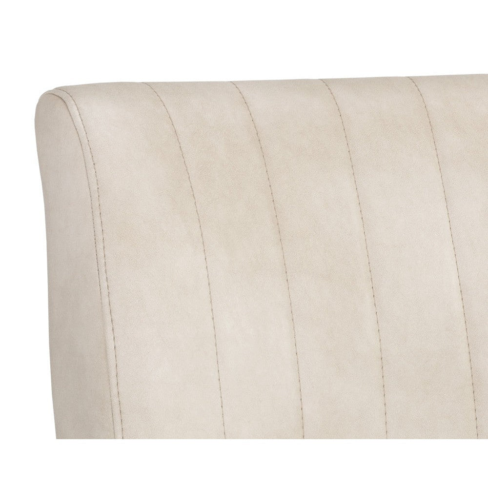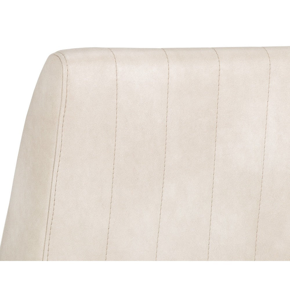 A sleek, urban designed dining chair featuring bold vertical stitching on the seat and back in bravo cream faux leather. Finished with a rustic bronze steel frame. Place in dining and office spaces for a retro look.