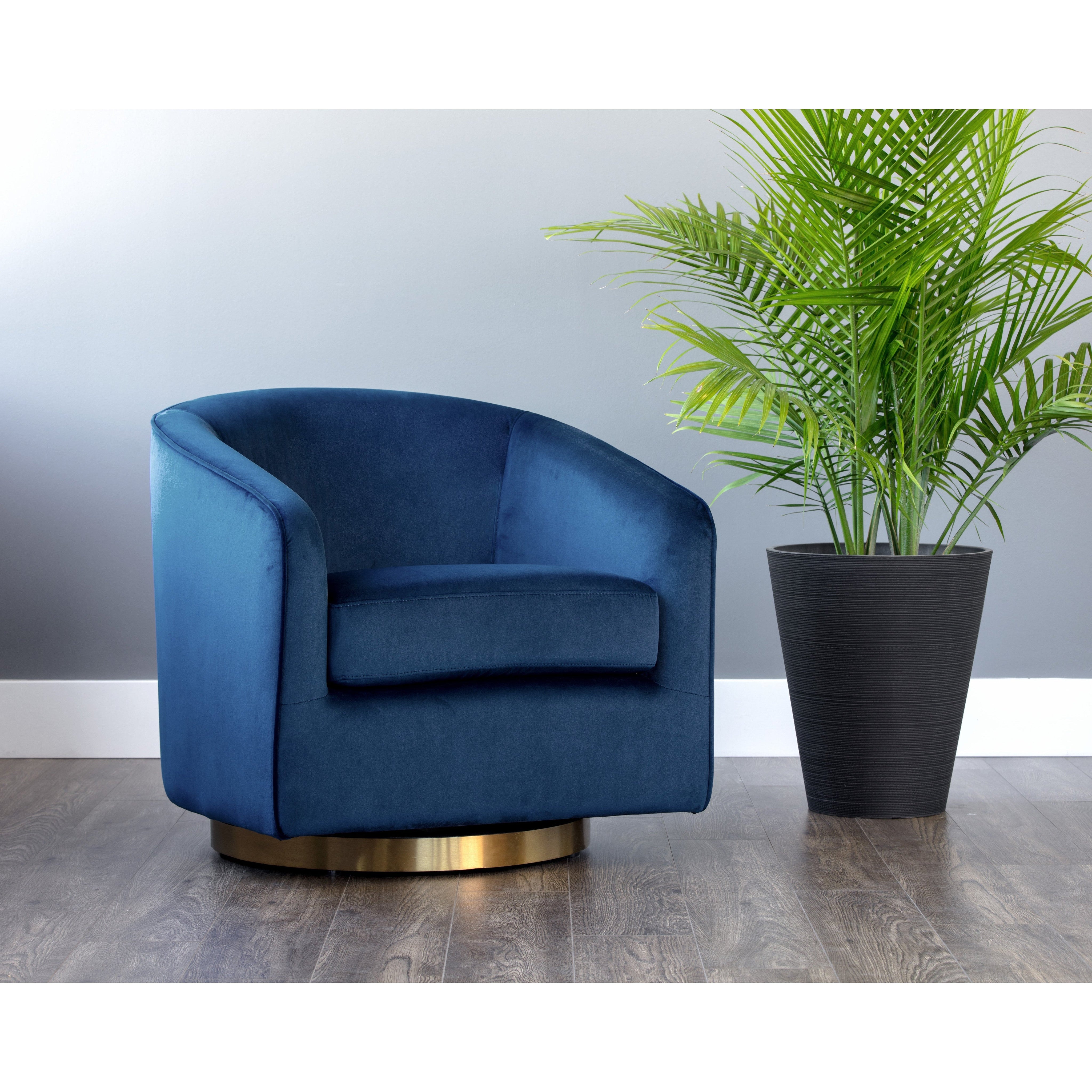 A stylish and comfortable swivel chair perfect for living, lounge and office spaces. Features a barrel back design upholstered in blush, burgundy, deep green, black and navy sky velvet fabric. A brushed antique brass round base with 360 degree swivel completes the design.