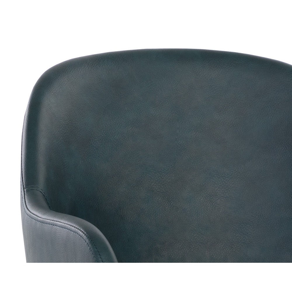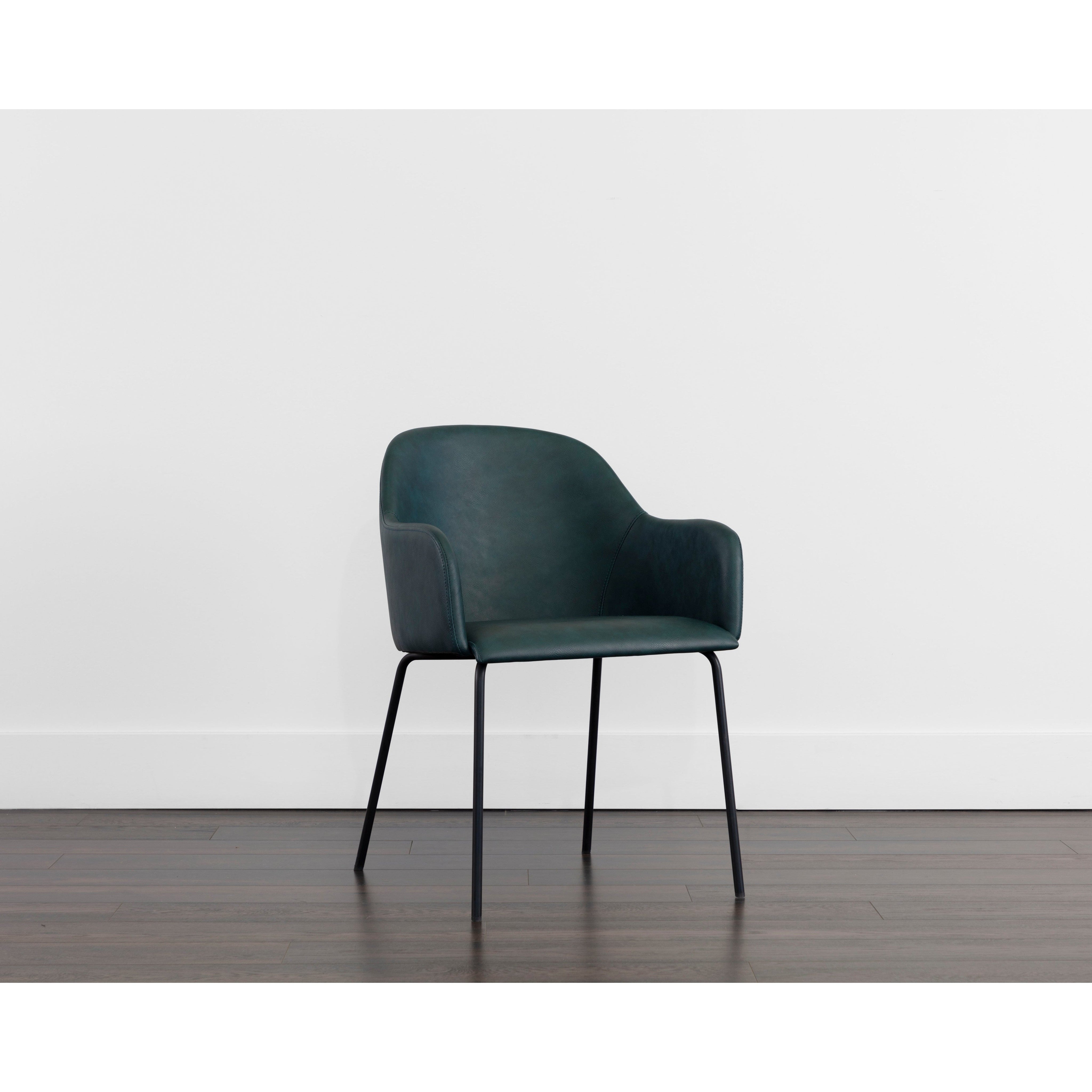 A clean and scompact dining armchair that features a modern and urban style. Stocked in dark teal faux leather and completed with powder-coated metal legs in a matte black finish. Handle With Care: This design has been crafted with faux leather. Faux leather is manufactured to reflect the natural characteristics of leather; as such, colour variations, markings wrinkles, grooves, and light scratches are appreciated characteristics. No two pieces will be alike. Visit our Product Care page for more information on how to ensure the lasting beauty of this piece.