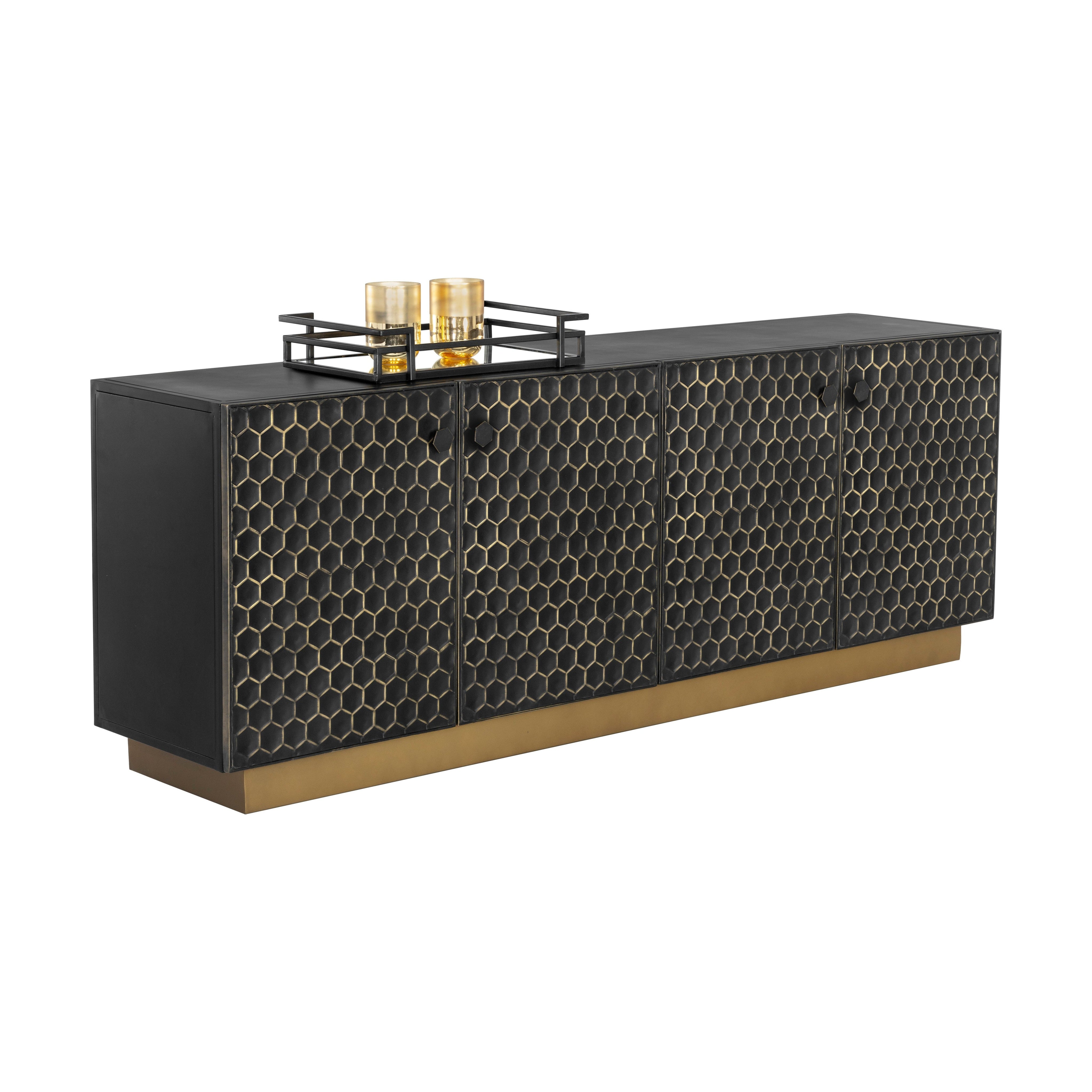 Crafted by local artisans, this bold sideboard features an eye-catching honeycomb pattern. The black iron cabinets are hand painted in a brass finish with varying pressure and strokes to bring unique dimension to each piece. Made in India: With refined craftsmanship, this design was brought to life by skilled local artisans. By nature, these materials develop unique imperfections such as fissures, markings and colour variations for a truly one-of-a-kind piece.