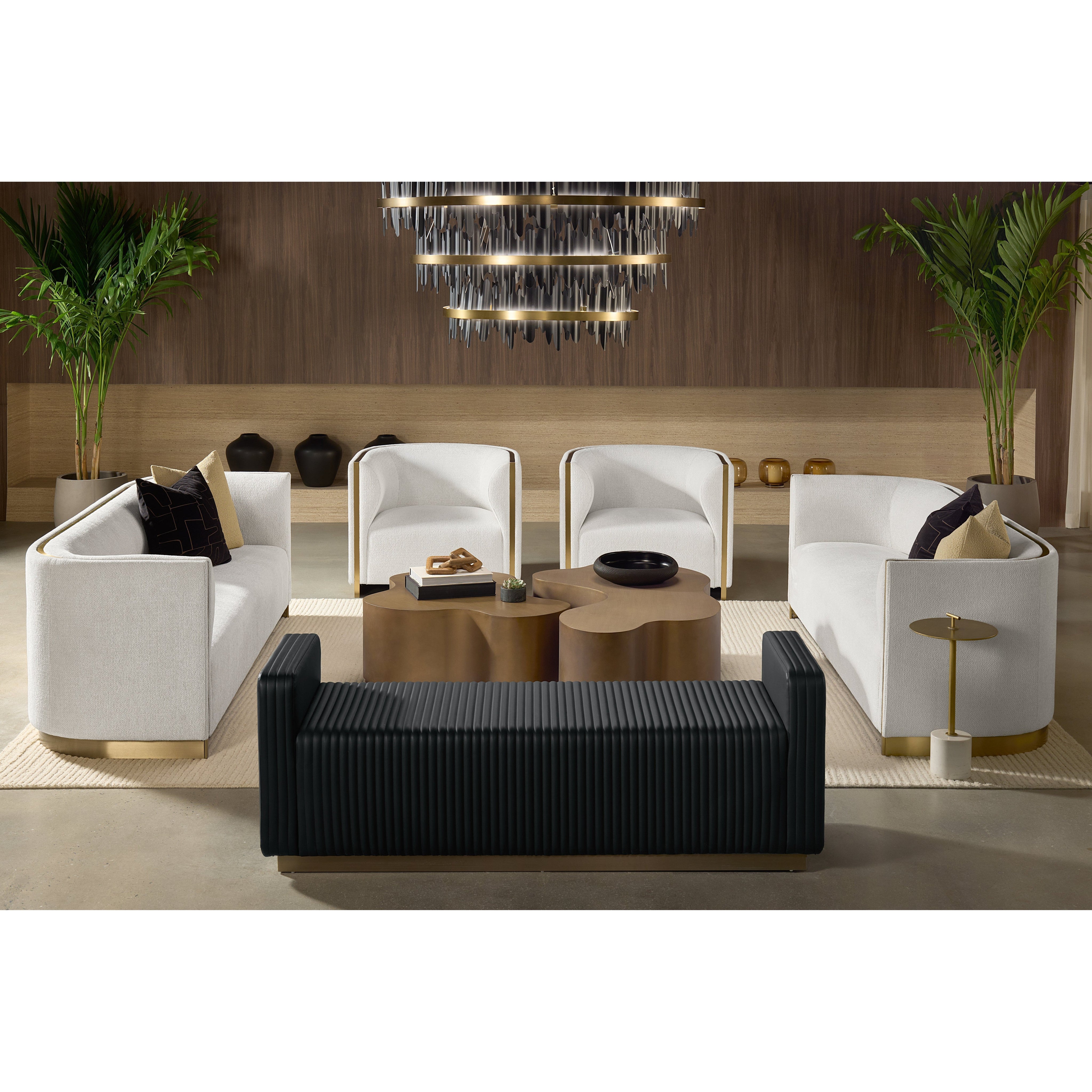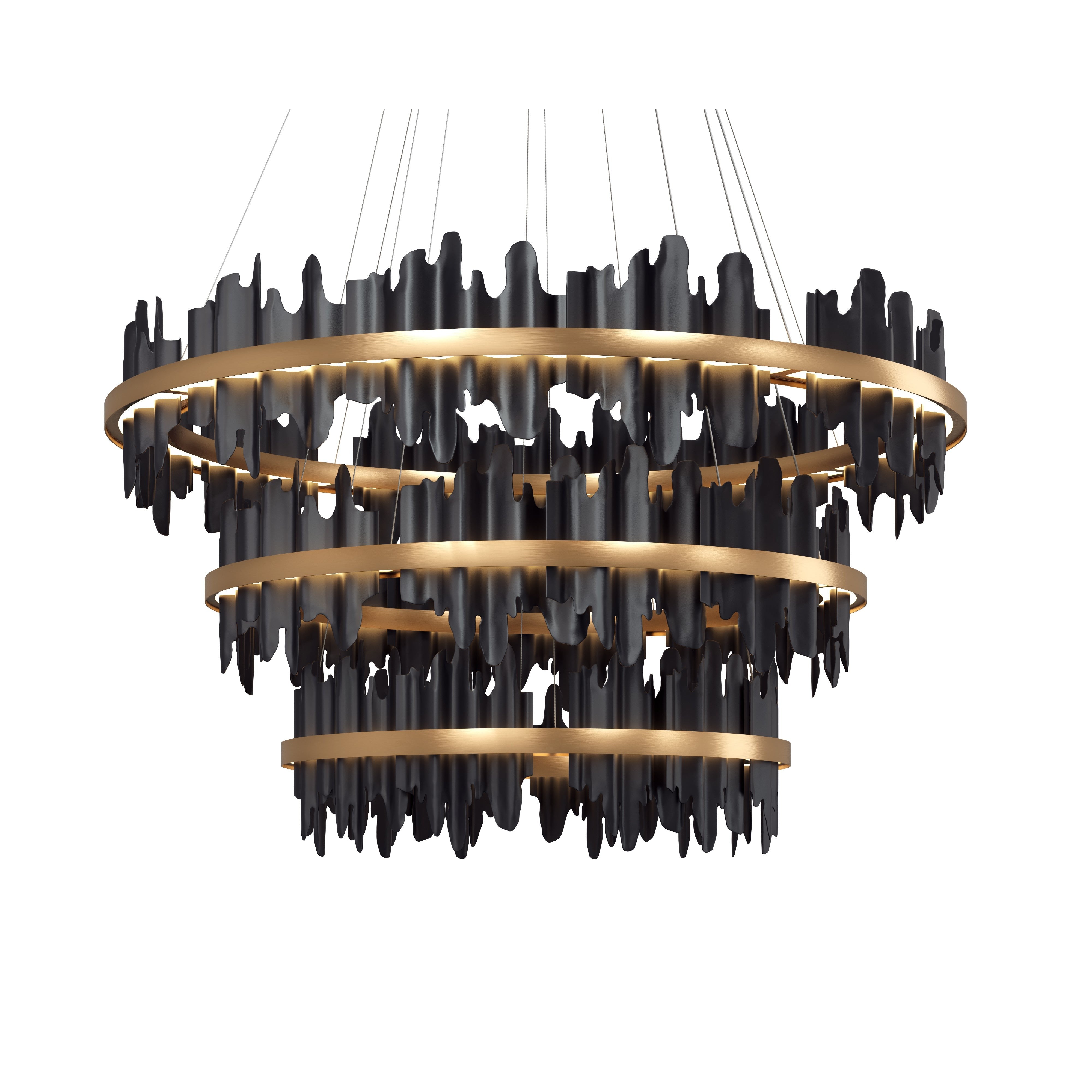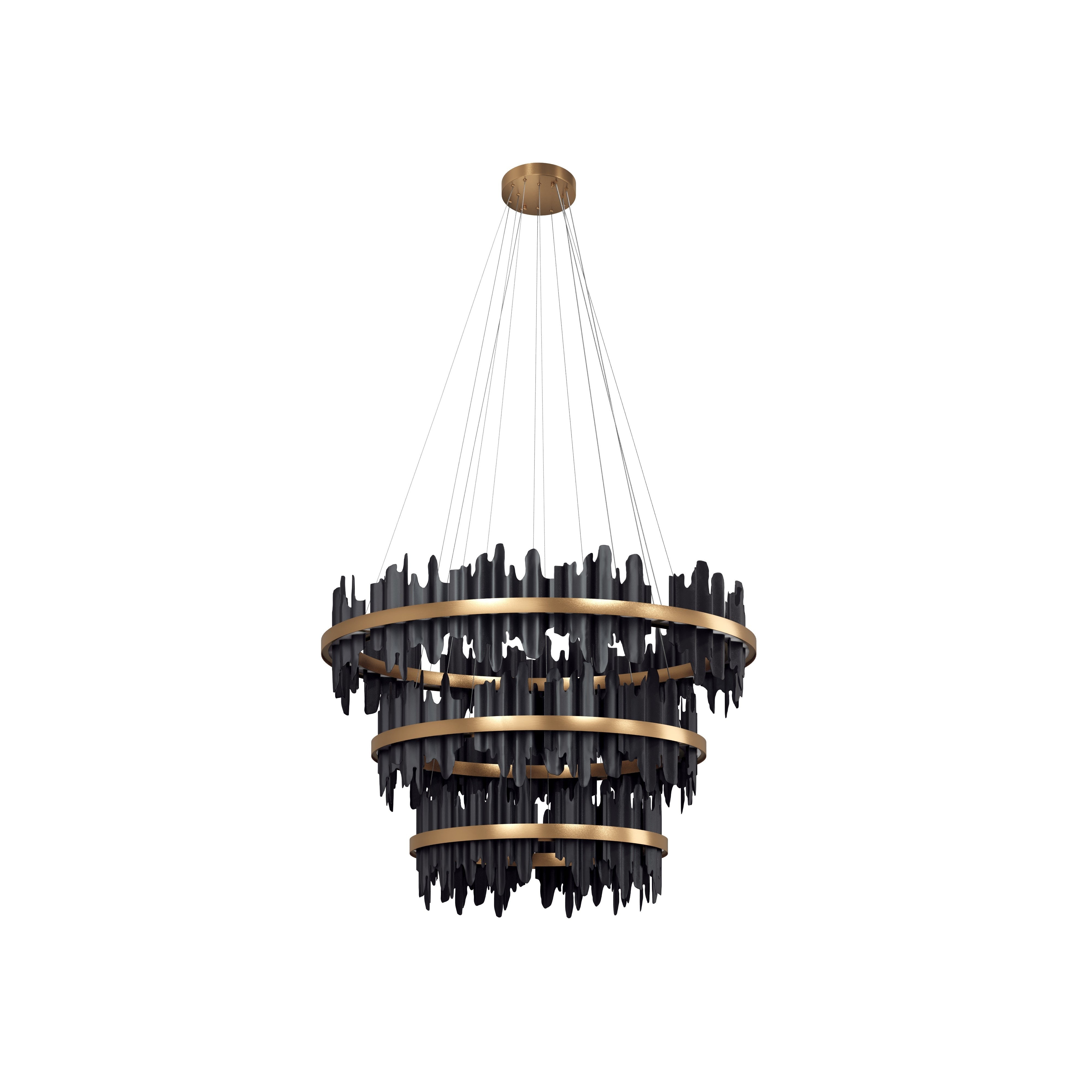 Eye-catching and intriguing, the Icarcus Chandelier brings a moody ambience to any space. Matte black metal pieces are carefully inserted within the brushed gold aluminum bands to give off a striking presence.