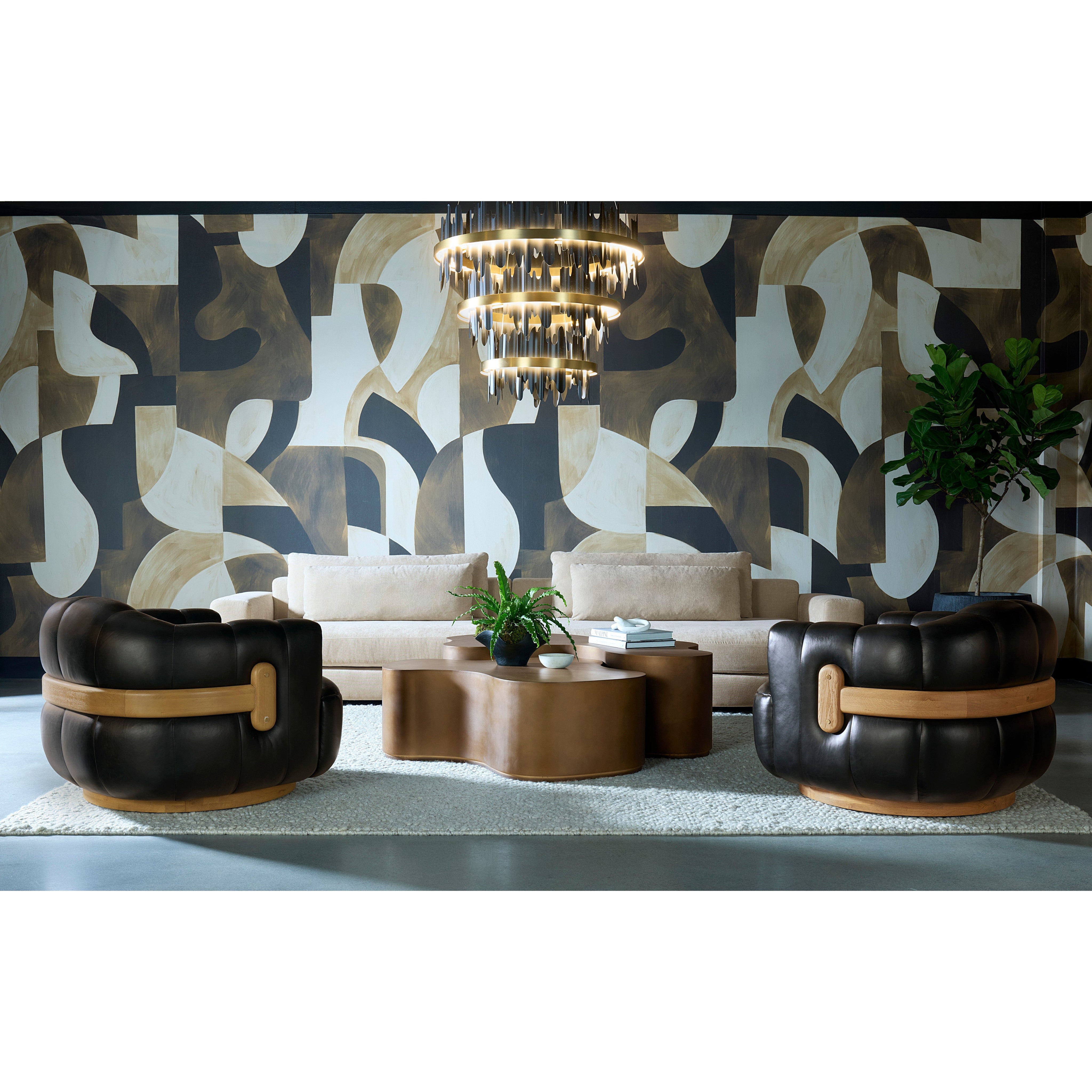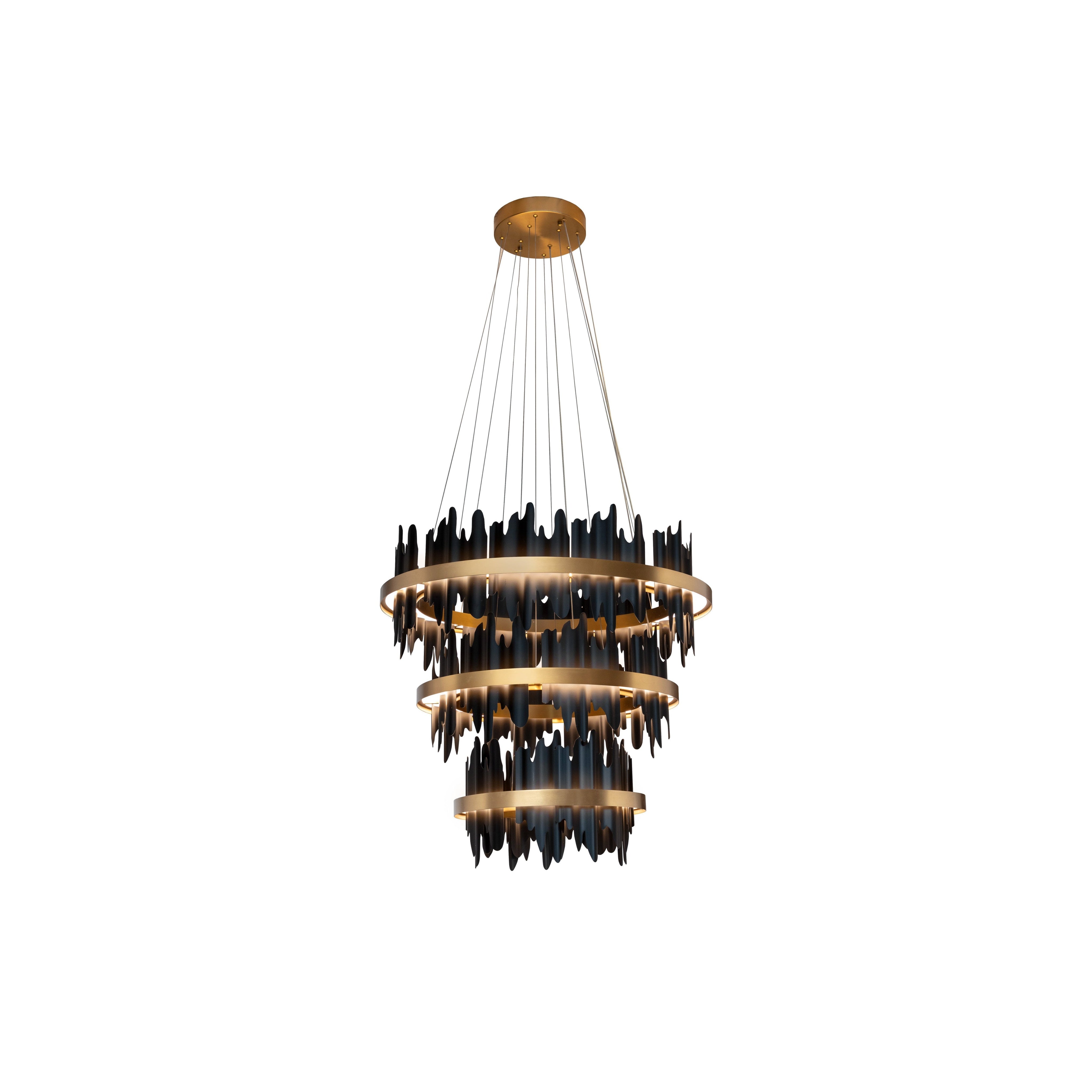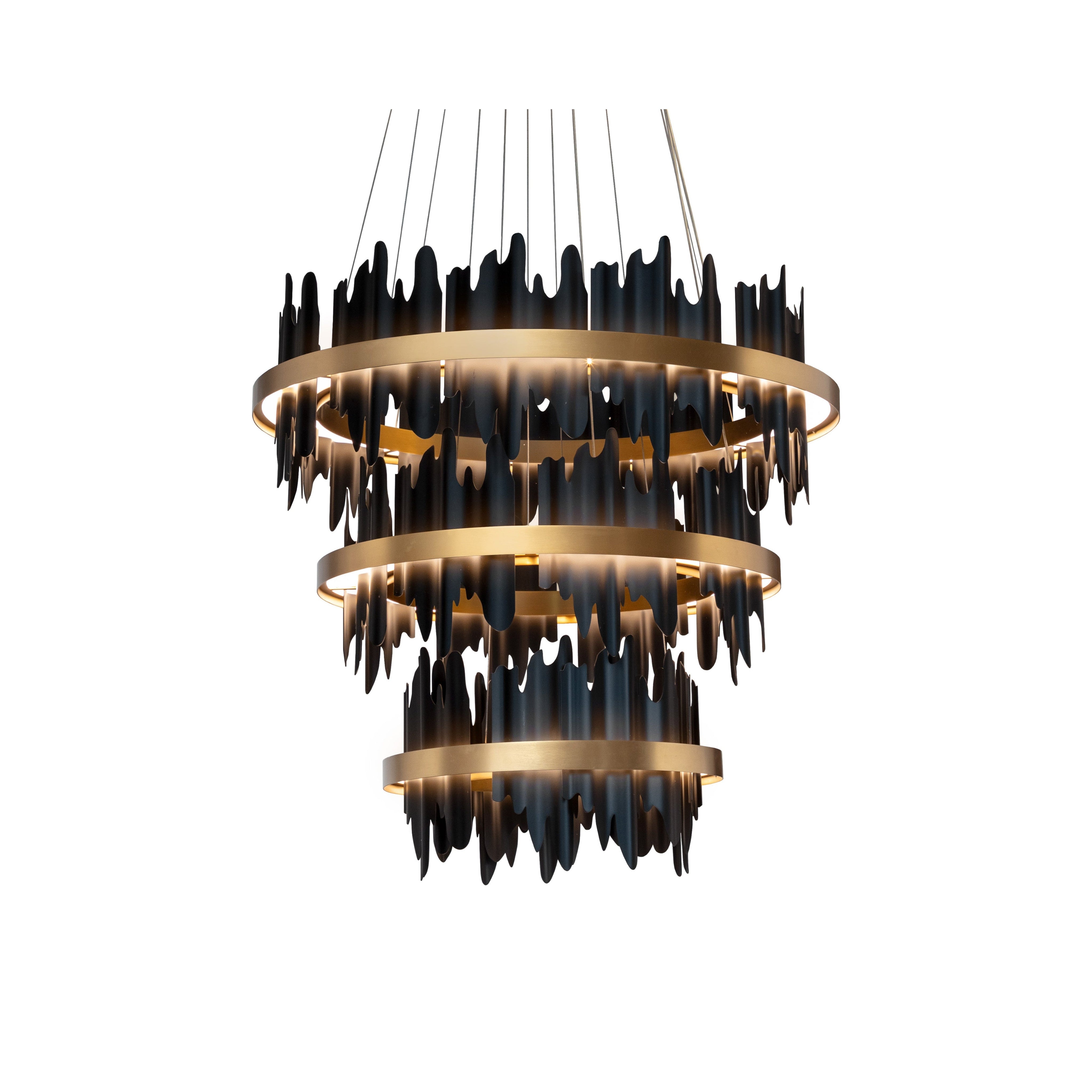 Eye-catching and intriguing, the Icarcus Chandelier brings a moody ambiance to any space. Matte black metal pieces are carefully inserted within the brushed gold aluminum bands to give off a striking presence.