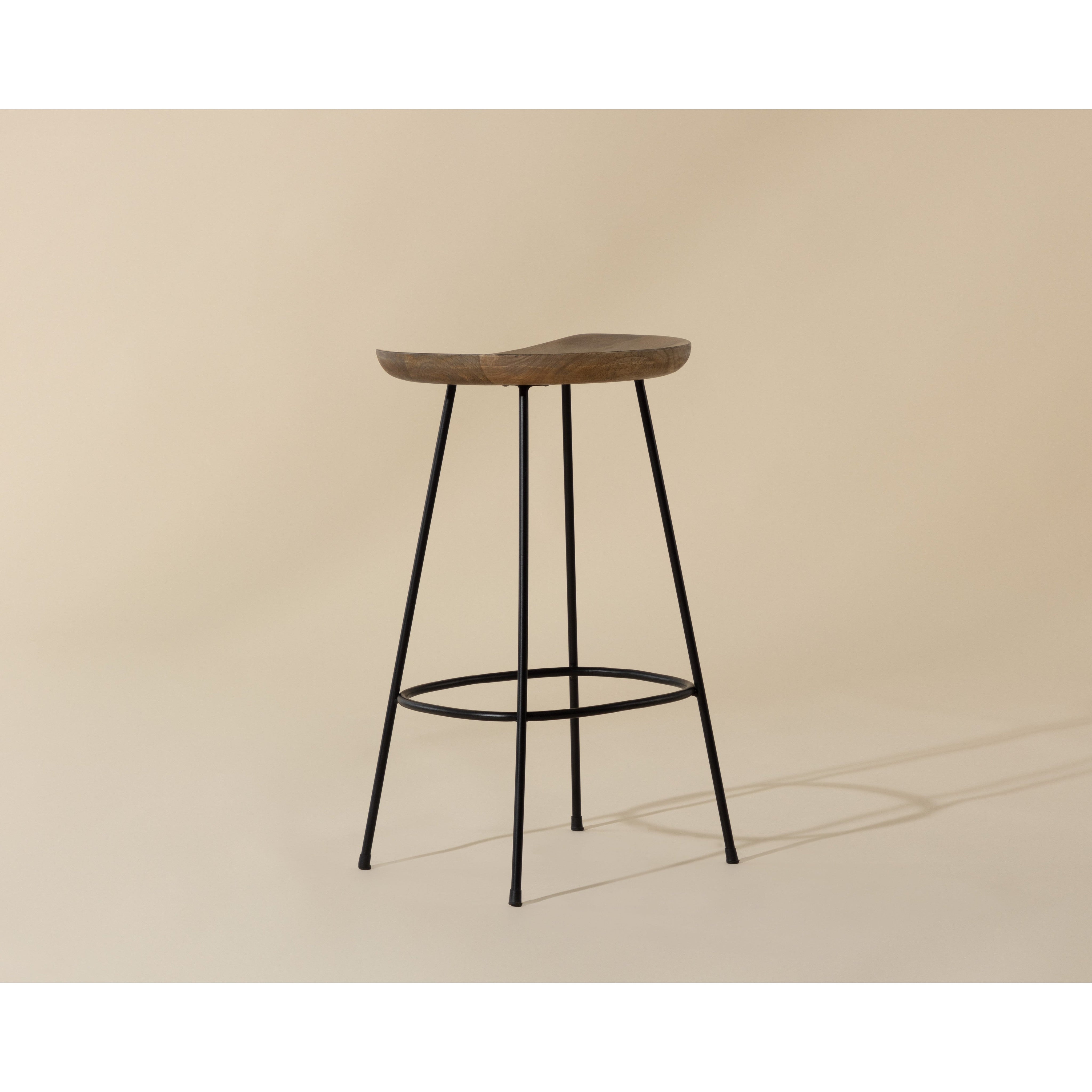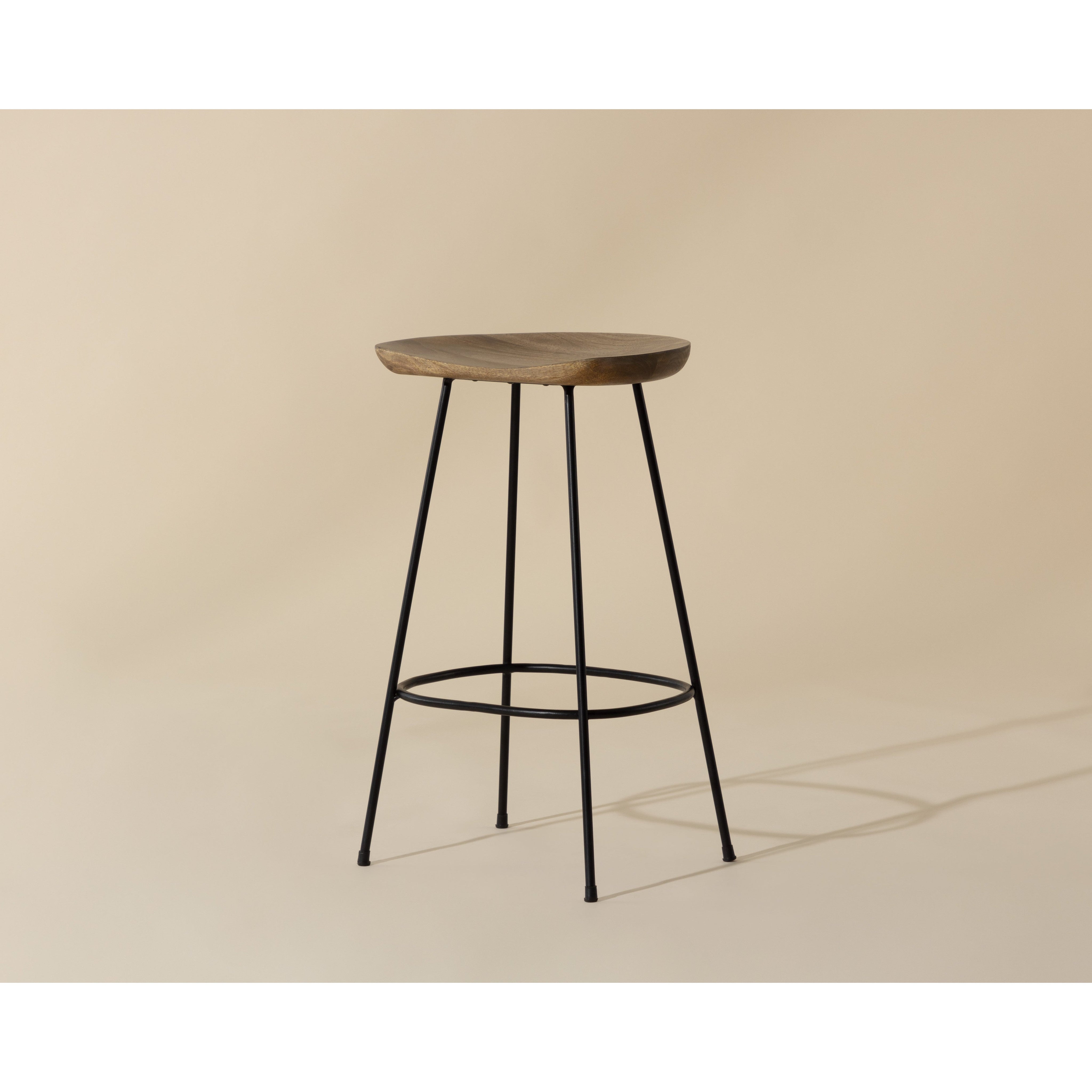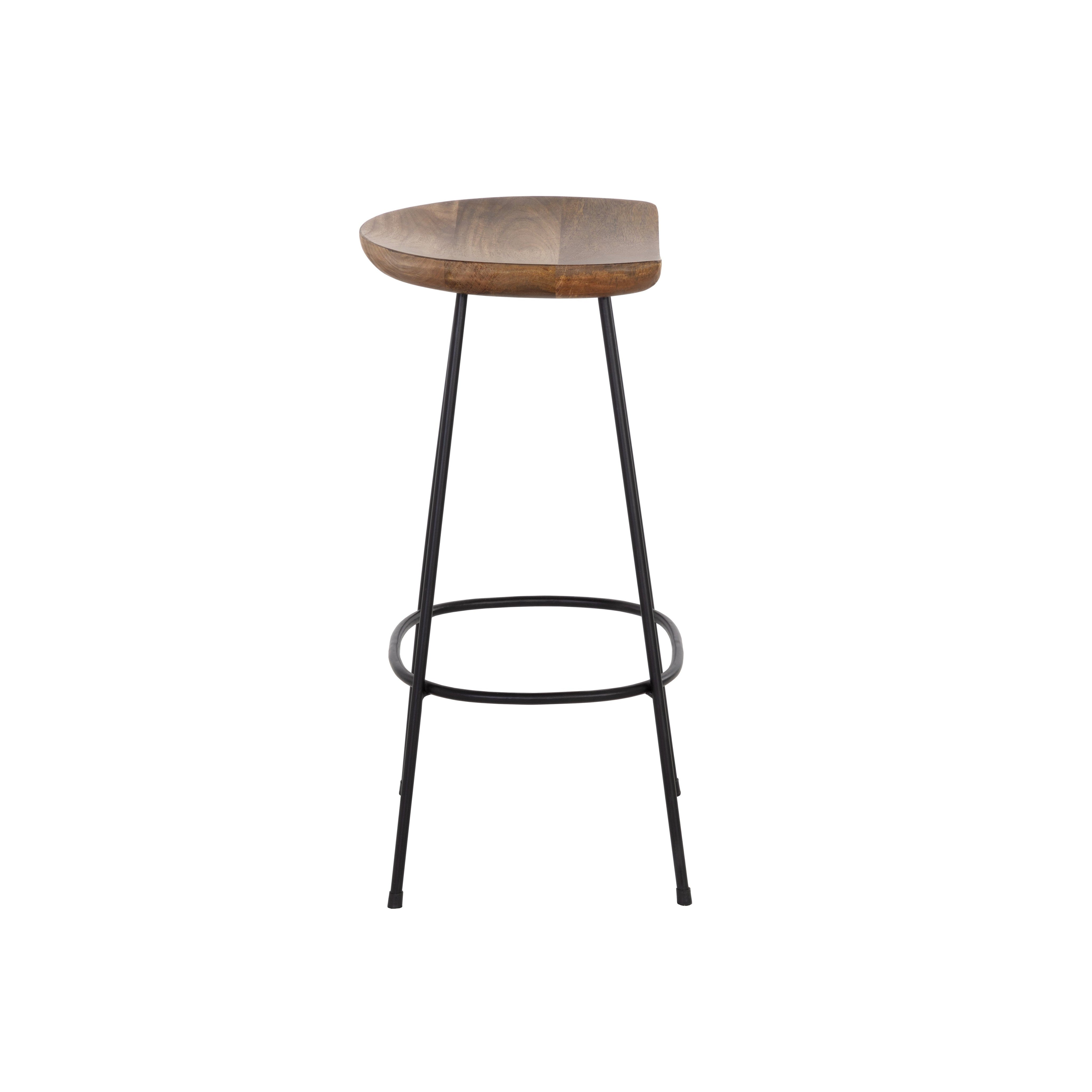 With a toned down coastal design, this counter stool illustrates the beauty of simplicity. Crafted with a brown solid mango wood seat and completed with a black iron frame. Made in India. With refined craftsmanship, this design was brought to life by skilled local artisans. By nature, these materials develop unique imperfections such as fissures, markings and colour variations for a truly one-of-a-kind piece. As wood is an organic, porous material, these pieces will contain natural variation of texture and may also exhibit fine indentations and cracks. Wood pieces will also display a disparity of colour and grain, and visible knots and burls that add to the character of each piece.