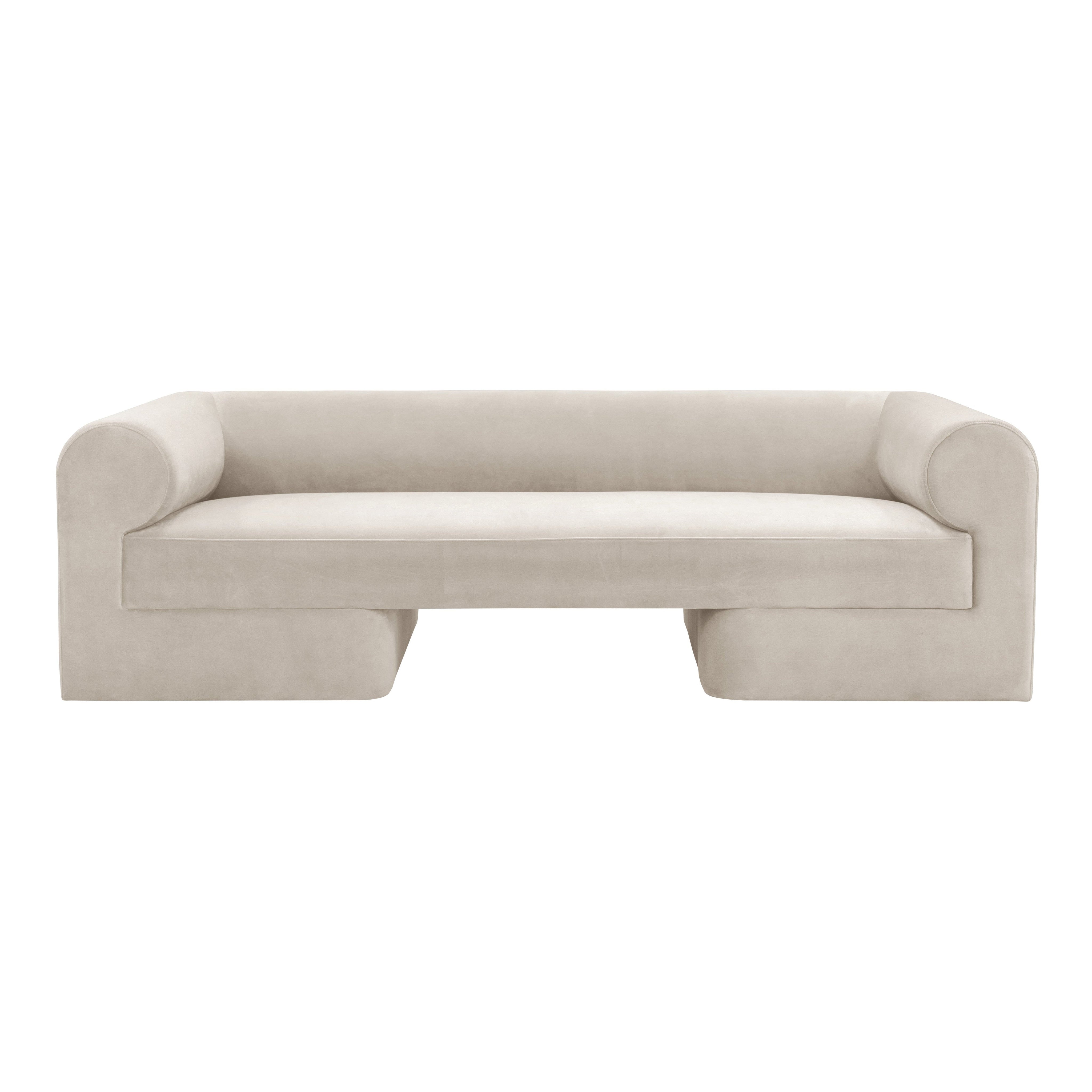 A bold take on contemporary style, this sofa will stand out in any space. Features rounded back and arm rests for ultimate comfort. Fully upholstered in luxurious meg taupe and gold fabrics. Pair with coordinating armchair to complete the look.