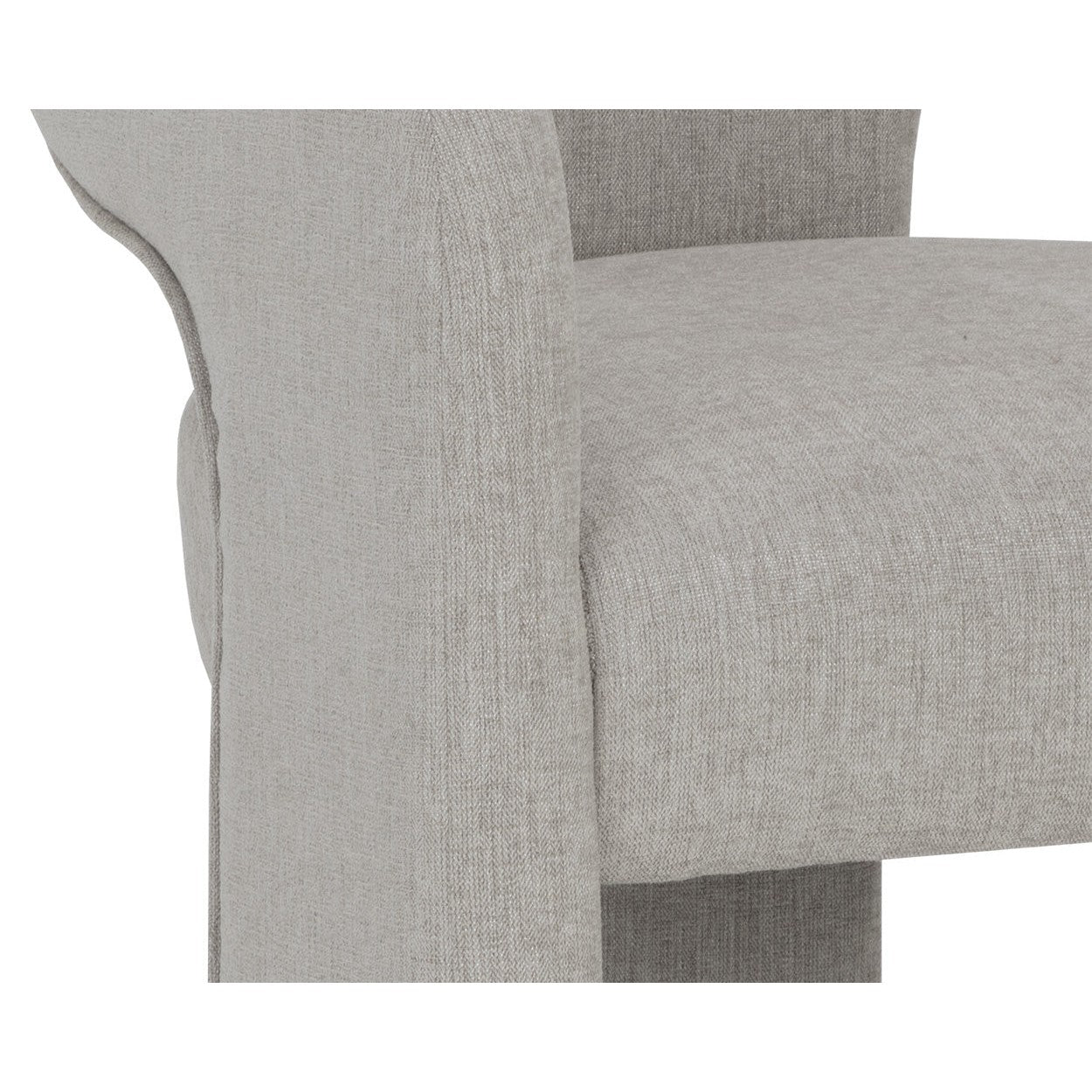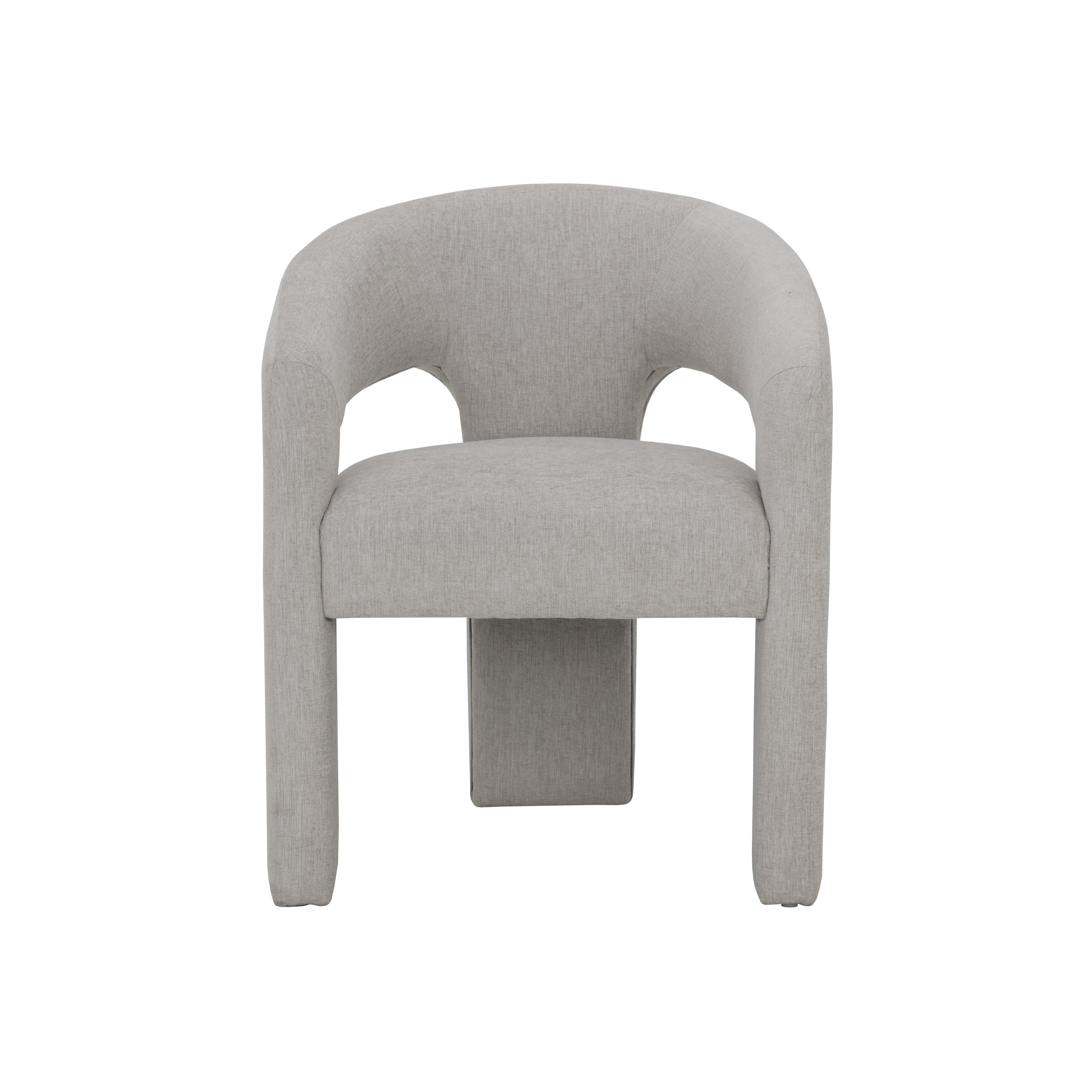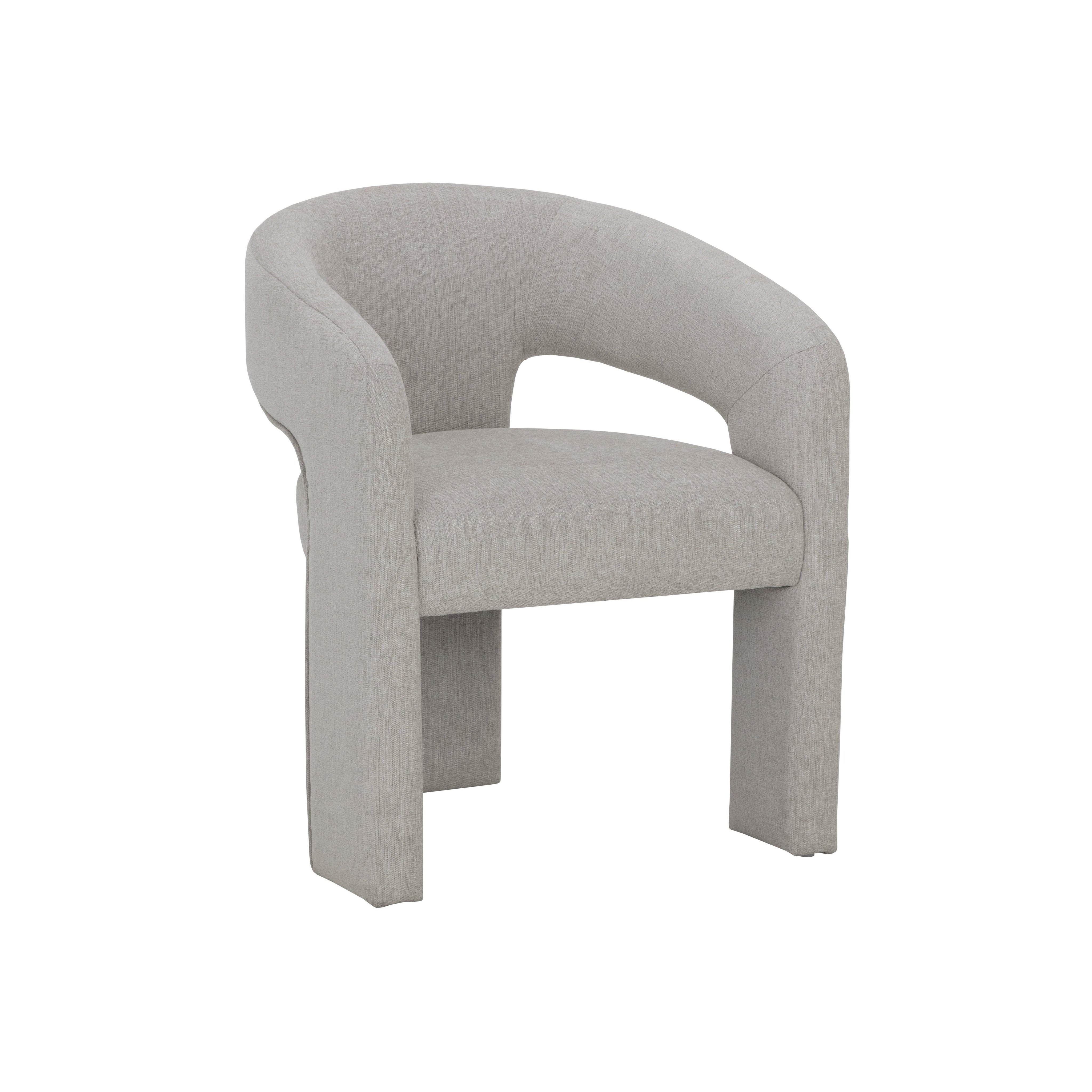 Clean lines and contoured arches add style and structure to this contemporary dining chair. Features a curved backrest and open back for optimal comfort. Eye-catching from all angles. Fully upholstered in ernst sandstone fabric.