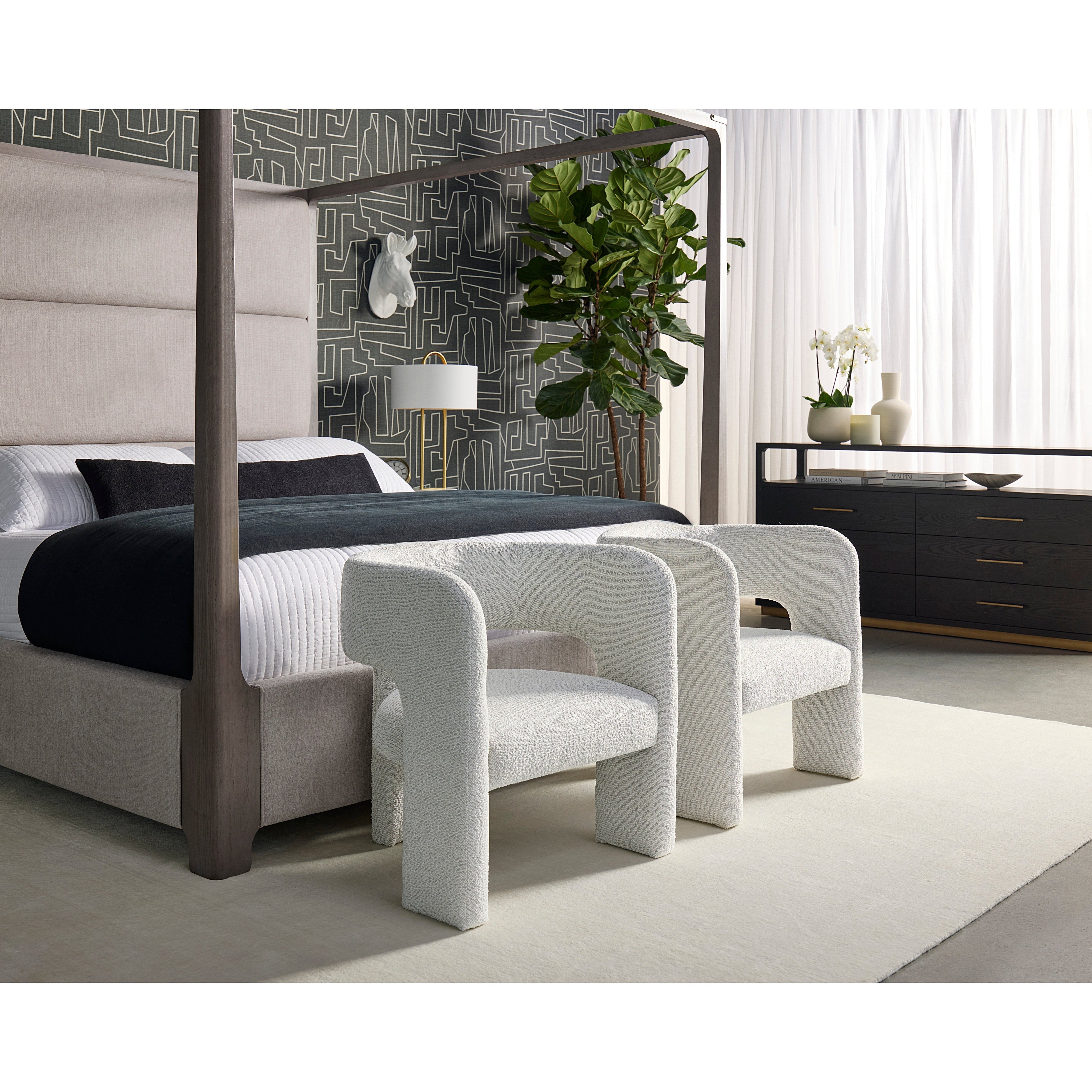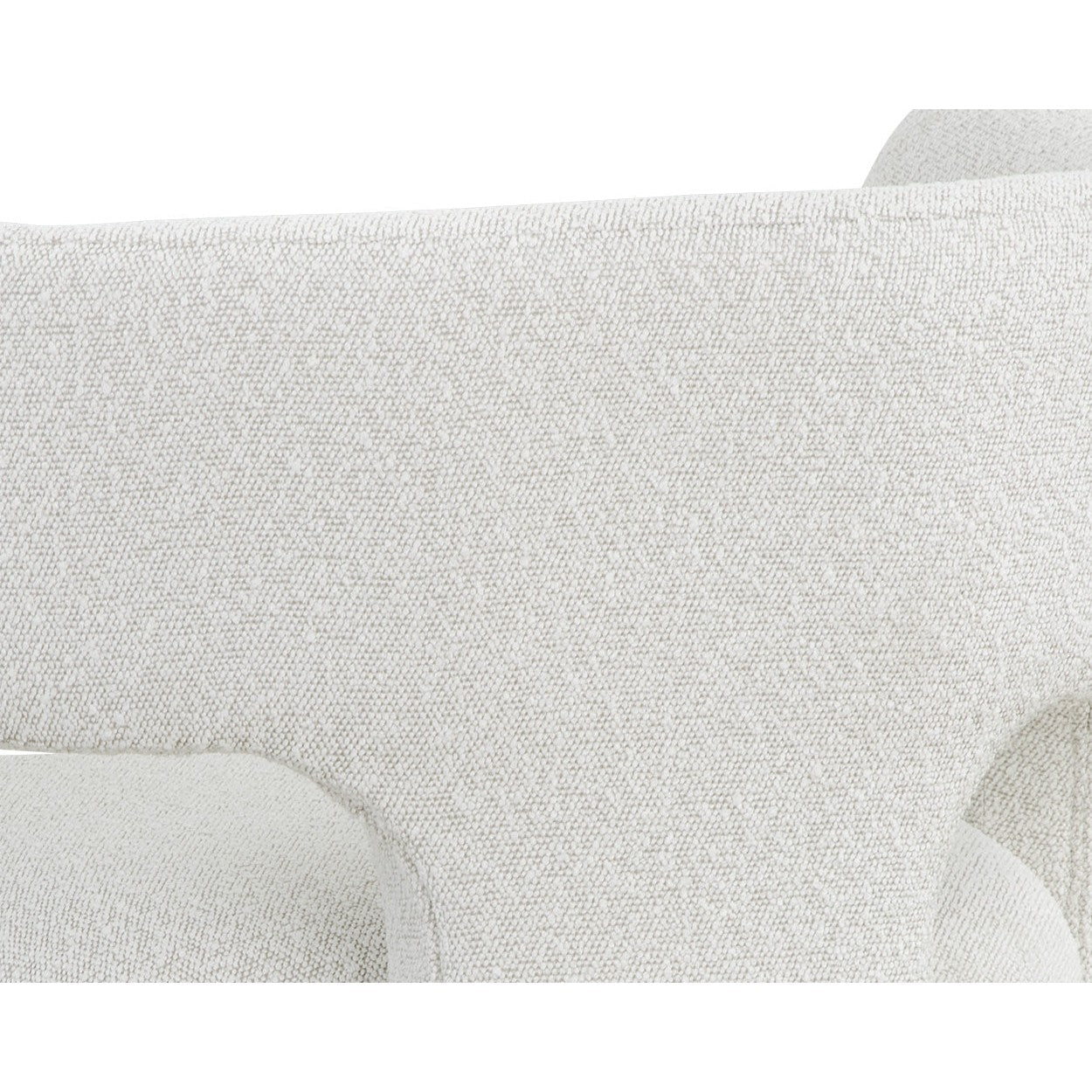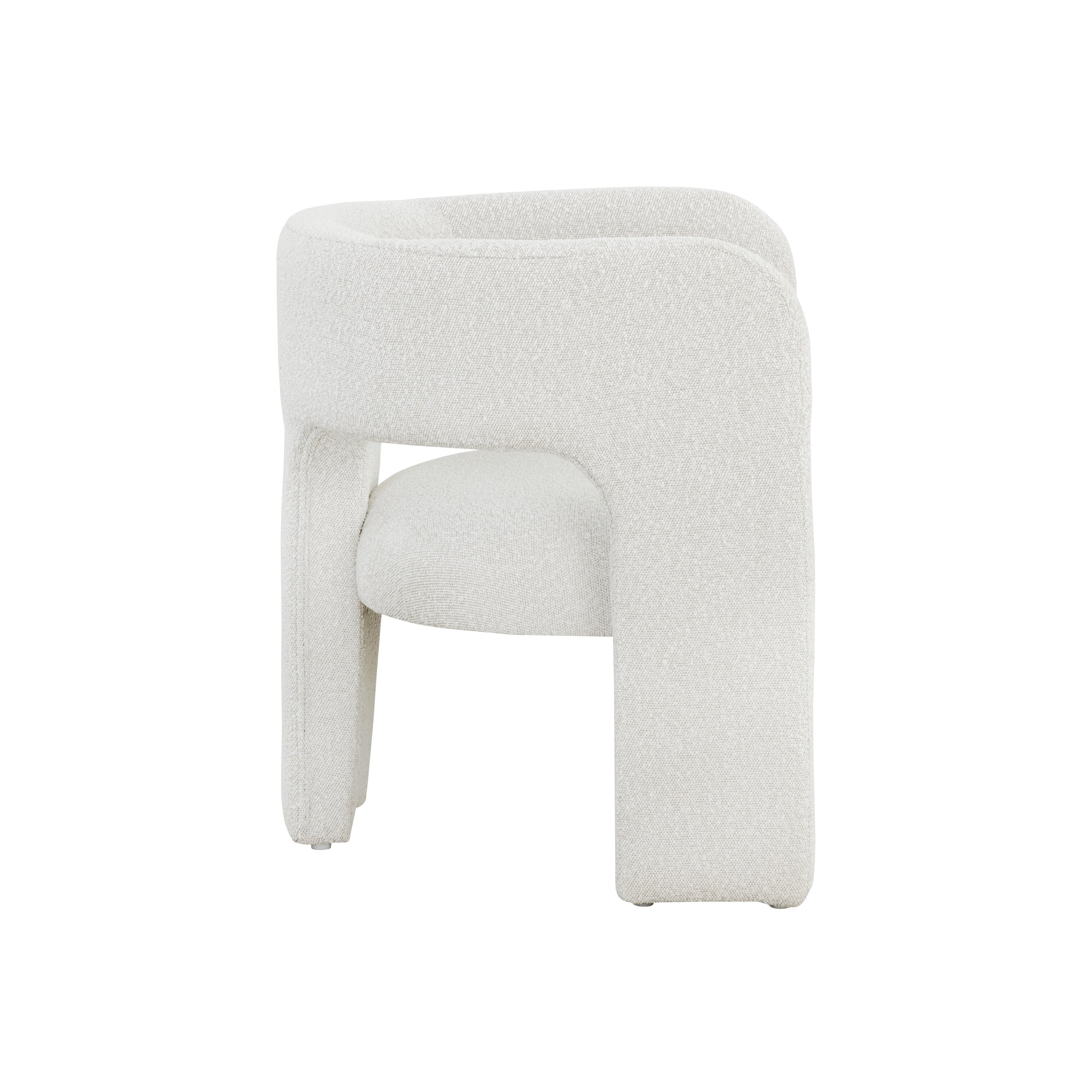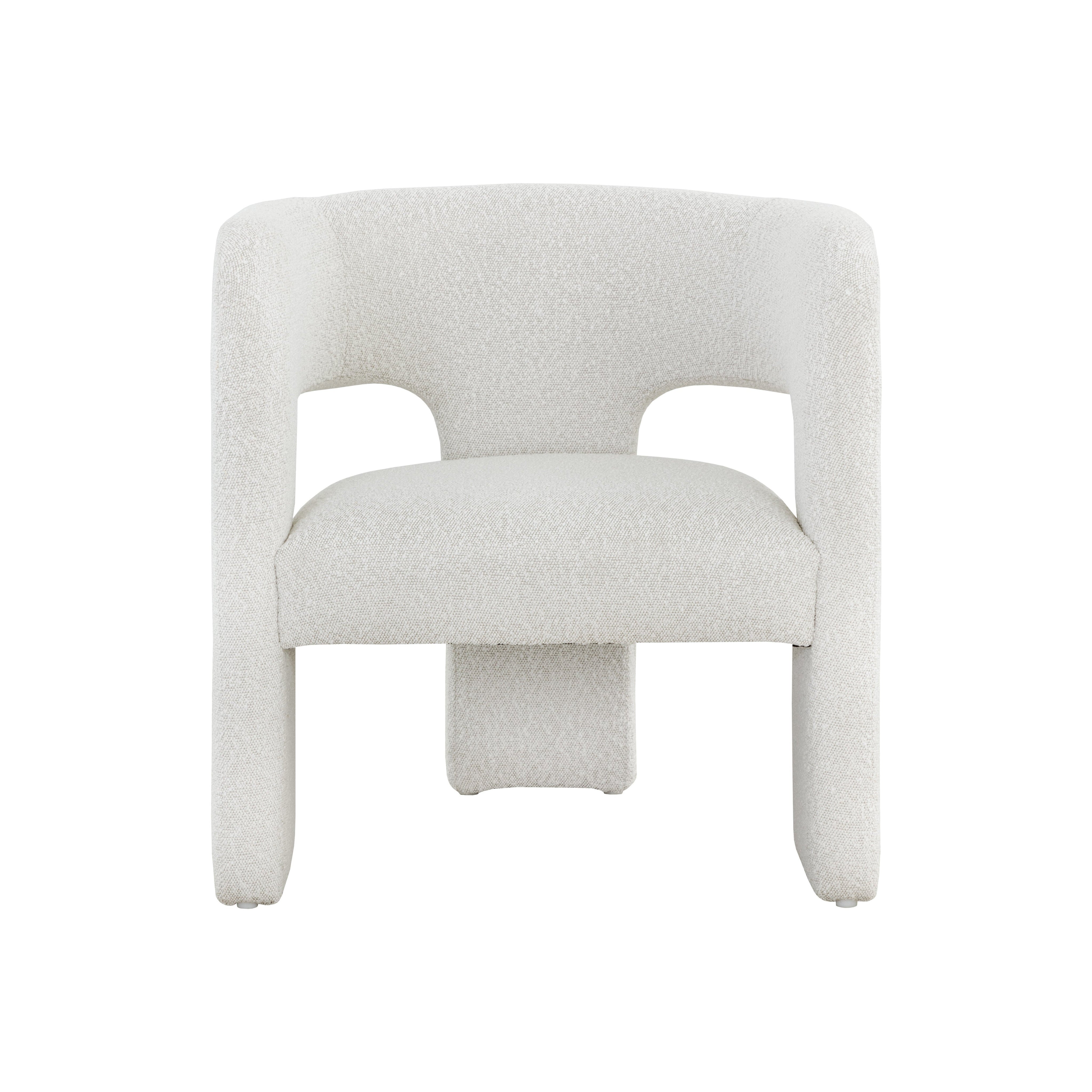 Clean lines and contoured arches add style and structure to this contemporary lounge chair. Features a curved backrest and open back for optimal comfort. Eye-catching from all angles. Fully upholstered in copenhagen white boucle fabric.