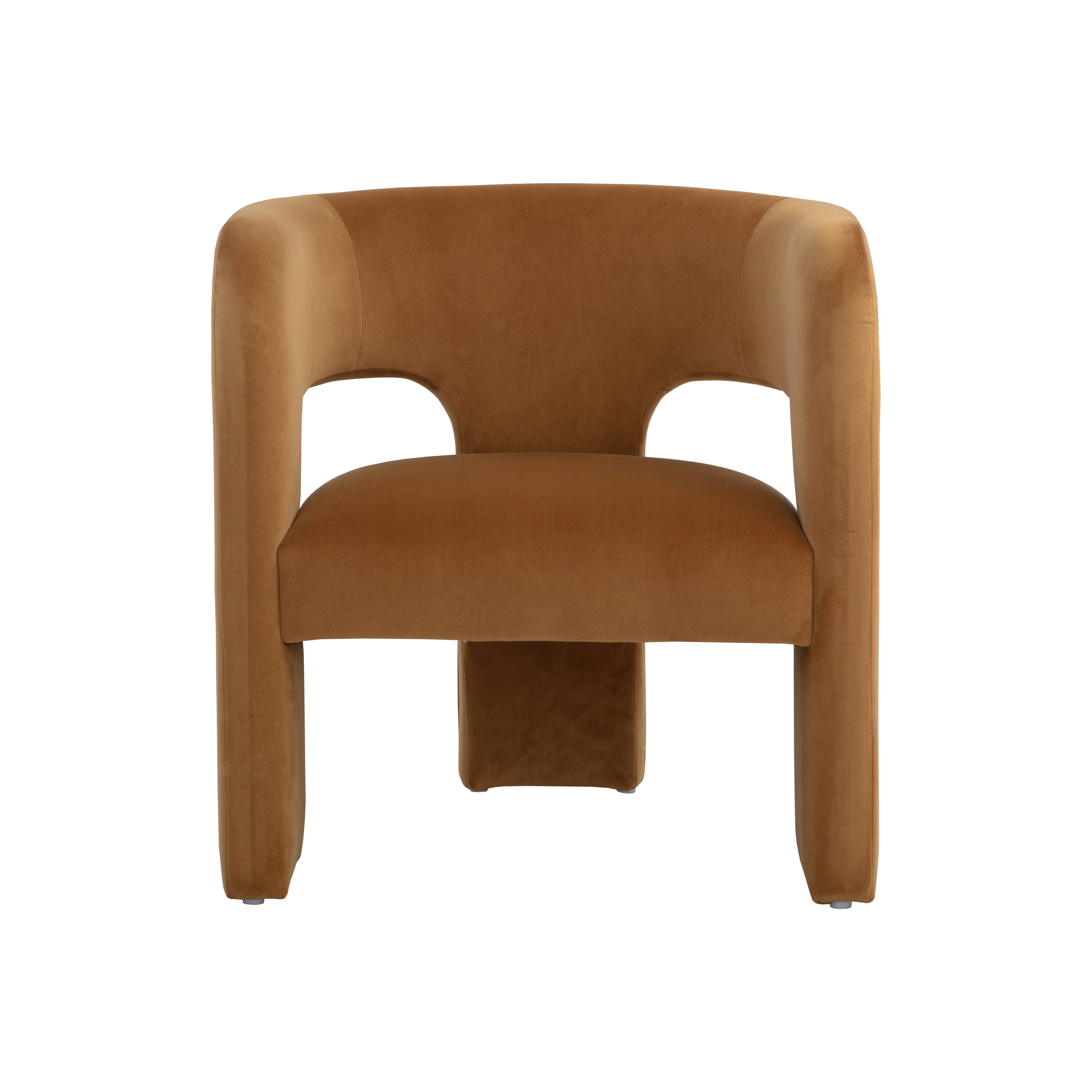Clean lines and contoured arches add style and structure to this contemporary lounge chair. Features a curved backrest and open back for optimal comfort. Eye-catching from all angles. Fully upholstered in meg gold fabric.