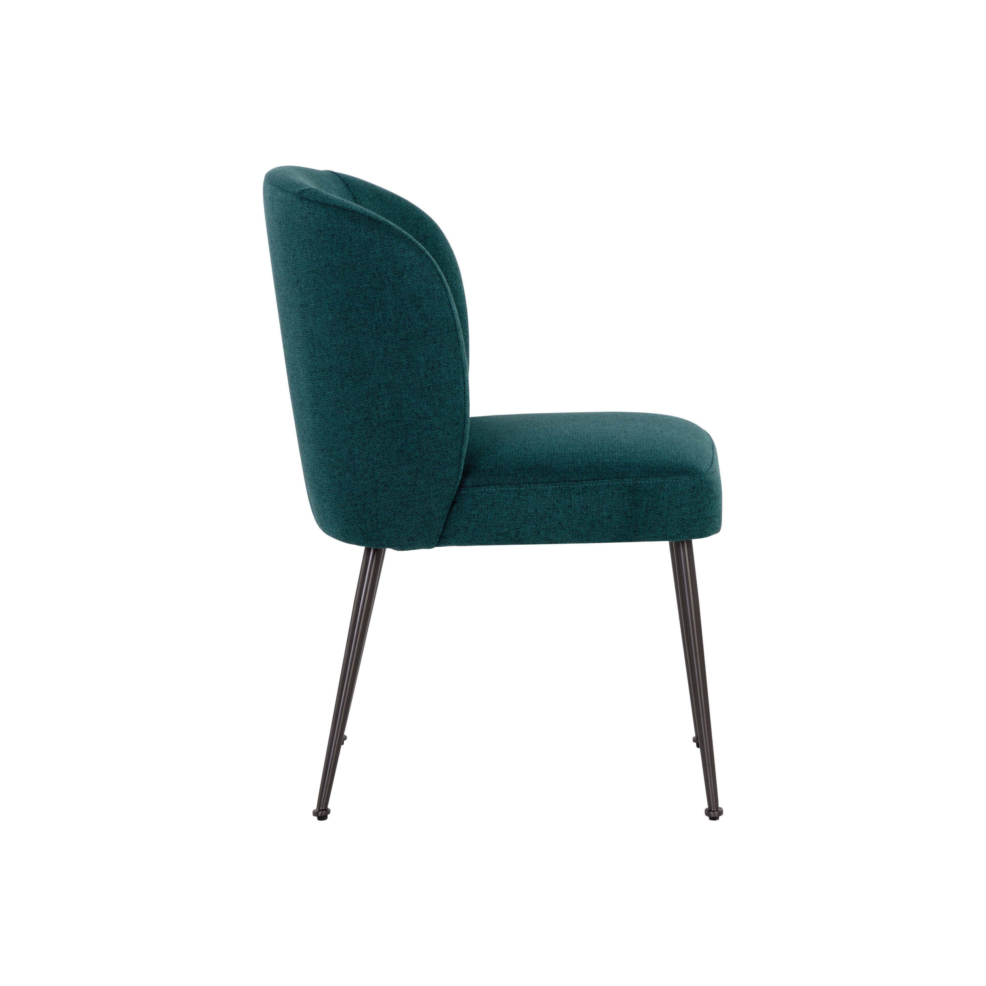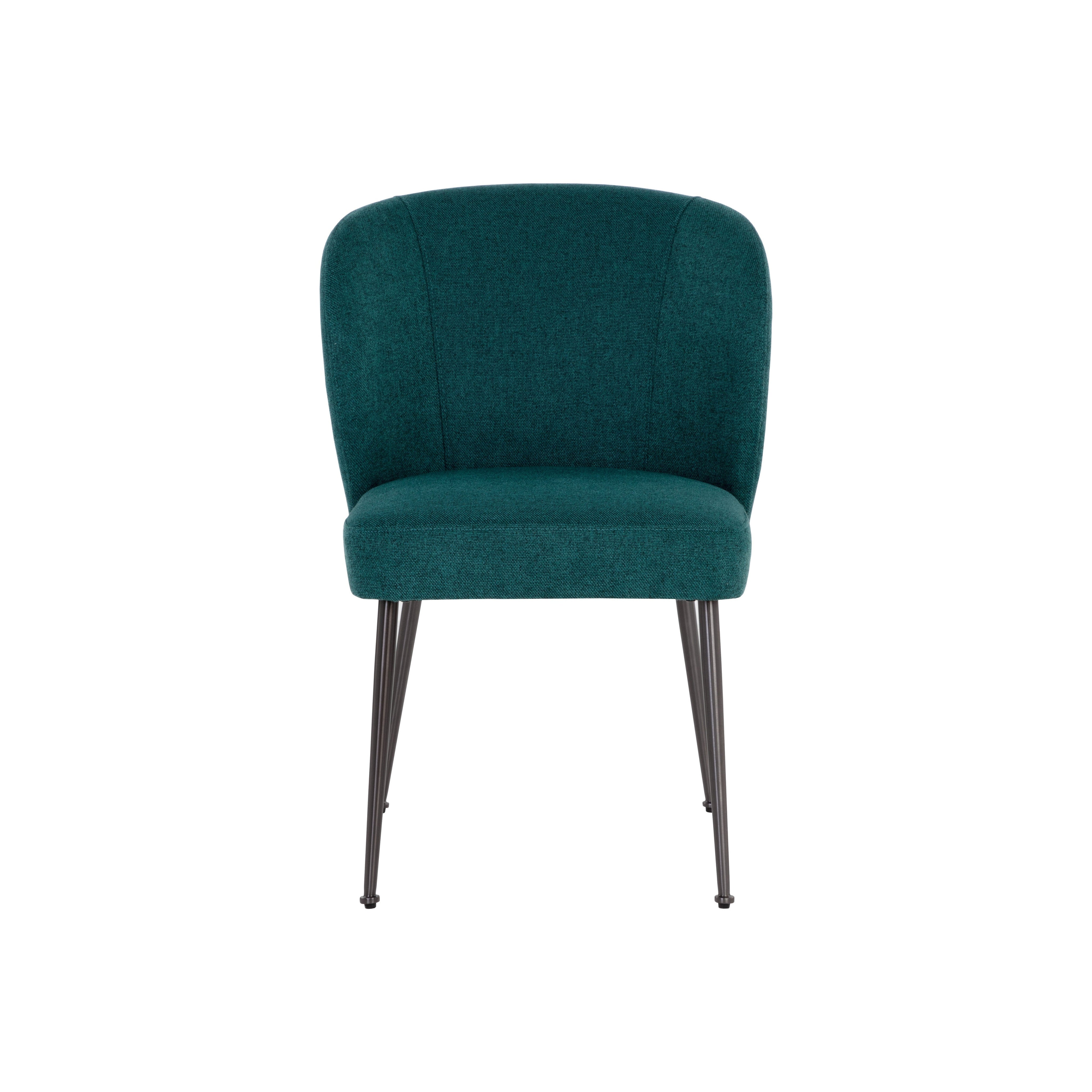 Smooth curves add allure to this effortlessly stylish modern dining chair. Stocked in soho teal fabric with stainless steel legs in a gunmetal base finish.
