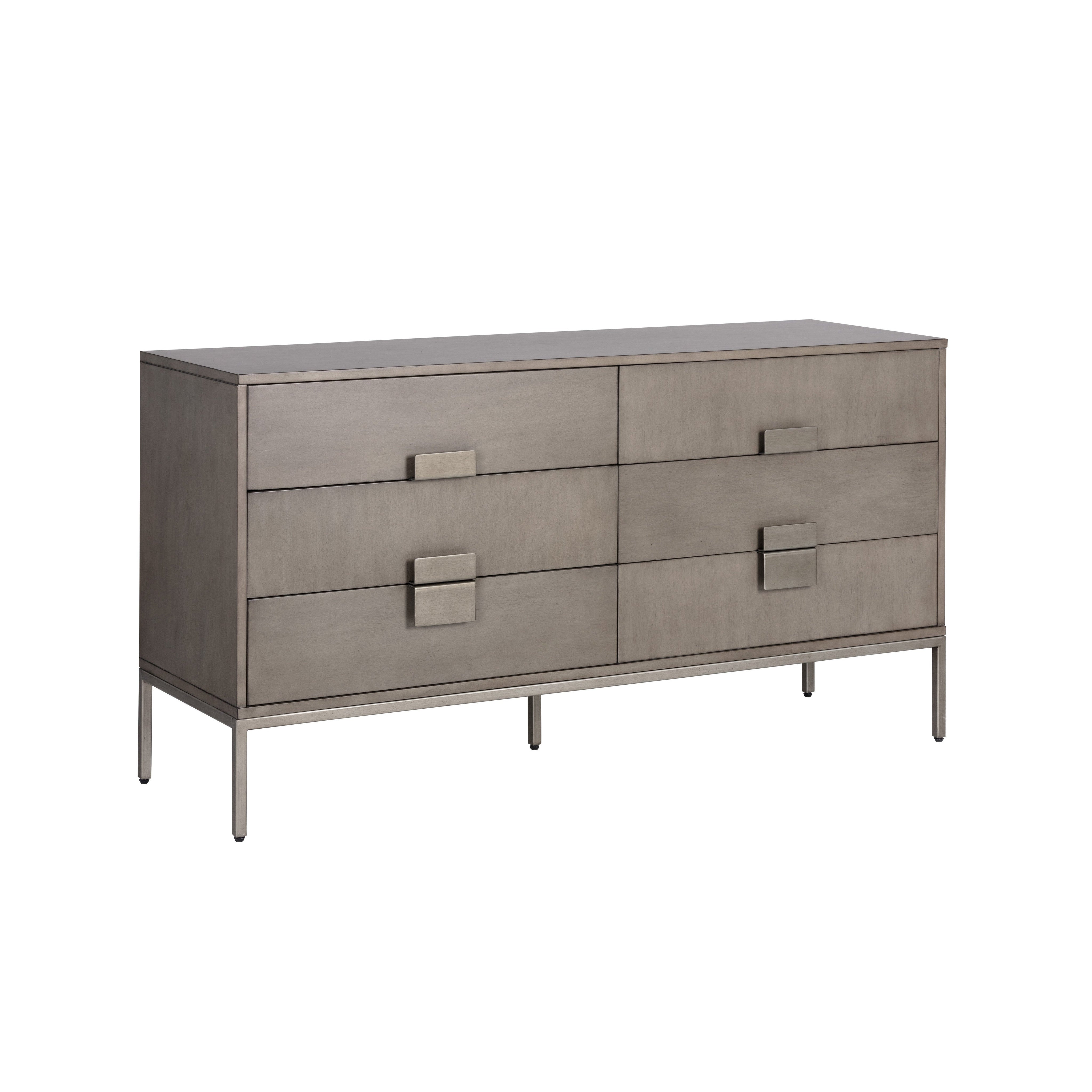 This uniquely crafted dresser will add transitional allure to any bedroom. Made from ash grey acacia wood veneer with six drawers for ample storage. Contrasting wood grain patterns on the drawer fronts and antique silver hardware complete the look. As wood is an organic, porous material, these pieces will contain natural variation of texture and may also exhibit fine indentations and cracks. Wood pieces will also display a disparity of colour and grain, and visible knots and burls that add to the character of each piece.