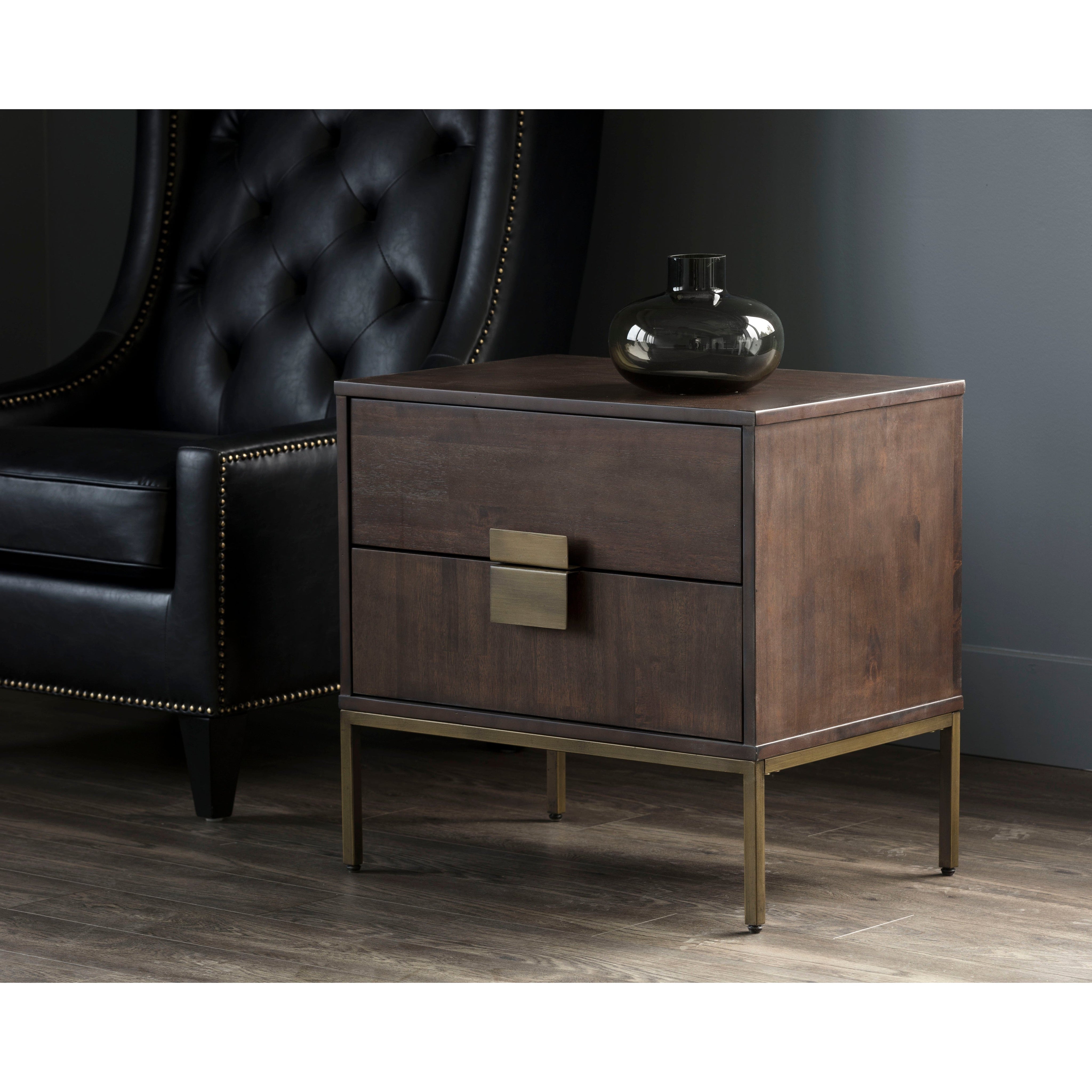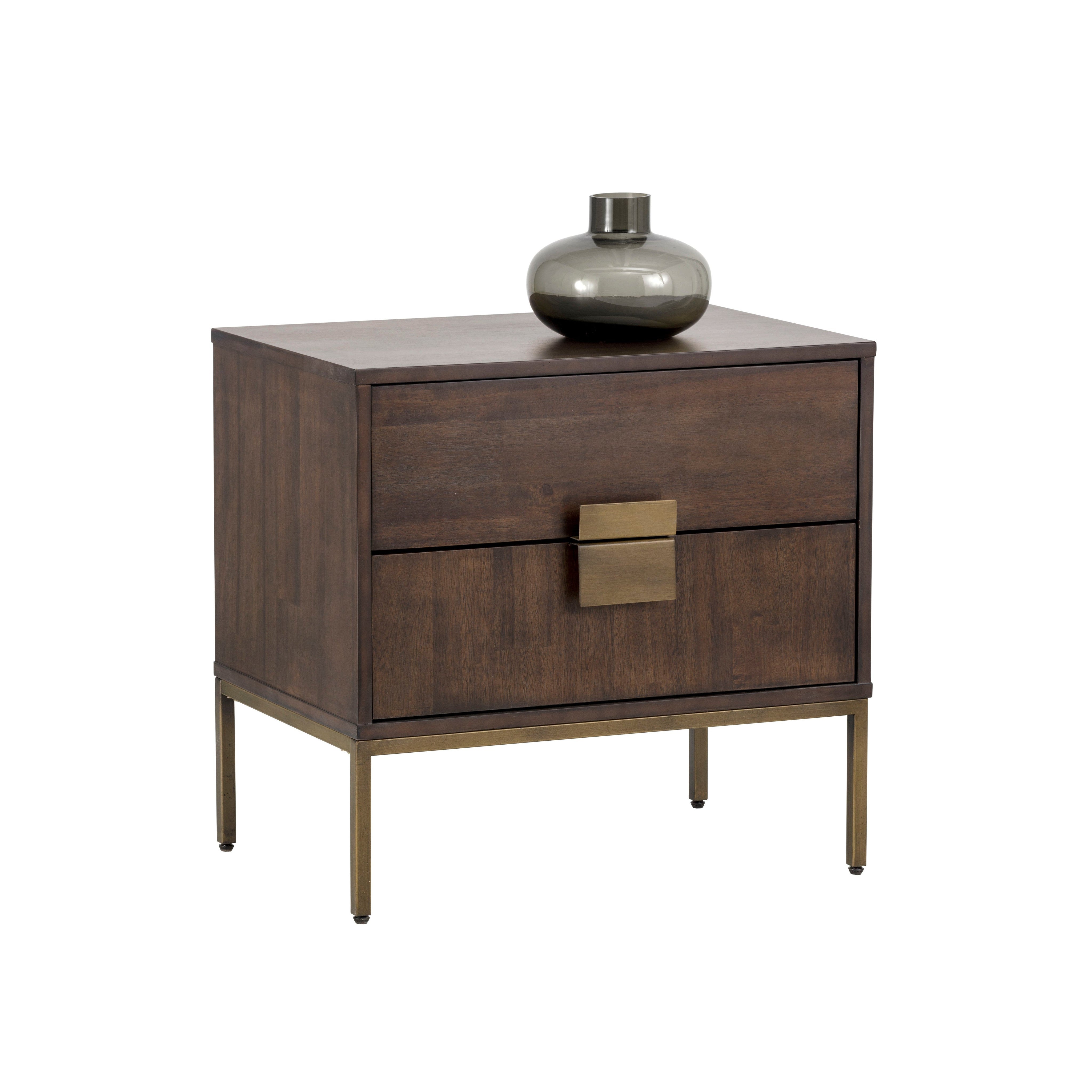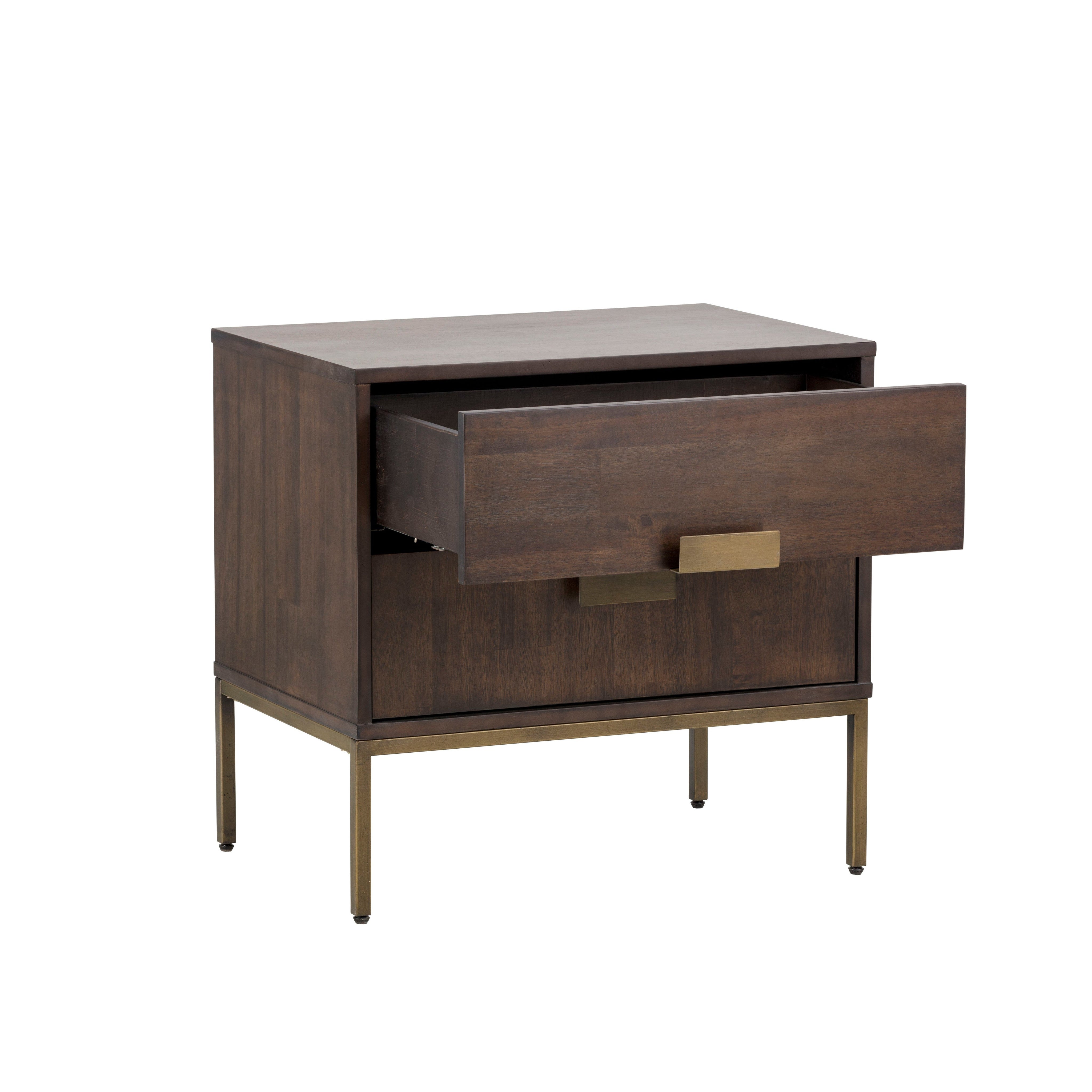 This uniquely crafted nightstand will add transitional allure to any bedroom. Made from acacia wood veneer with two drawers for ample storage. Alternating wood grain patterns on the drawer fronts and antique brass hardware complete the look. As wood is an organic, porous material, these pieces will contain natural variation of texture and may also exhibit fine indentations and cracks. Wood pieces will also display a disparity of colour and grain, and visible knots and burls that add to the character of each piece.