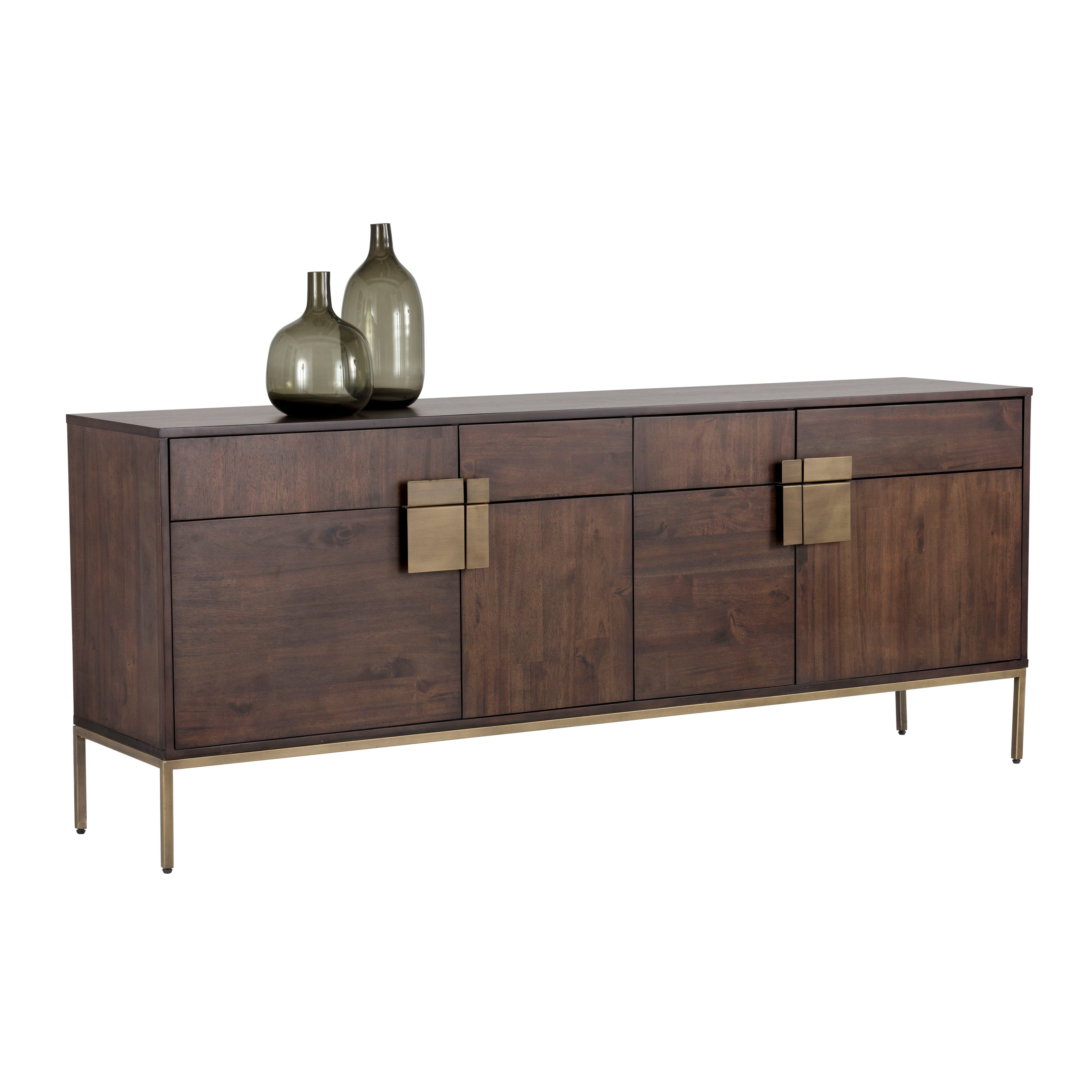 This uniquely crafted sideboard will add transitional allure to any dining space or foyer. Made from acacia wood veneer with four drawers and two large cabinets for ample storage. Alternating wood grain patterns on the drawer fronts and antique brass hardware complete the look. Suitable for residential and contract settings. As wood is an organic, porous material, these pieces will contain natural variation of texture and may also exhibit fine indentations and cracks. Wood pieces will also display a disparity of colour and grain, and visible knots and burls that add to the character of each piece.
