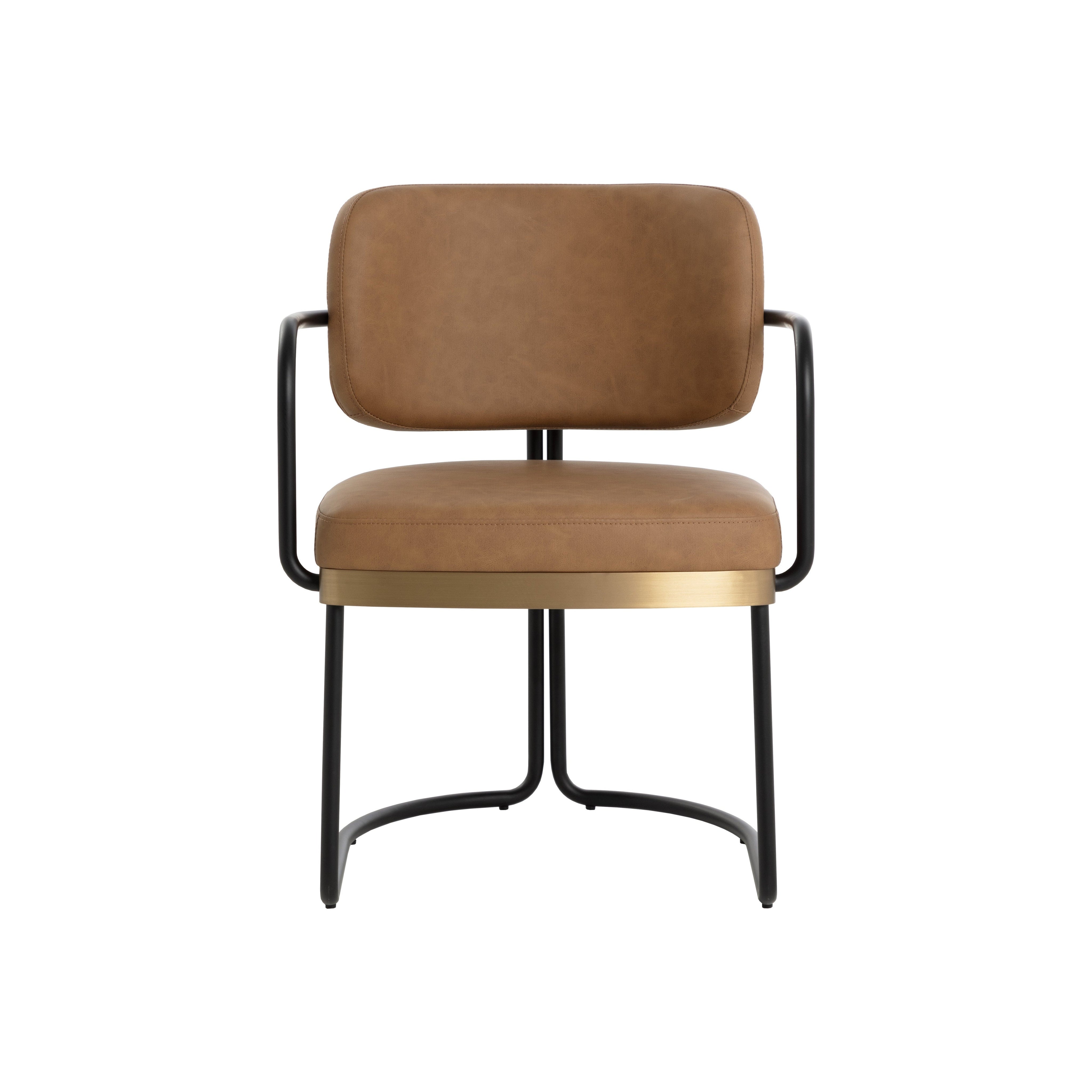 The Jalen Dining Armchair is poised to be a guest favourite thanks to its free flowing curves and gold stainless steel accents. Made from powder-coated iron with a supportive seat and back upholstered in high performance faux leather, this armchair will fit into any residential or commercial setting.