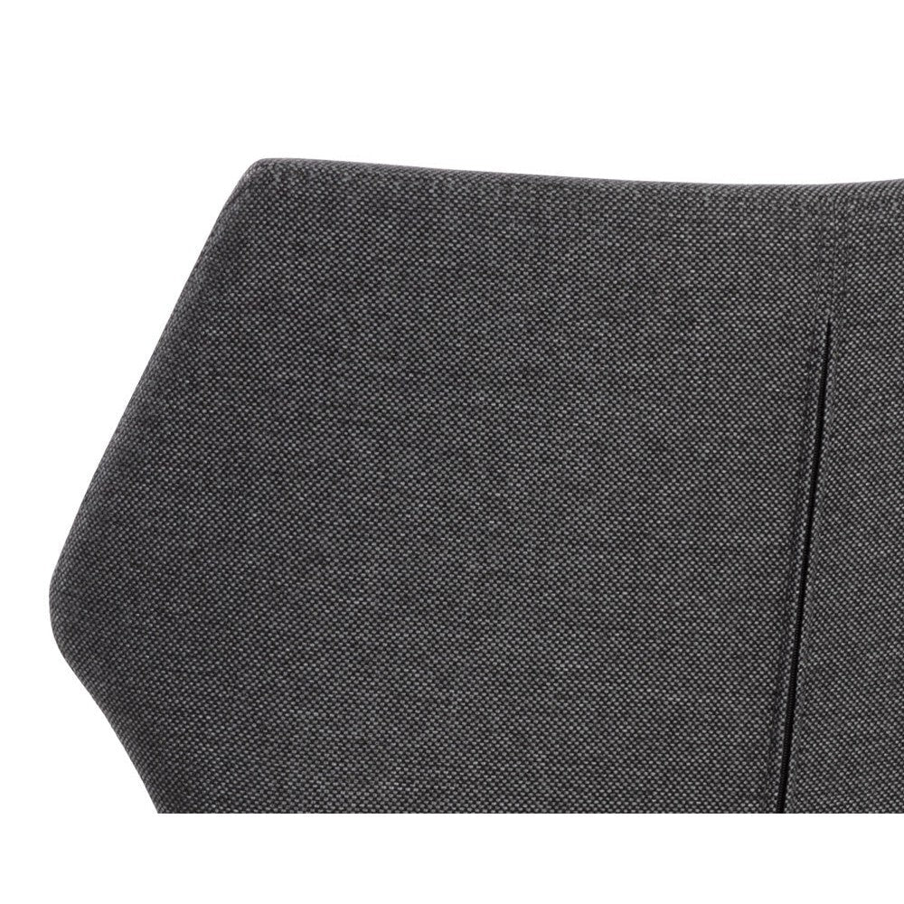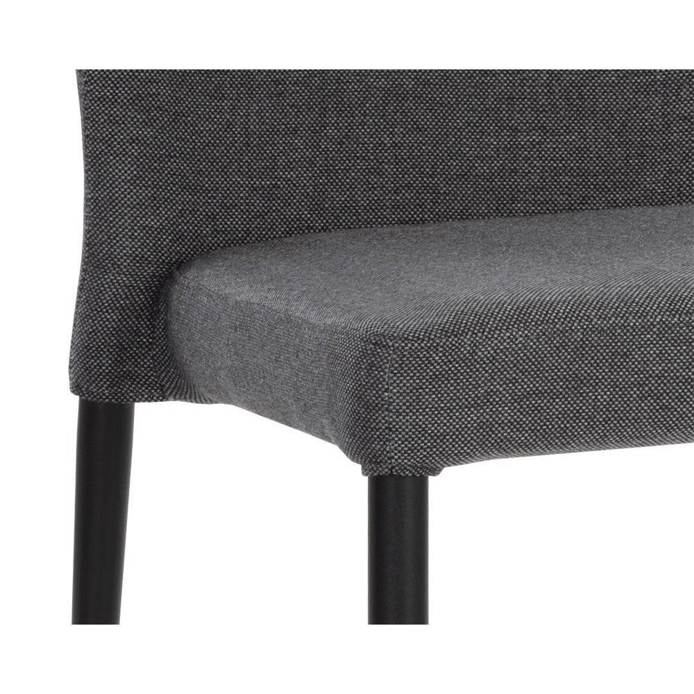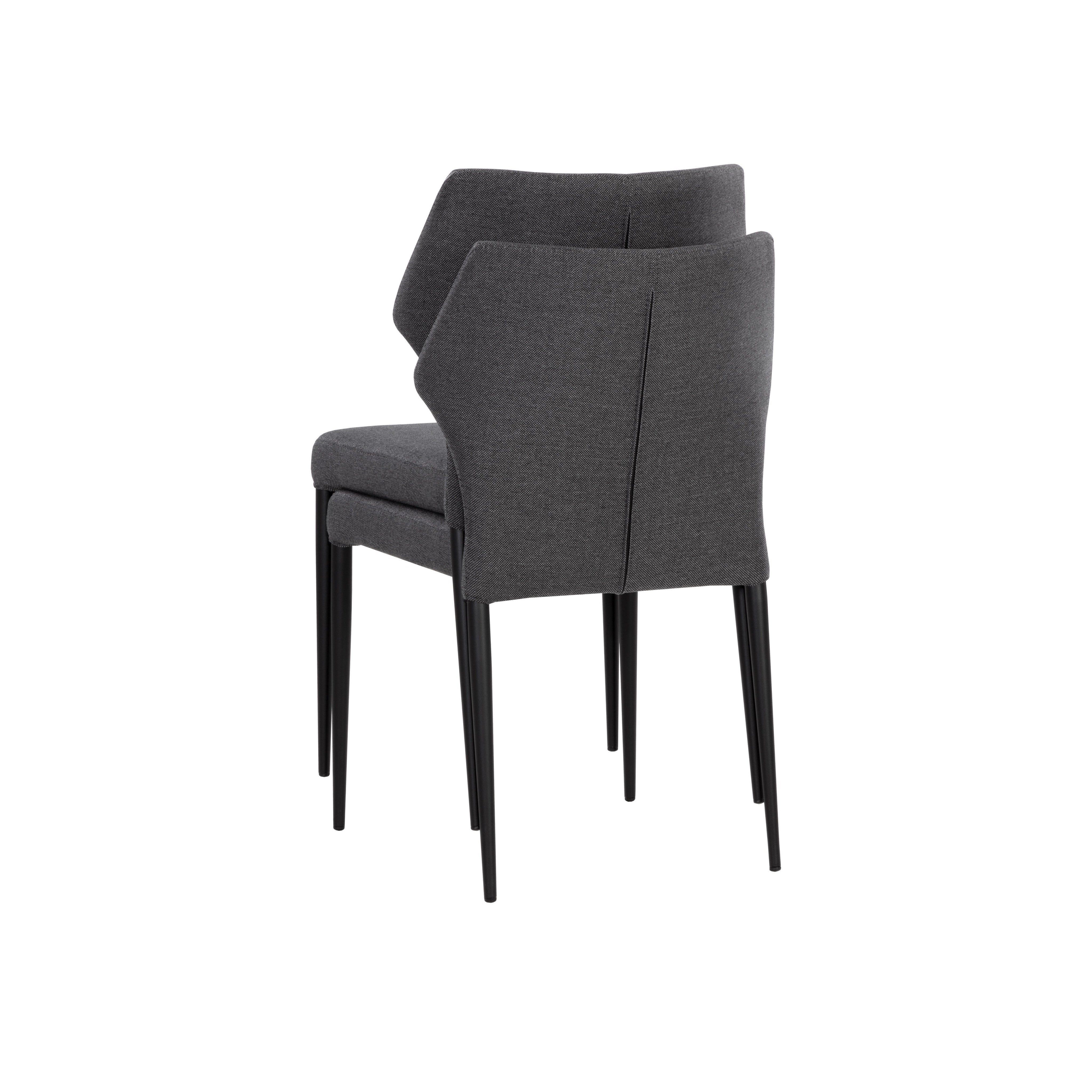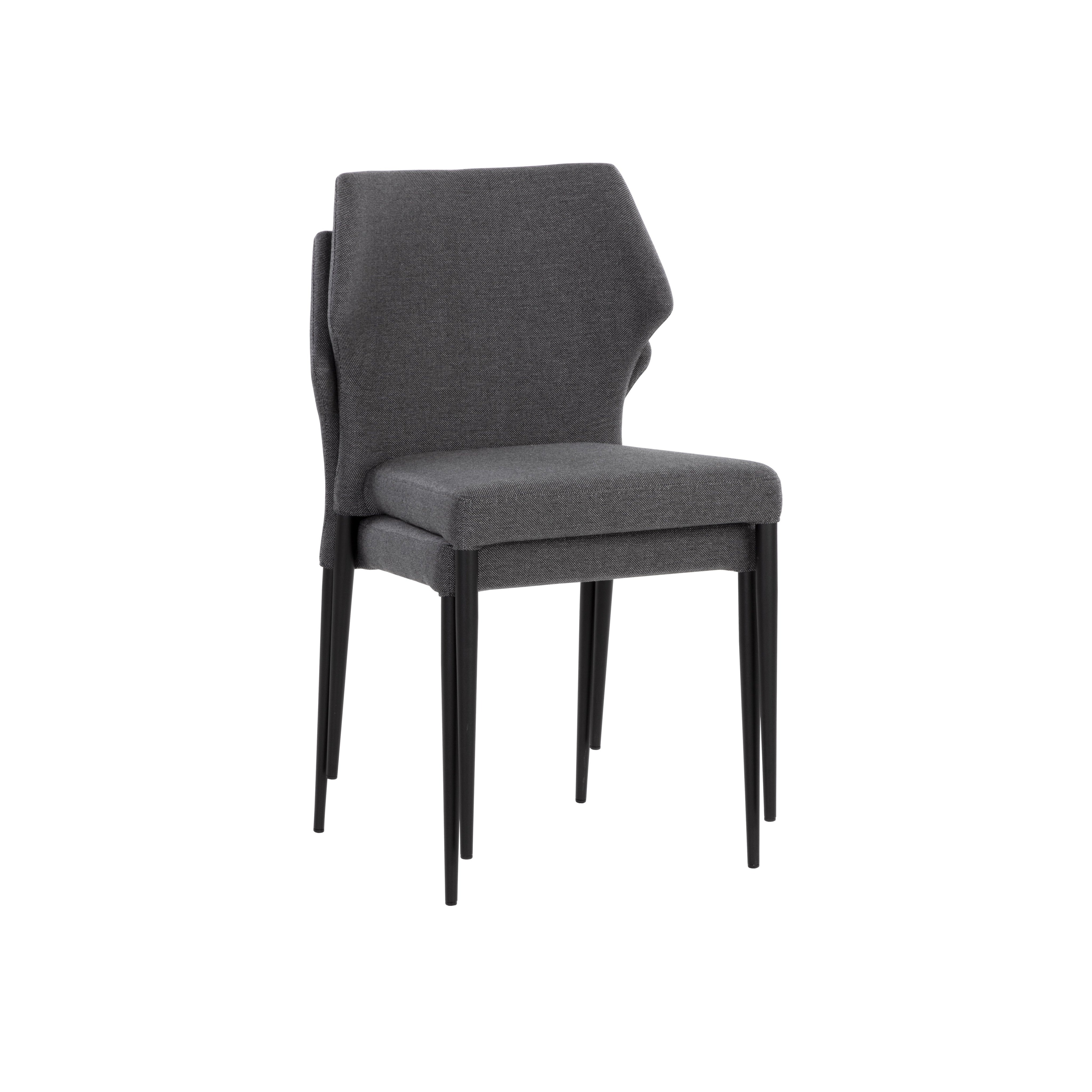 With a distinctly shaped backrest, this stackable modern dining chair is a great addition to any dining space. Stocked in city grey fabric with a stylish open seamed zipper on the back. Completed with powder-coated steel legs in black.