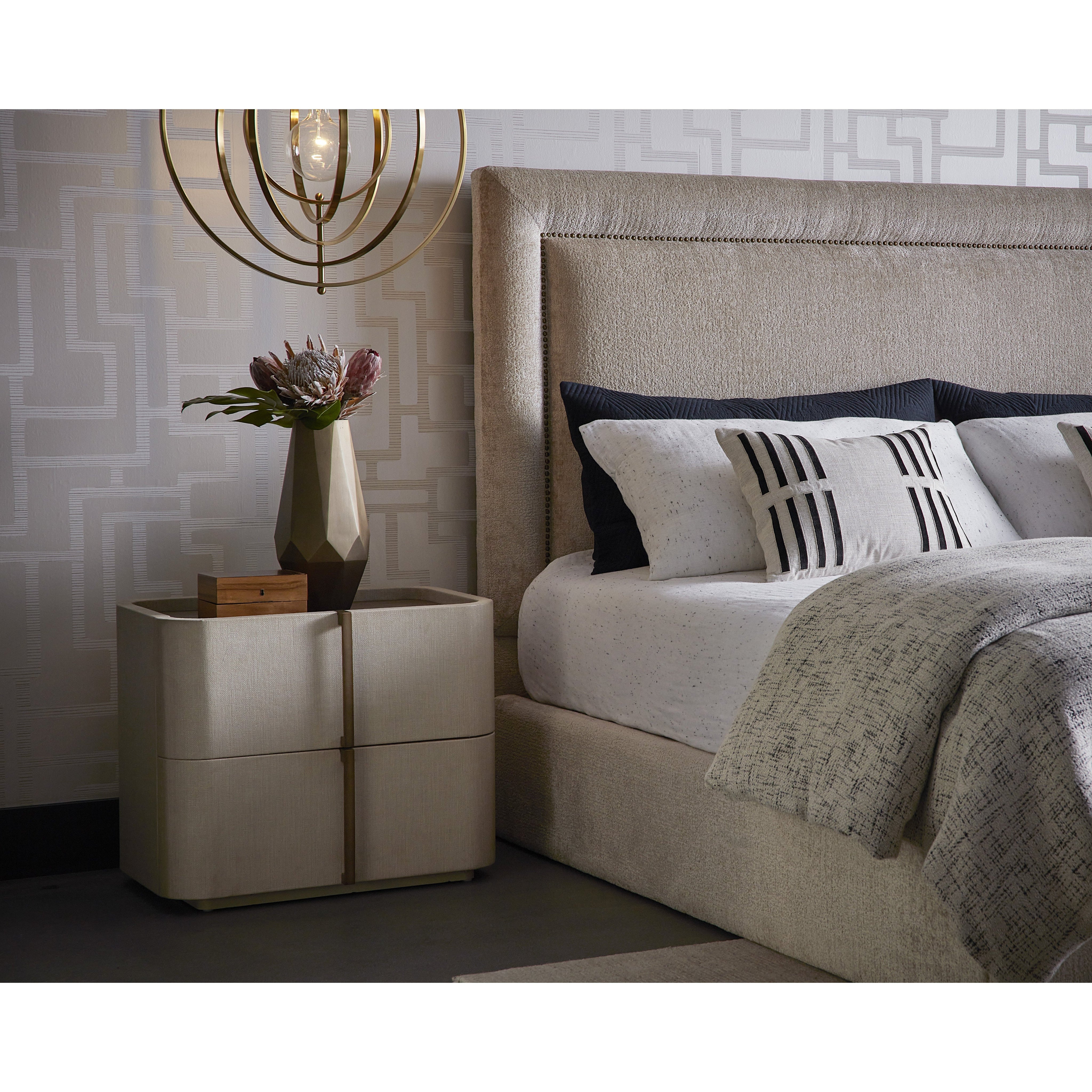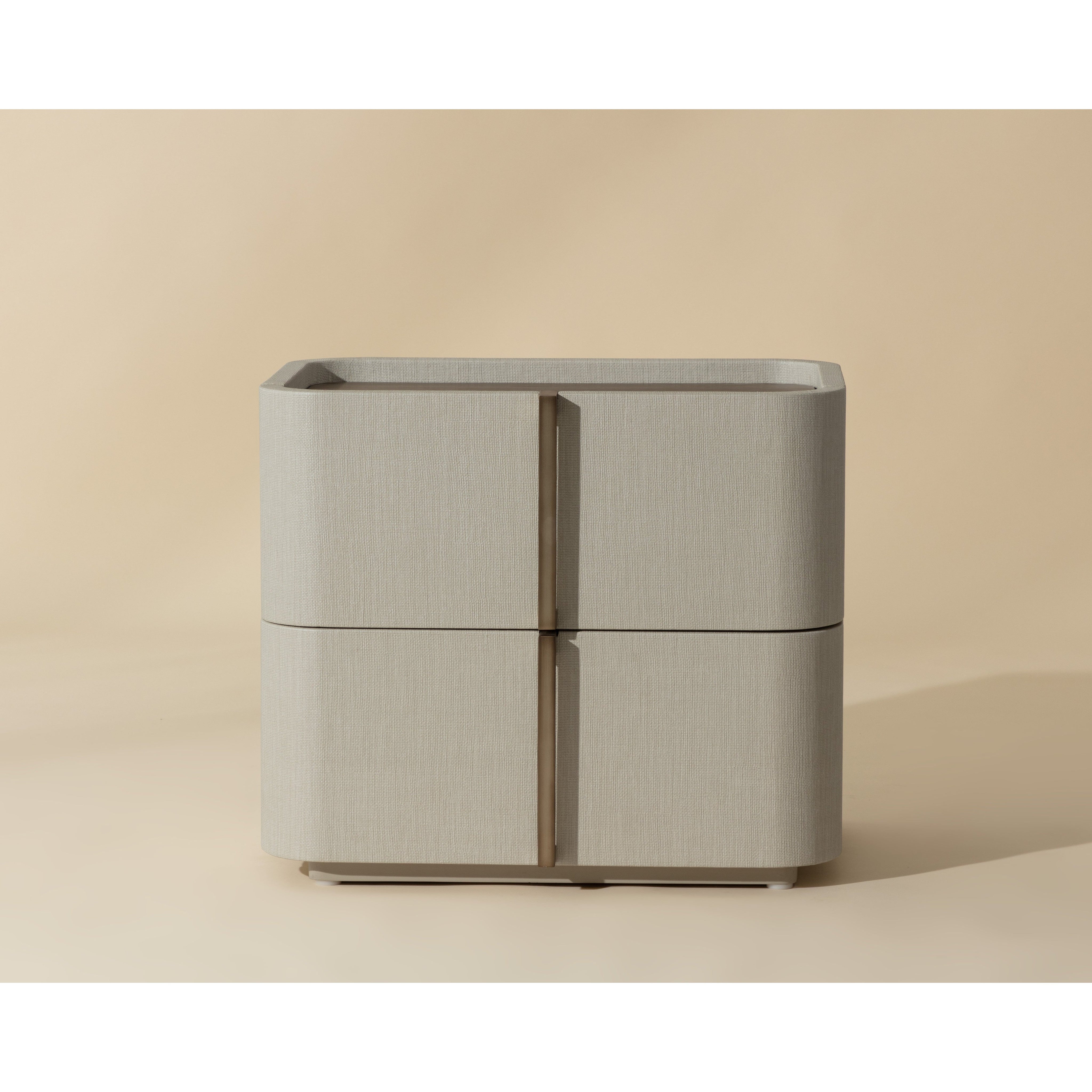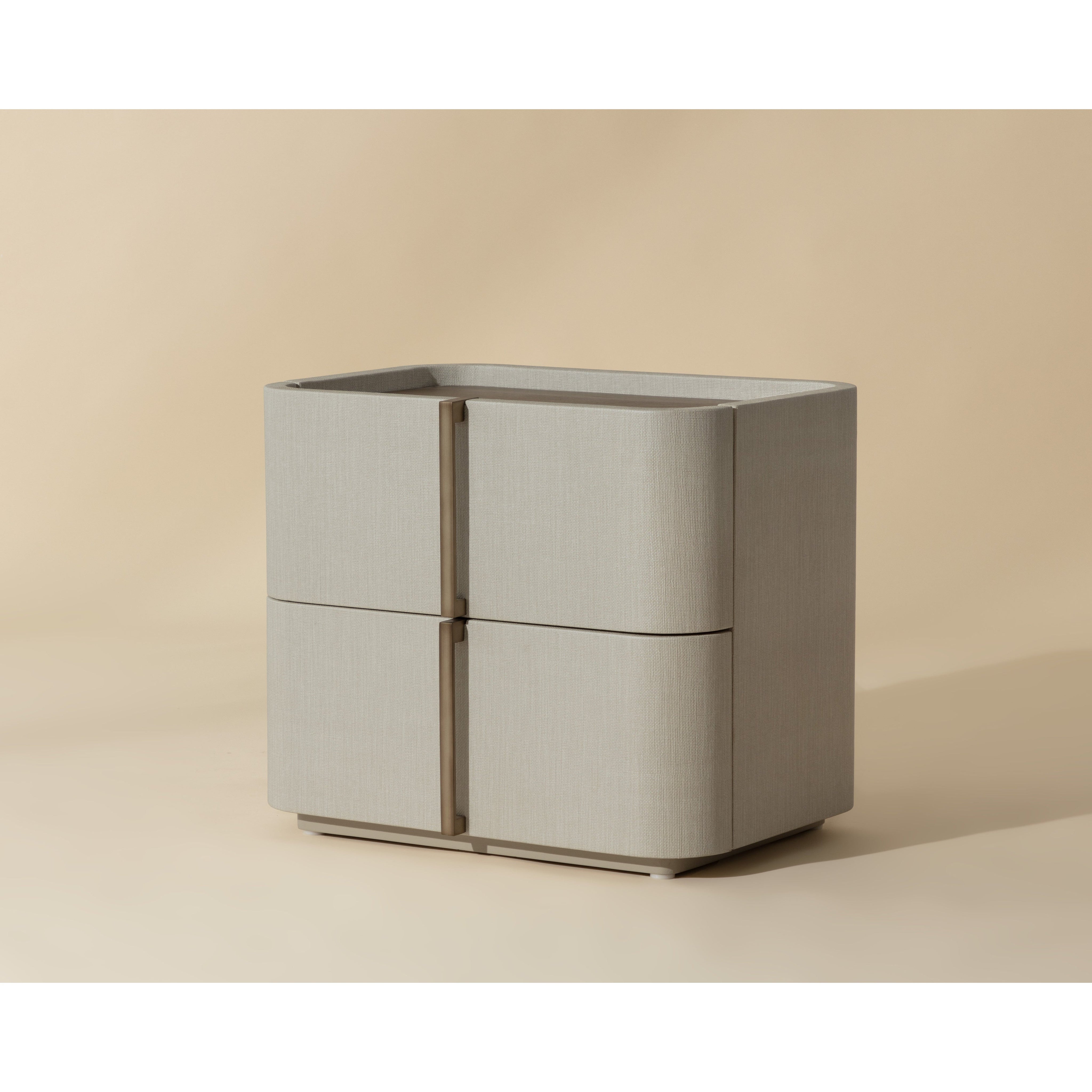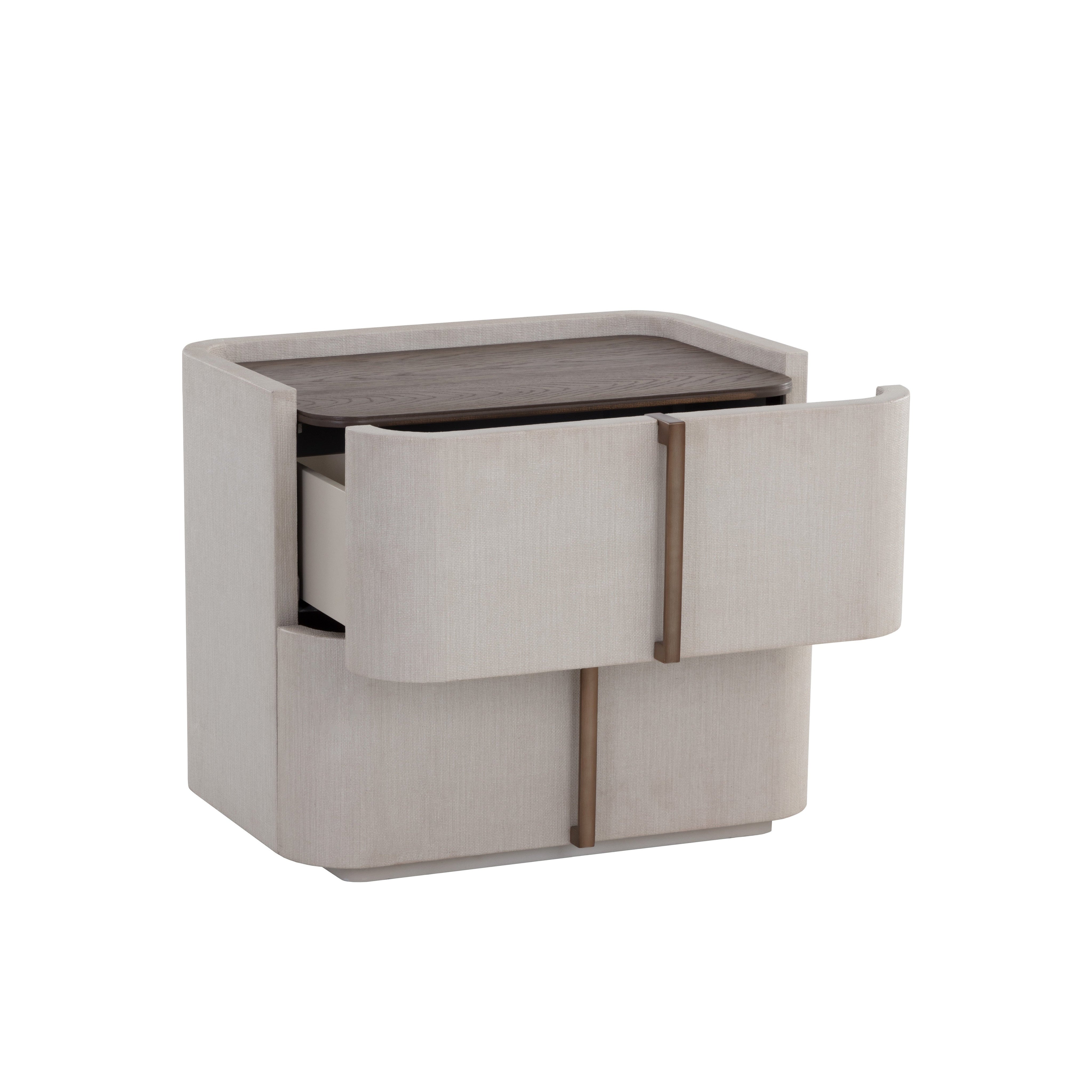 This contemporary small nightstand is defined by its beautiful and gentle curves. Wrapped in cream faux leather with a brown oak veneer tabletop that is sure to impress. Includes two drawers and completed with a solid acacia wood base. Handle With Care: This design has been crafted with faux leather. Faux leather is manufactured to reflect the natural characteristics of leather; as such, colour variations, markings wrinkles, grooves, and light scratches are appreciated characteristics. No two pieces will be alike. Visit our Product Care page for more information on how to ensure the lasting beauty of this piece.