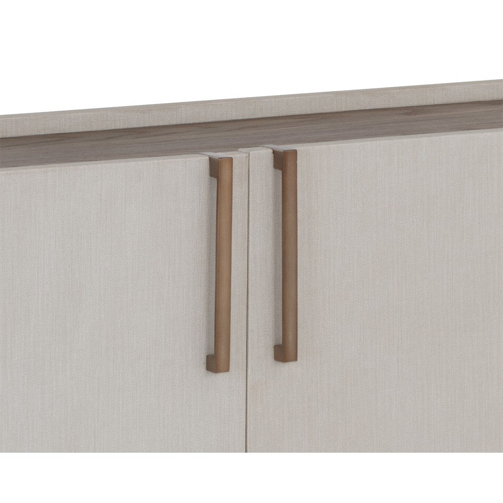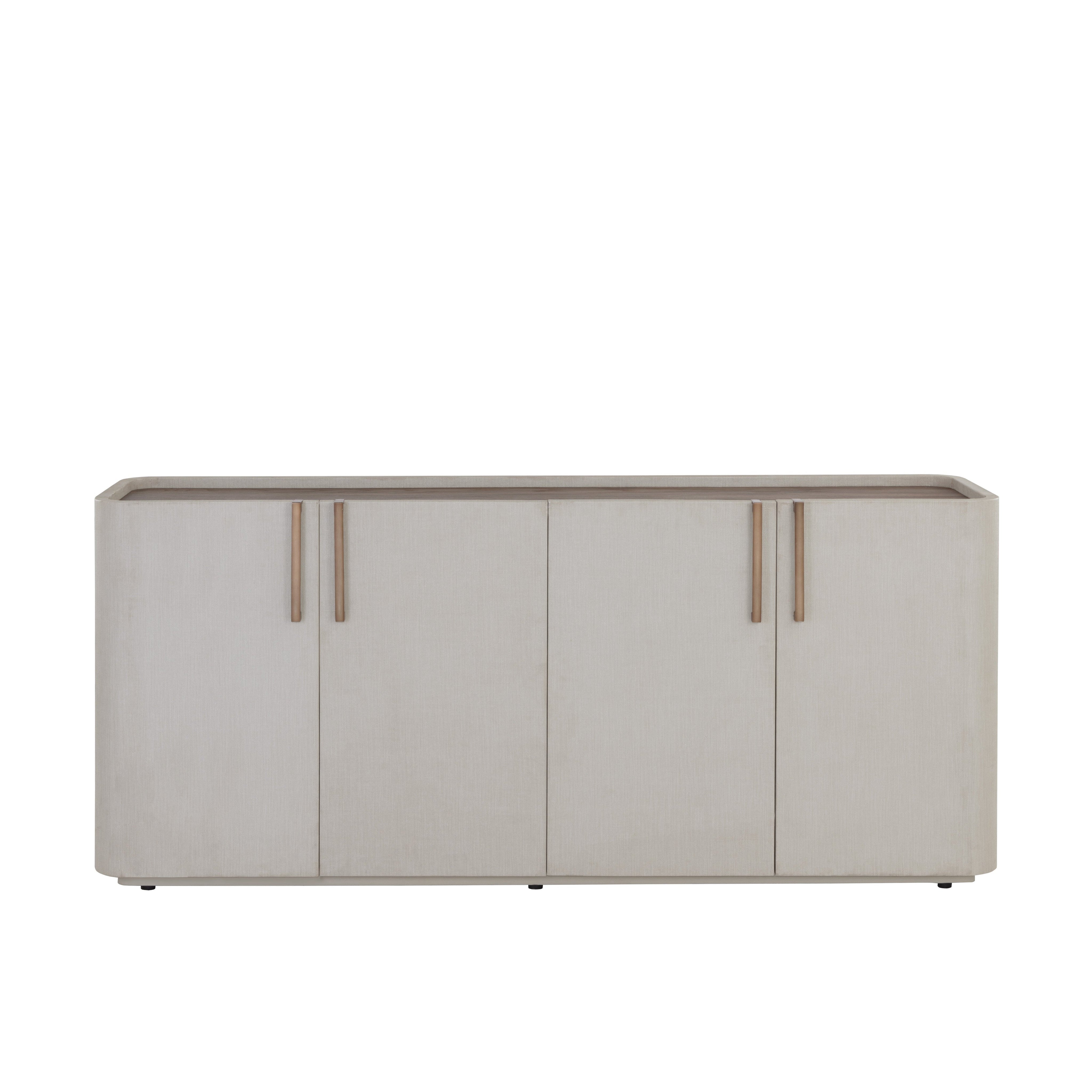 This contemporary sideboard is defined by its beautiful and gentle curves. Wrapped in cream faux leather with a brown oak veneer tabletop that is sure to impress. Includes four cabinets and completed with a solid acacia wood base. Handle With Care: This design has been crafted with faux leather. Faux leather is manufactured to reflect the natural characteristics of leather; as such, colour variations, markings wrinkles, grooves, and light scratches are appreciated characteristics. No two pieces will be alike. Visit our Product Care page for more information on how to ensure the lasting beauty of this piece.