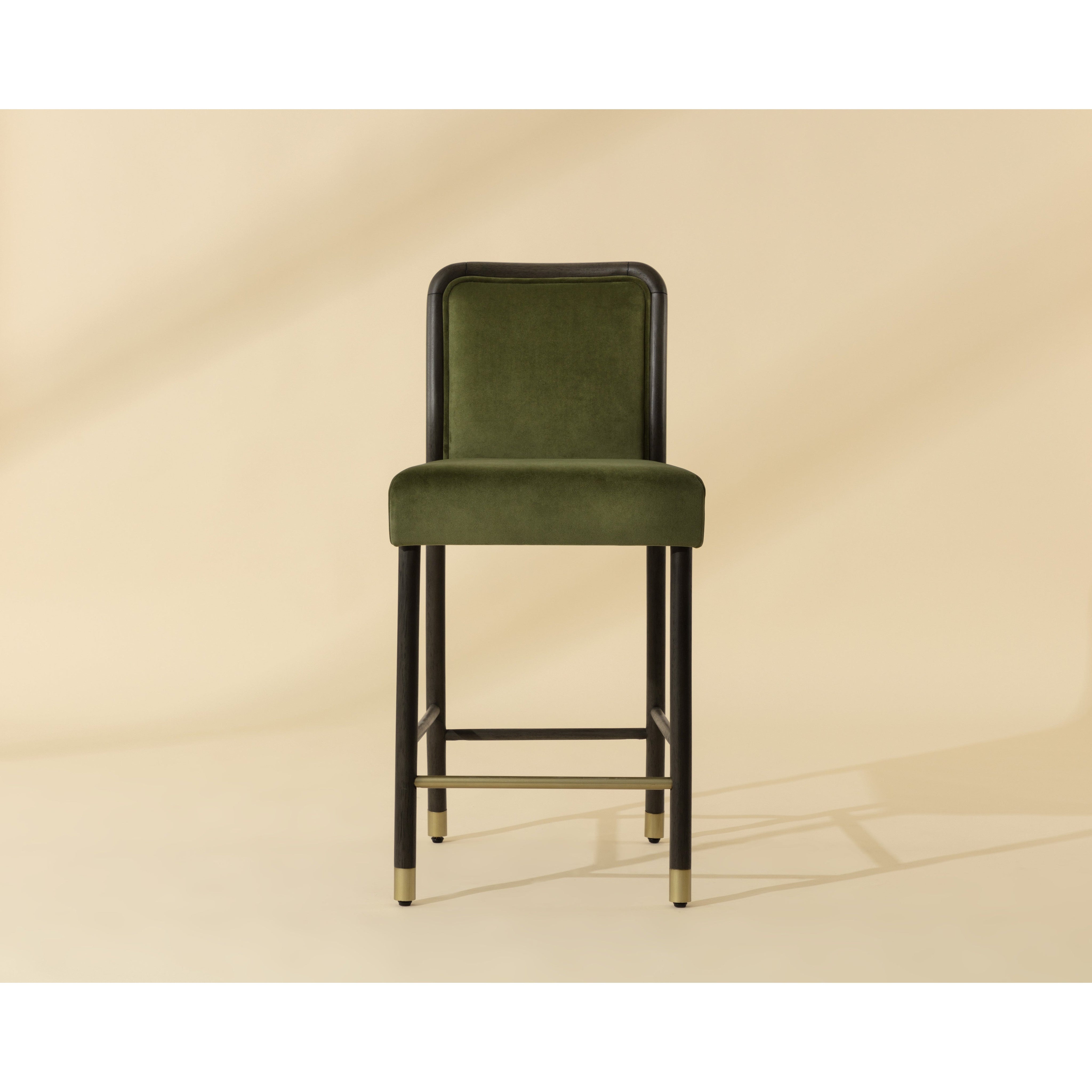 The Jeno Counter Stool is a sophisticated study of mid-century design. A velvet fabric seat in meg olive combined with a smoke grey rubberwood frame gives a striking balance of impeccable style and comfort. Brass metal stretchers and foot caps enhance the overall look.
