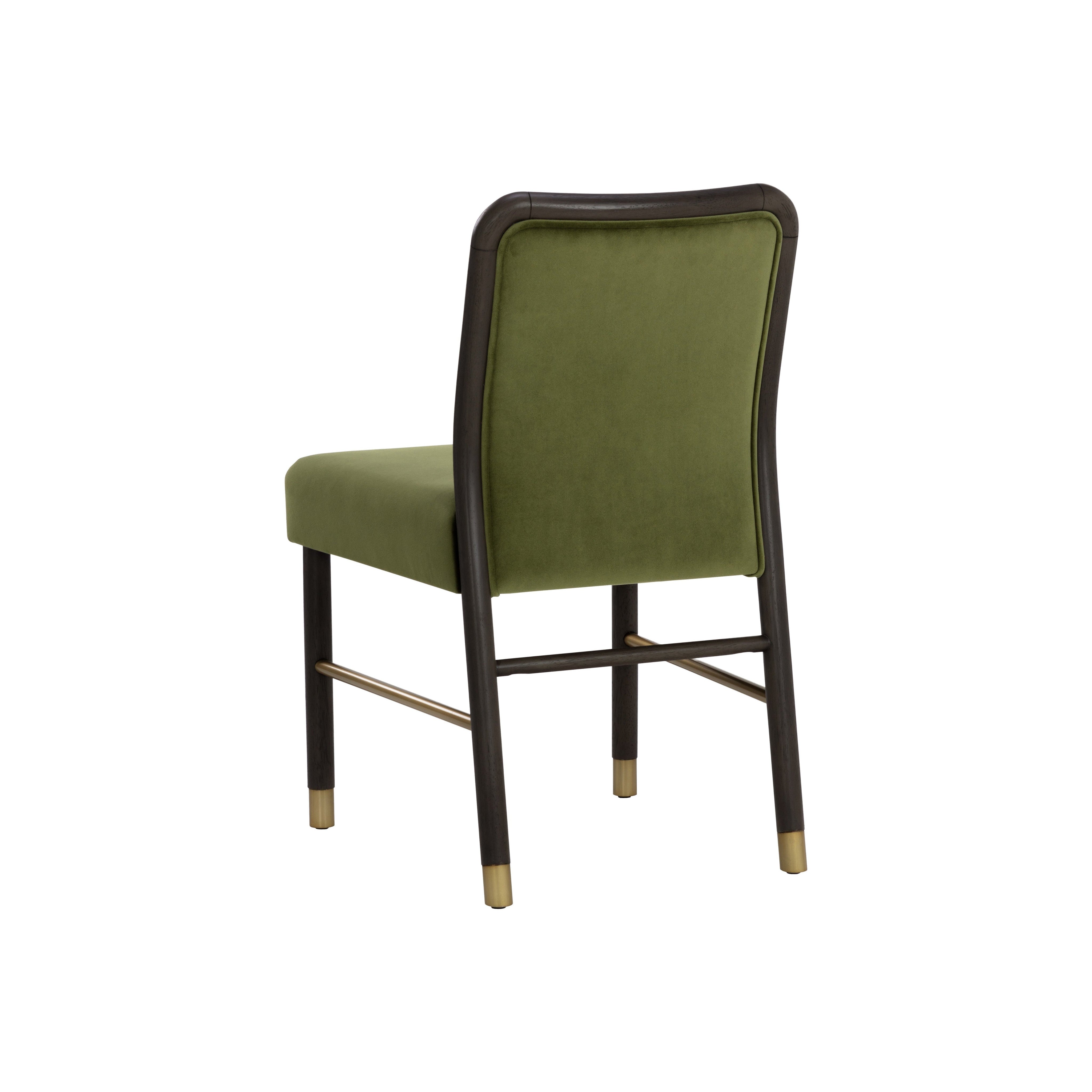 The Jeno Dining Chair is a sophisticated study of mid-century design. A velvet fabric seat in meg olive combined with a smoke grey rubberwood frame gives a striking balance of impeccable style and comfort. Brass metal stretchers and foot caps enhance the overall look.
