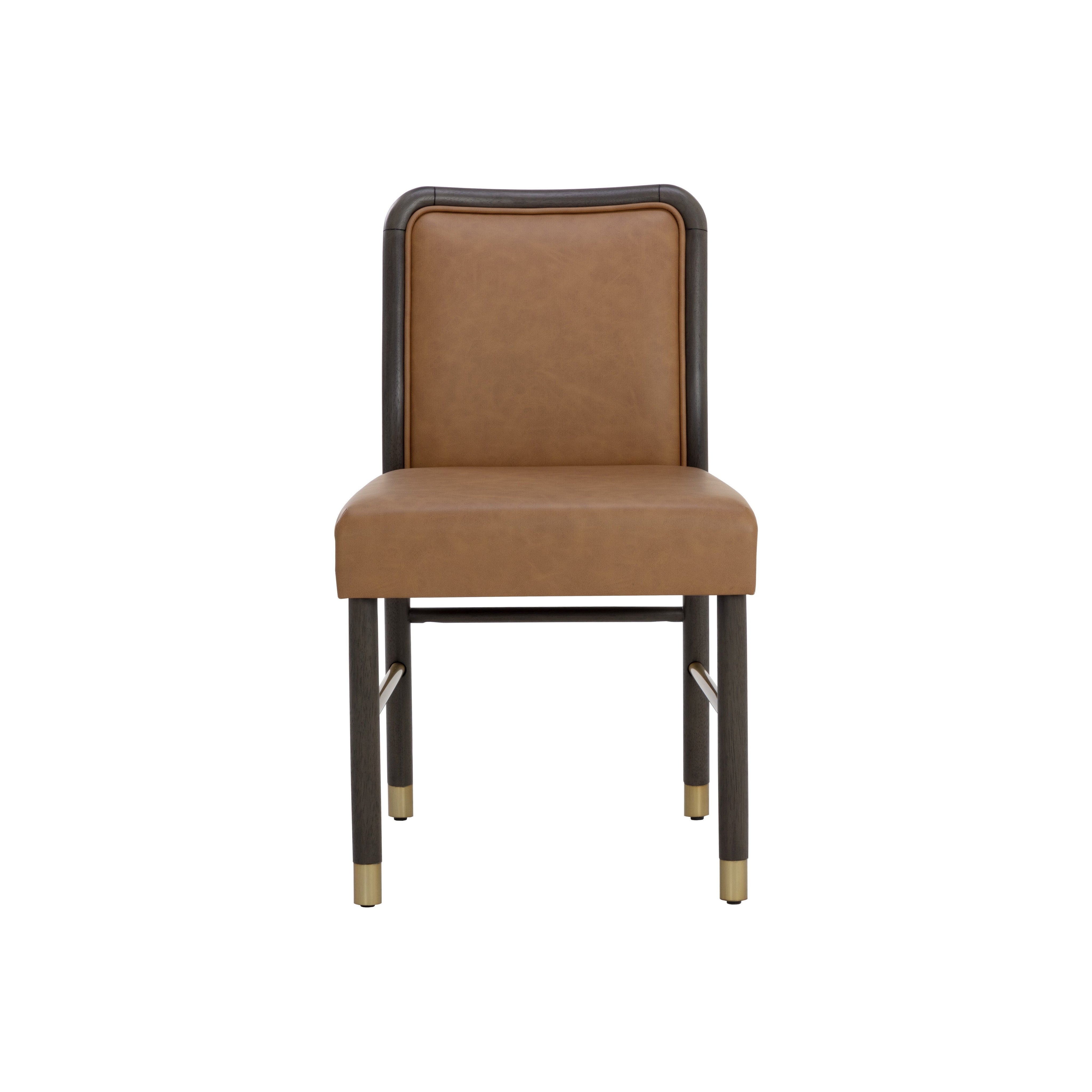 The Jeno Dining Chair is a sophisticated study of mid-century design. A faux leather seat in milliken cognac combined with a smoke grey rubberwood frame gives a striking balance of impeccable style and comfort. Brass metal stretchers and foot caps enhance the overall look.