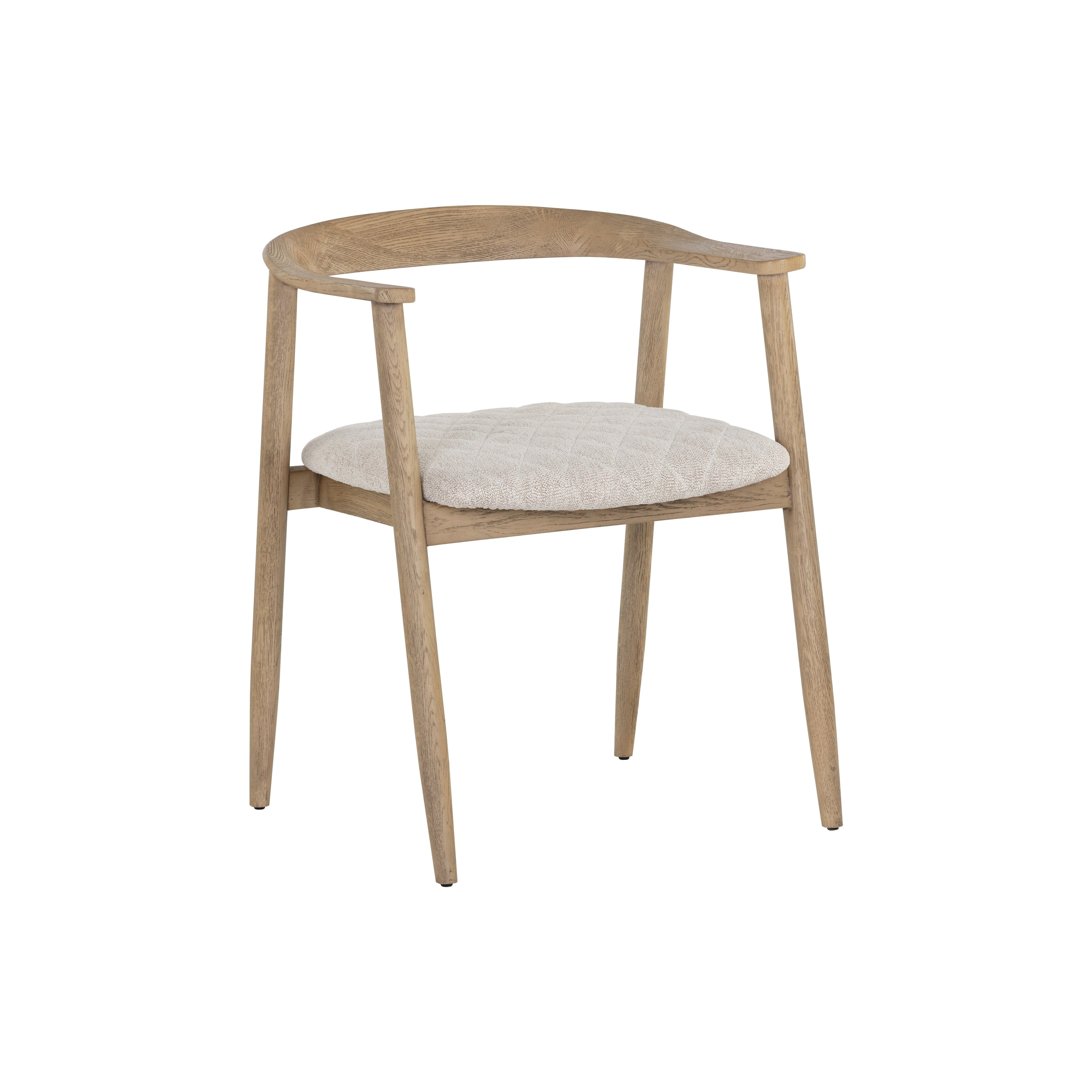 An alluring mid-century dining armchair that embraces the beauty of simplicity. Features a comfortable, quilted cushion in dove cream fabric. Completed with a brown, weathered solid oak wood frame. As wood is an organic, porous material, these pieces will contain natural variation of texture and may also exhibit fine indentations and cracks. Wood pieces will also display a disparity of colour and grain, and visible knots and burls that add to the character of each piece.