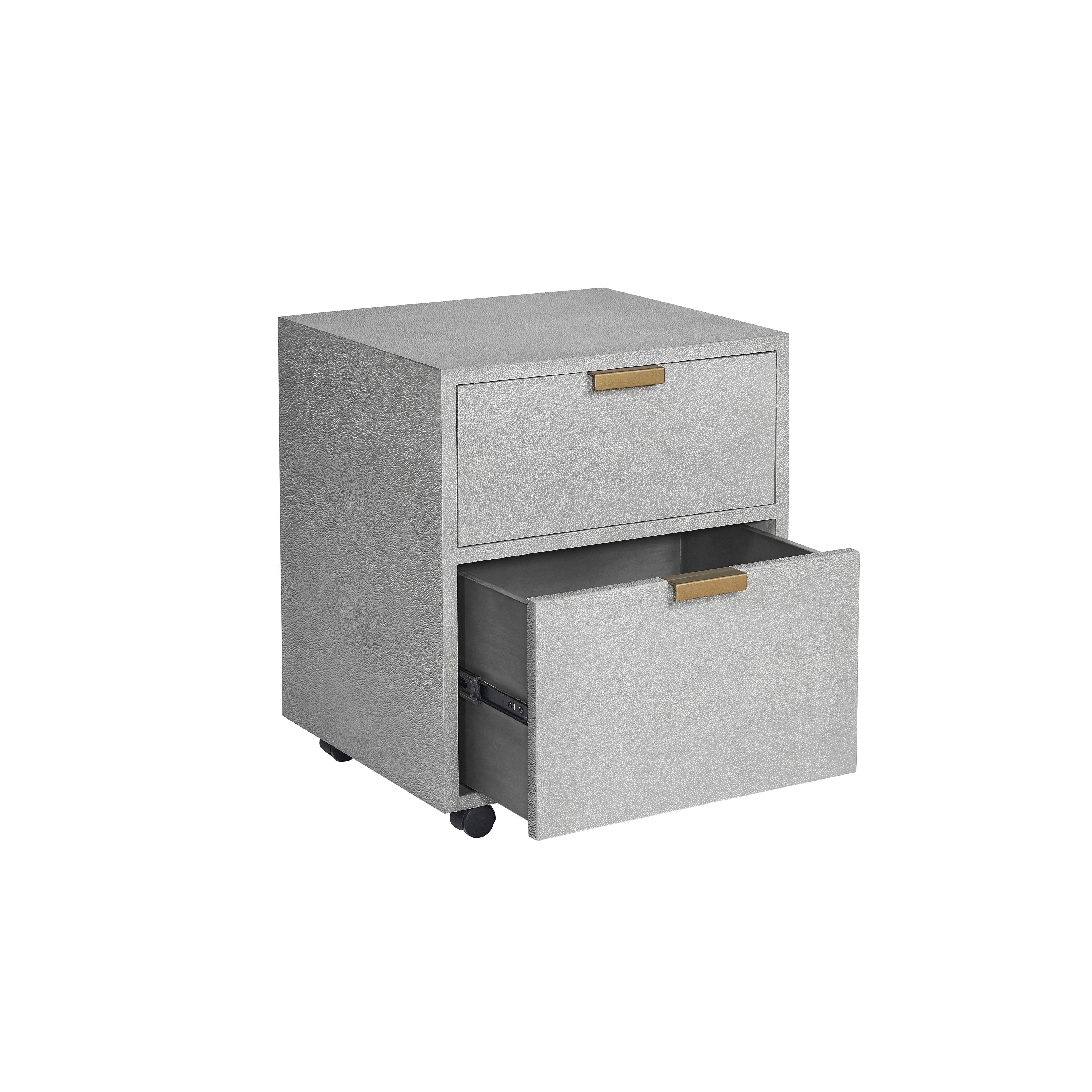Design a space for creativity with this eye-catching file cabinet. Covered in bonded leather with a textured shagreen finish and antique brass hardware. Two large drawers offer ample storage and castors allow for easy mobility. Handle with Care: This design has been crafted with bonded leather. Bonded leather is a blend of reconstituted leather and synthetic materials crafted to reflect the natural characteristics of leather; as such, colour variations, markings, wrinkles, grooves and light scratches are acceptable and appreciated characteristics. No two pieces are alike. Visit our Product Care page for more information on how to ensure the lasting beauty of this piece.