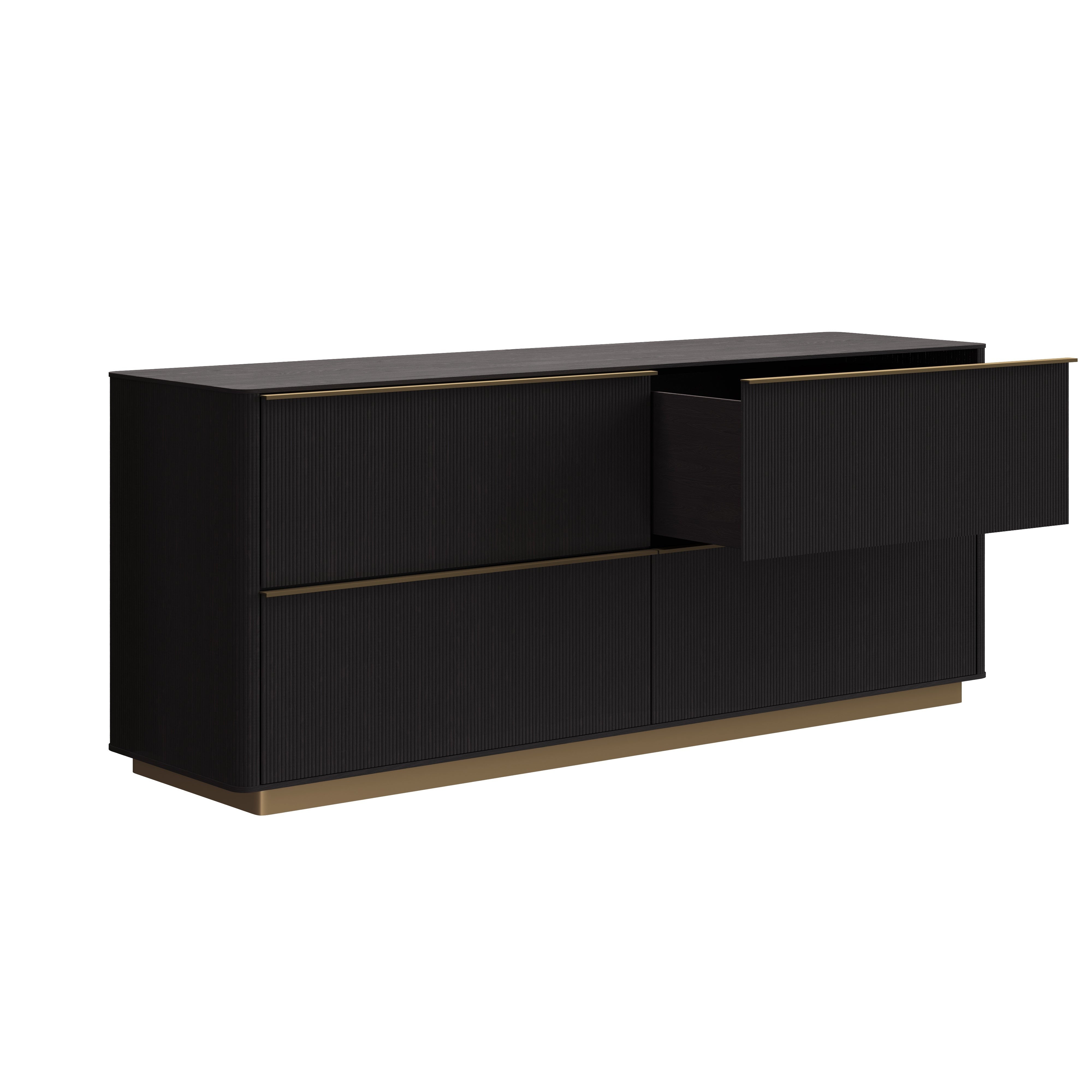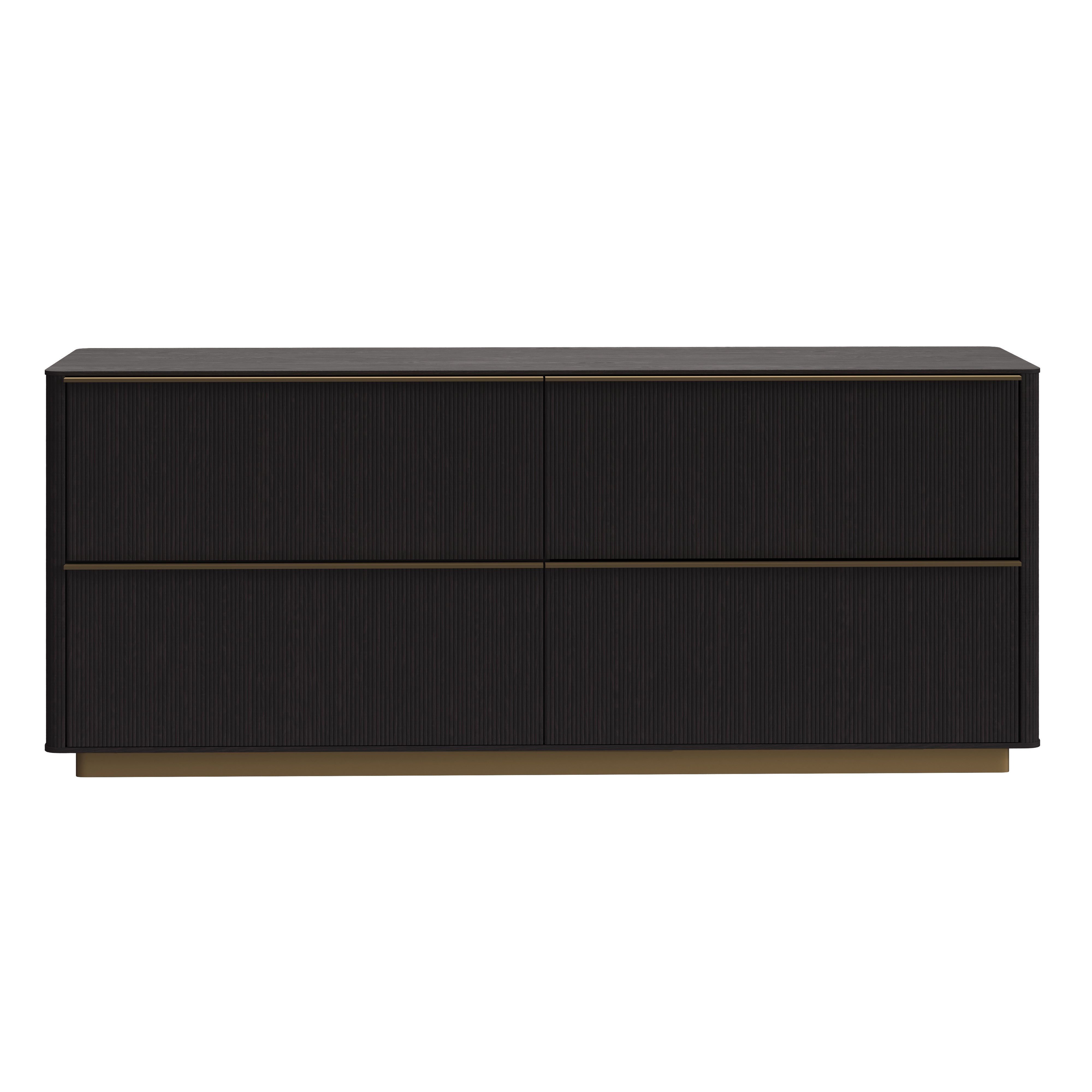 The Kalla Dresser brings form and function to life. Crafted with a rustic oak veneer with vertical reeding. A gold steel base finishes the look. As wood is an organic, porous material, these pieces will contain natural variation of texture and may also exhibit fine indentations and cracks. Wood pieces will also display a disparity of colour and grain, and visible knots and burls that add to the character of each piece.