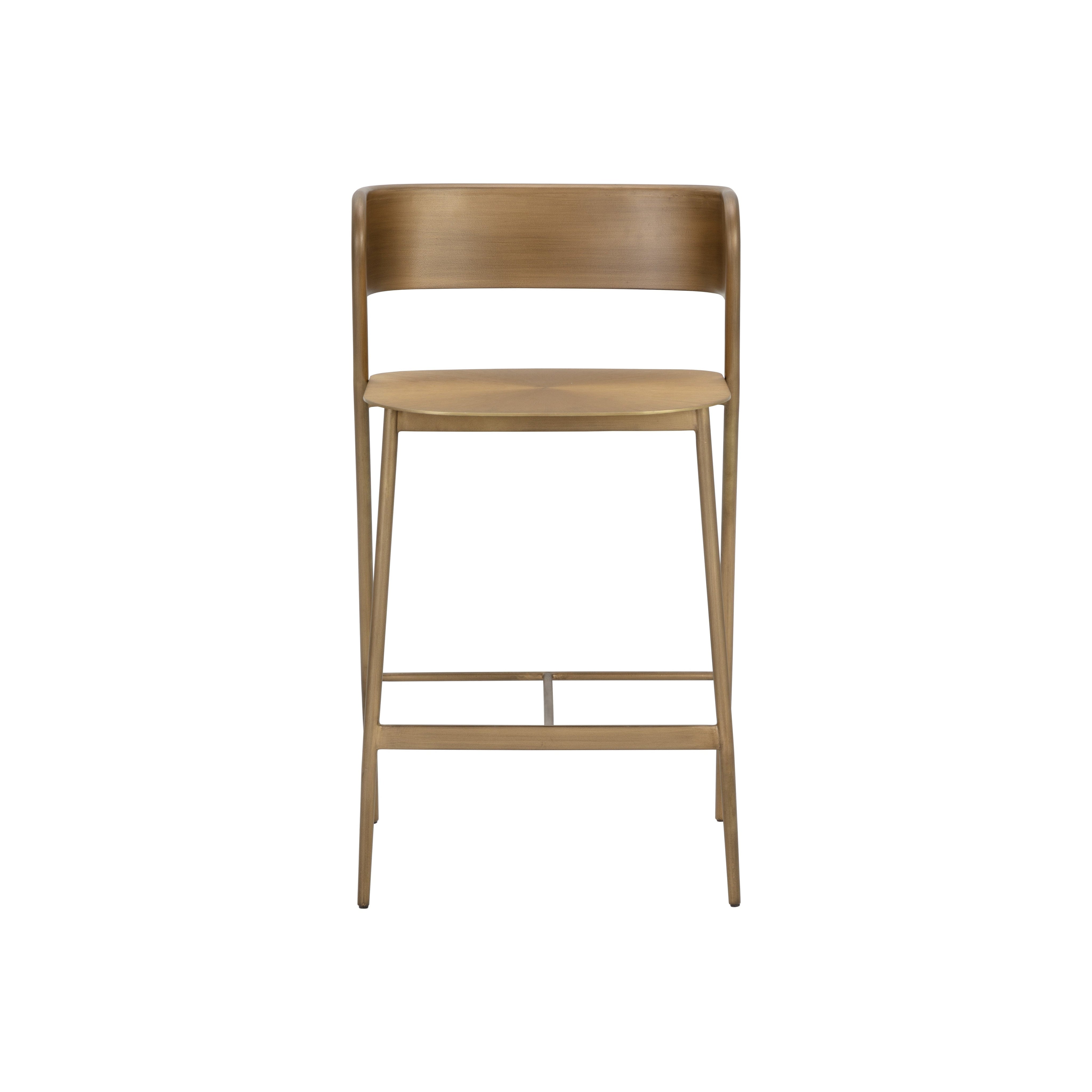 A handsome and sleek counter stool that features a modern design filled with rich details. Crafted from iron with an antique brass finish and completed with a stylish starburst pattern on the seat. Made in India. With refined craftsmanship, this design was brought to life by skilled local artisans. By nature, these materials develop unique imperfections such as fissures, markings and colour variations for a truly one-of-a-kind piece.