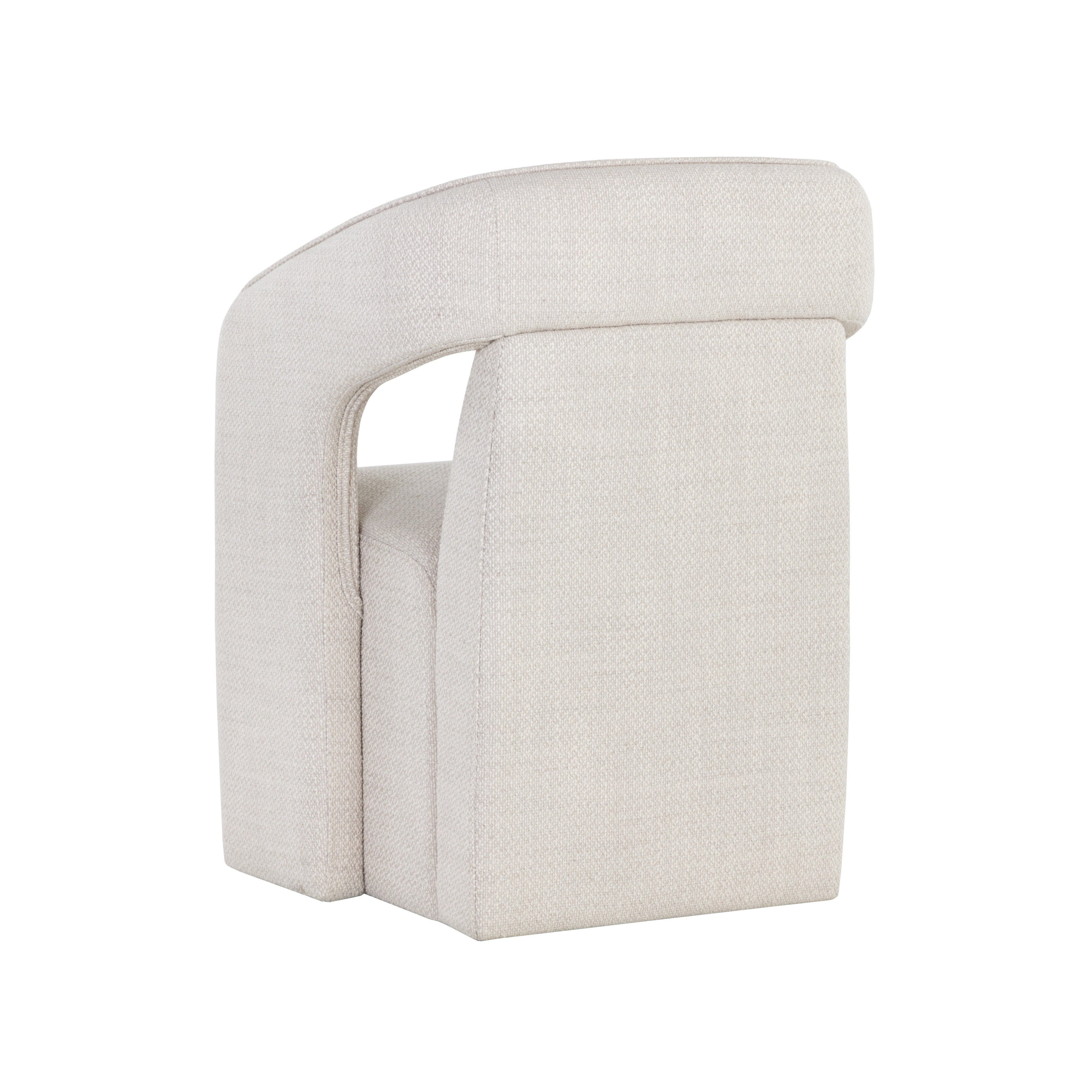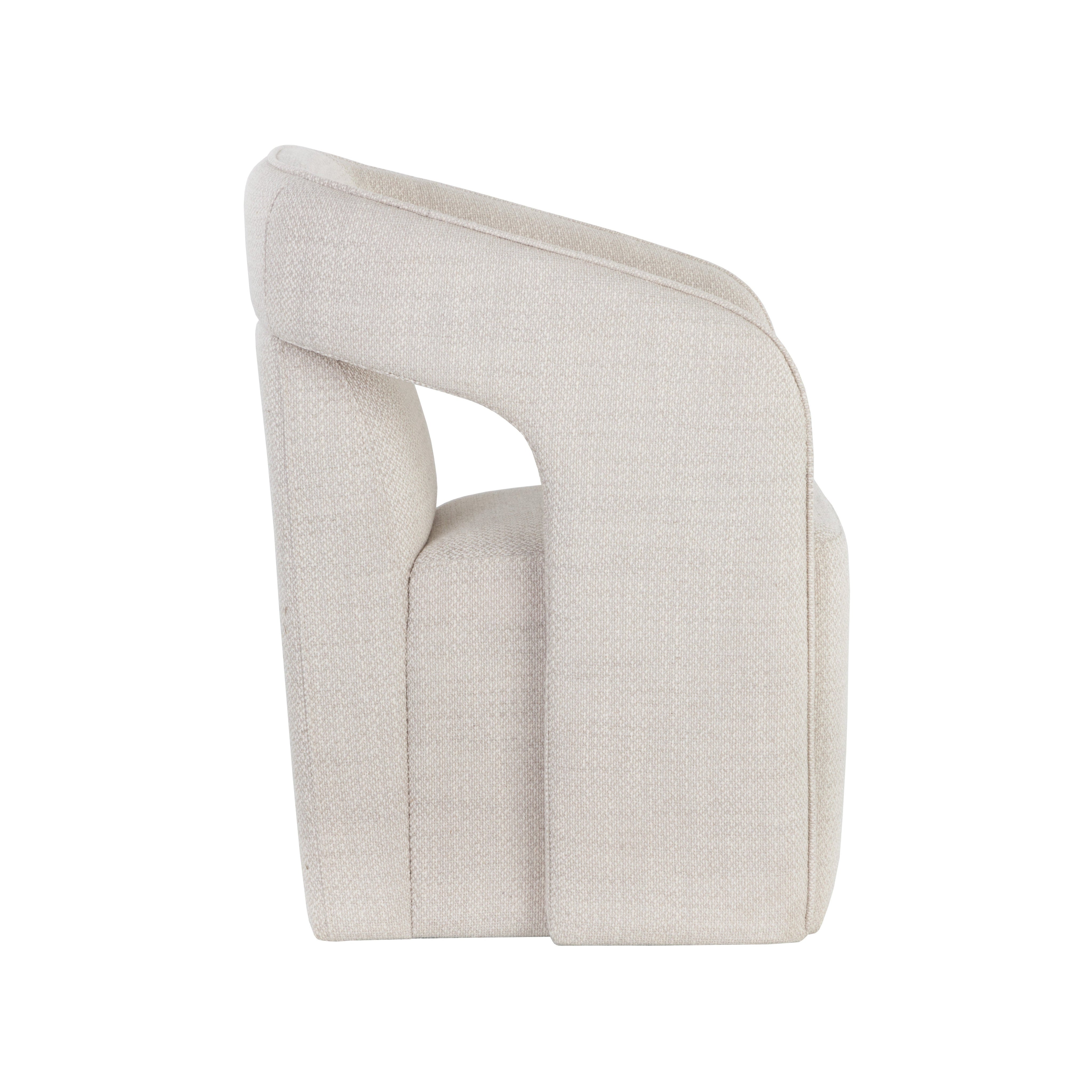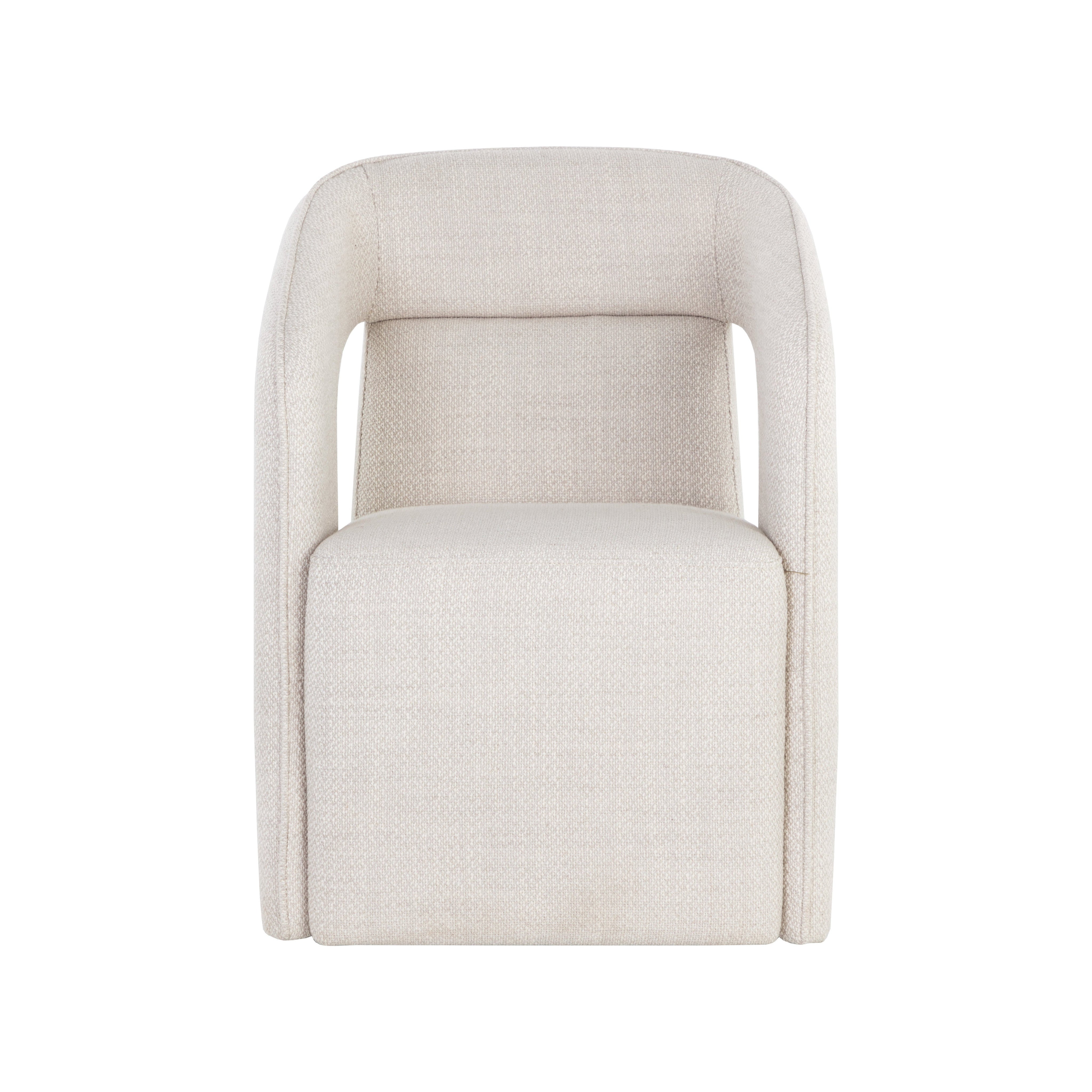 A futuristic wheeled dining armchair featuring cut out arms and a large, comfortable seat. Stocked in moto stucco performance fabric. Performance fabric is moisture repellent, durable and easy to clean.