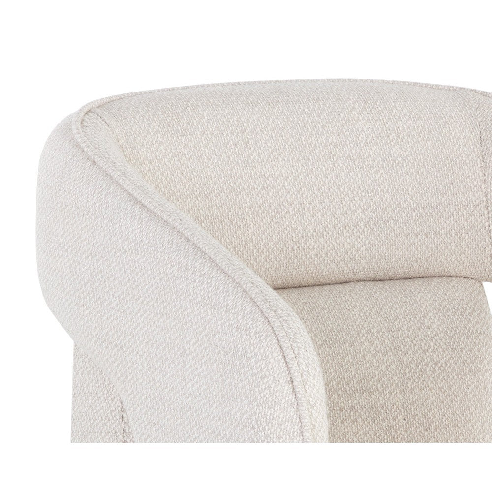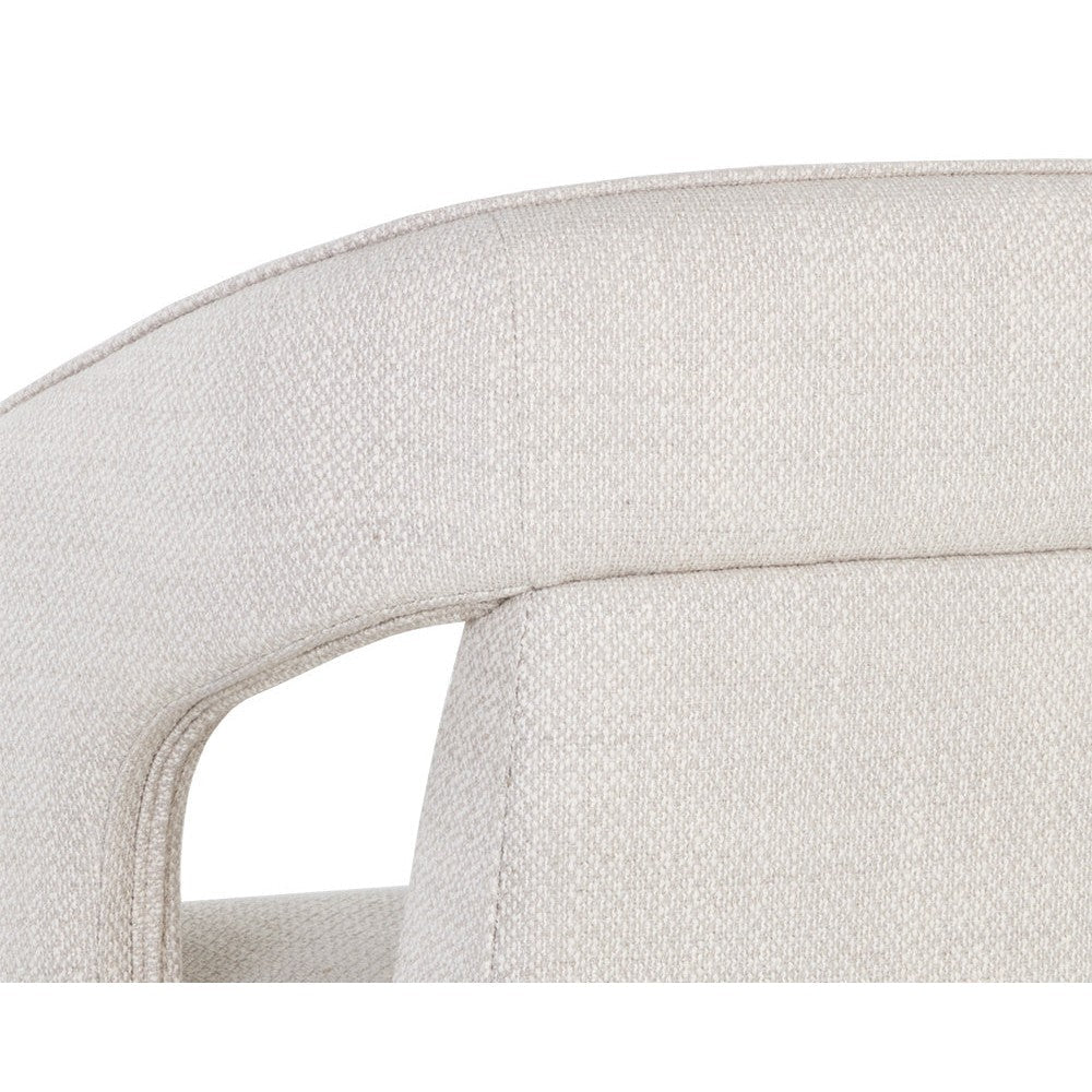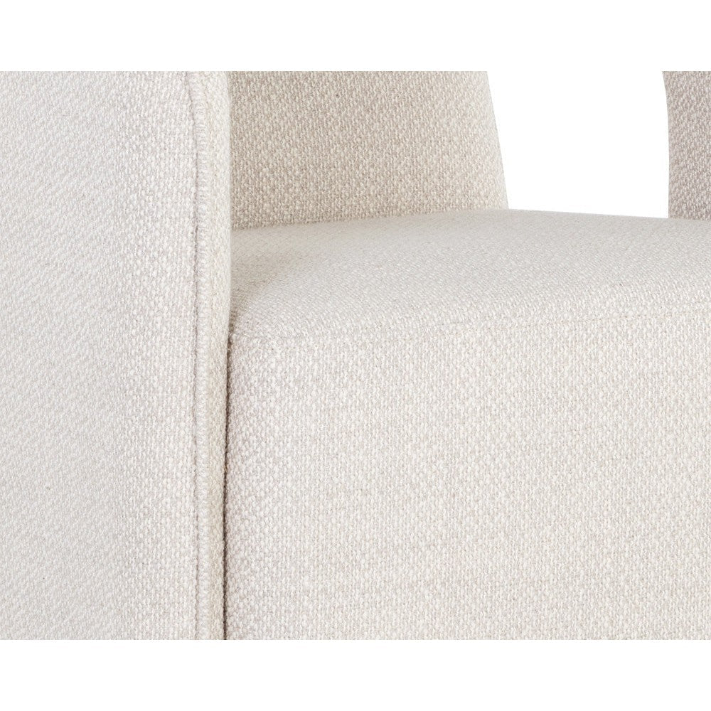 A futuristic wheeled dining armchair featuring cut out arms and a large, comfortable seat. Stocked in moto stucco performance fabric. Performance fabric is moisture repellent, durable and easy to clean.