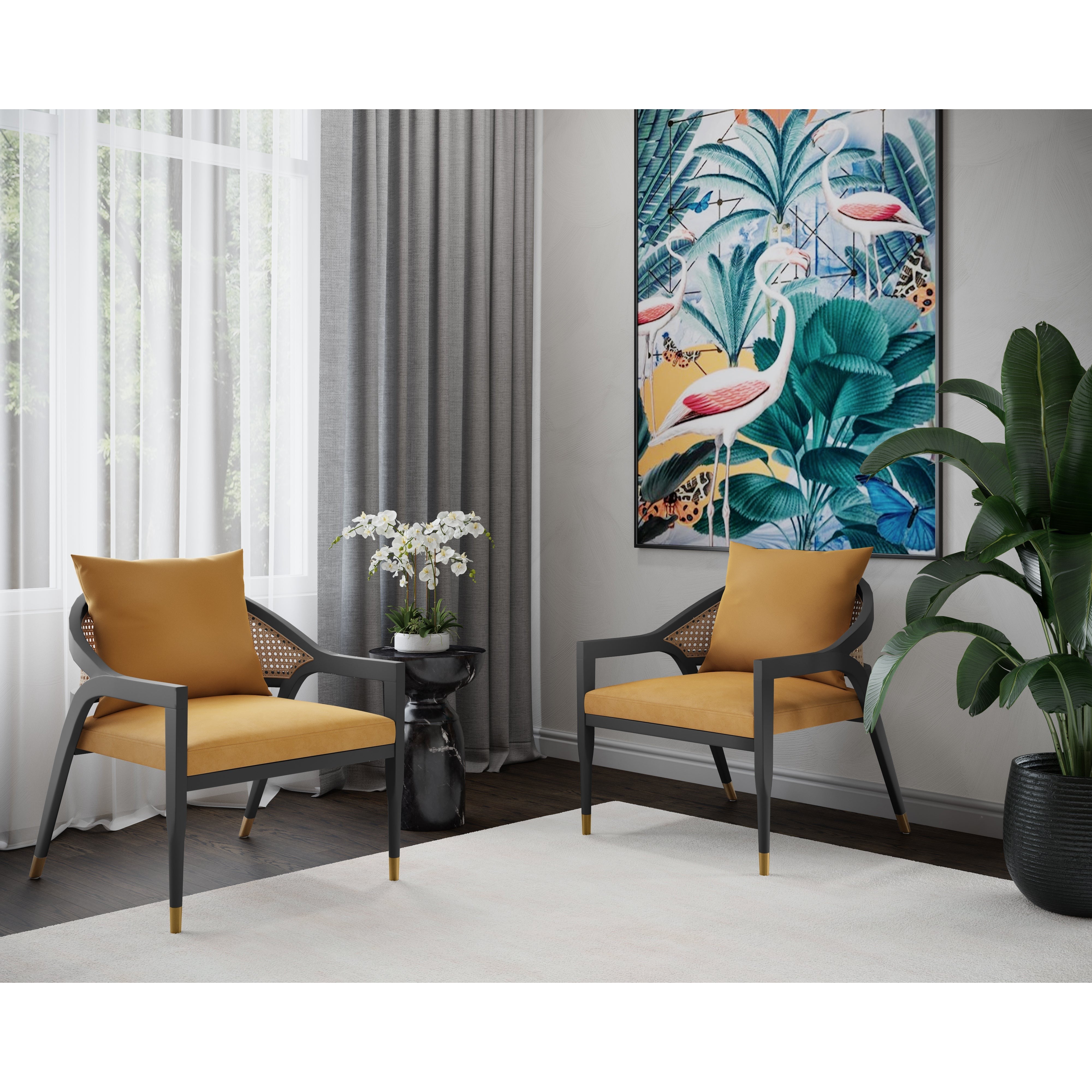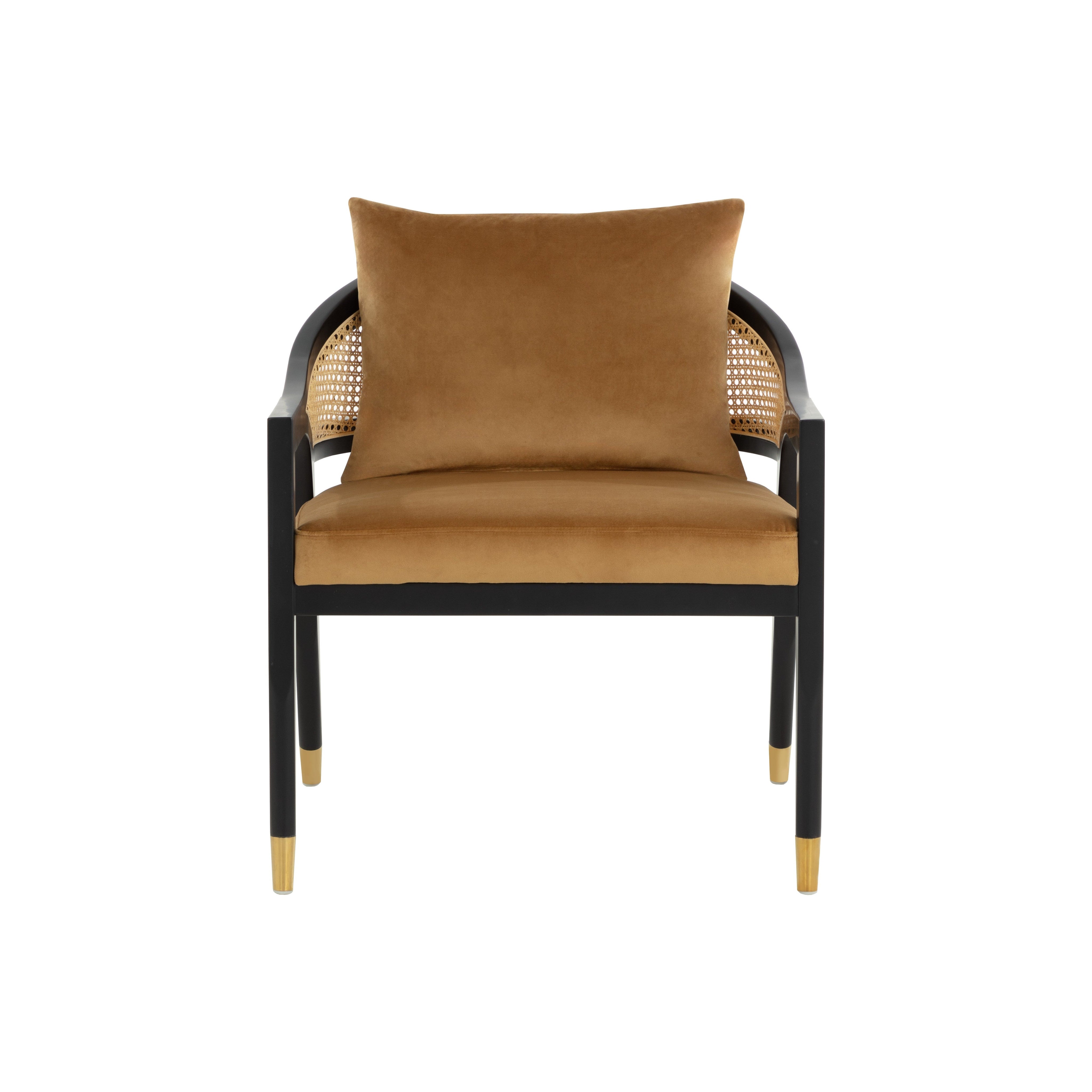 Infusing an airy coastal look with a hint of sophistication, this lounge chair boasts a stunning design that is ideal for any space. Stocked in gold sky fabric with a matte black solid birch wood frame. Completed with a rattan backrest and gold metal foot caps. Also available in linoso ivory performance fabric. Handle With Care: This design has been crafted with rattan. This artisan-crafted material features intricate weaving that results in natural variations where no two pieces are alike. Colour and texture differences are to be expected and embraced with this natural material. Due to the weaving process used, the fibres in this material may display shorter or longer lengths where the weaving ends. Visit our Product Care page for more information on how to ensure the lasting beauty of this piece.