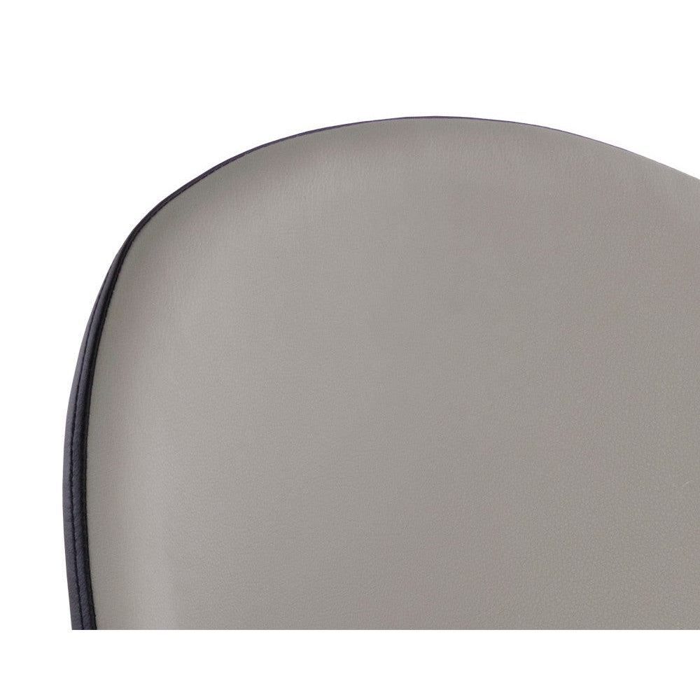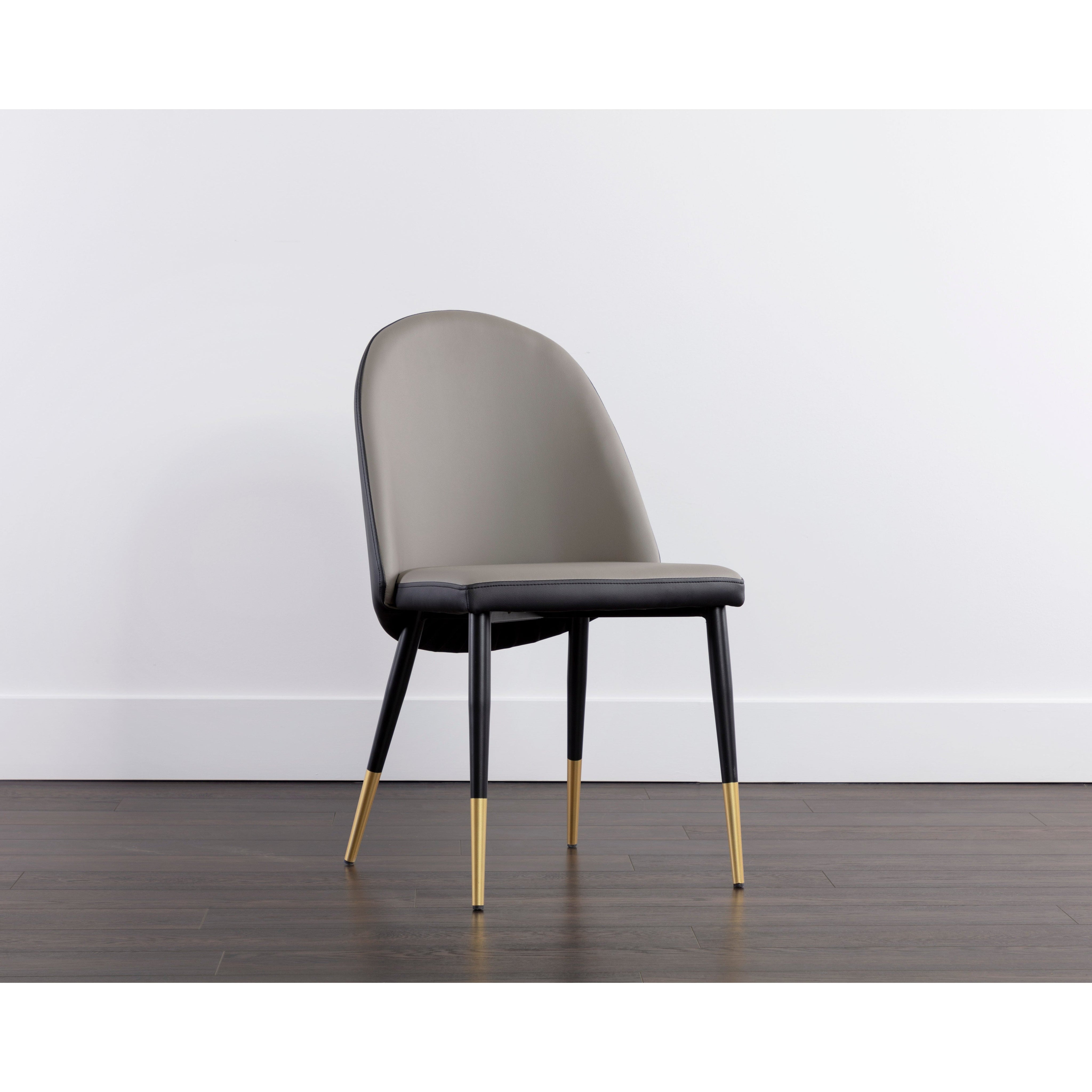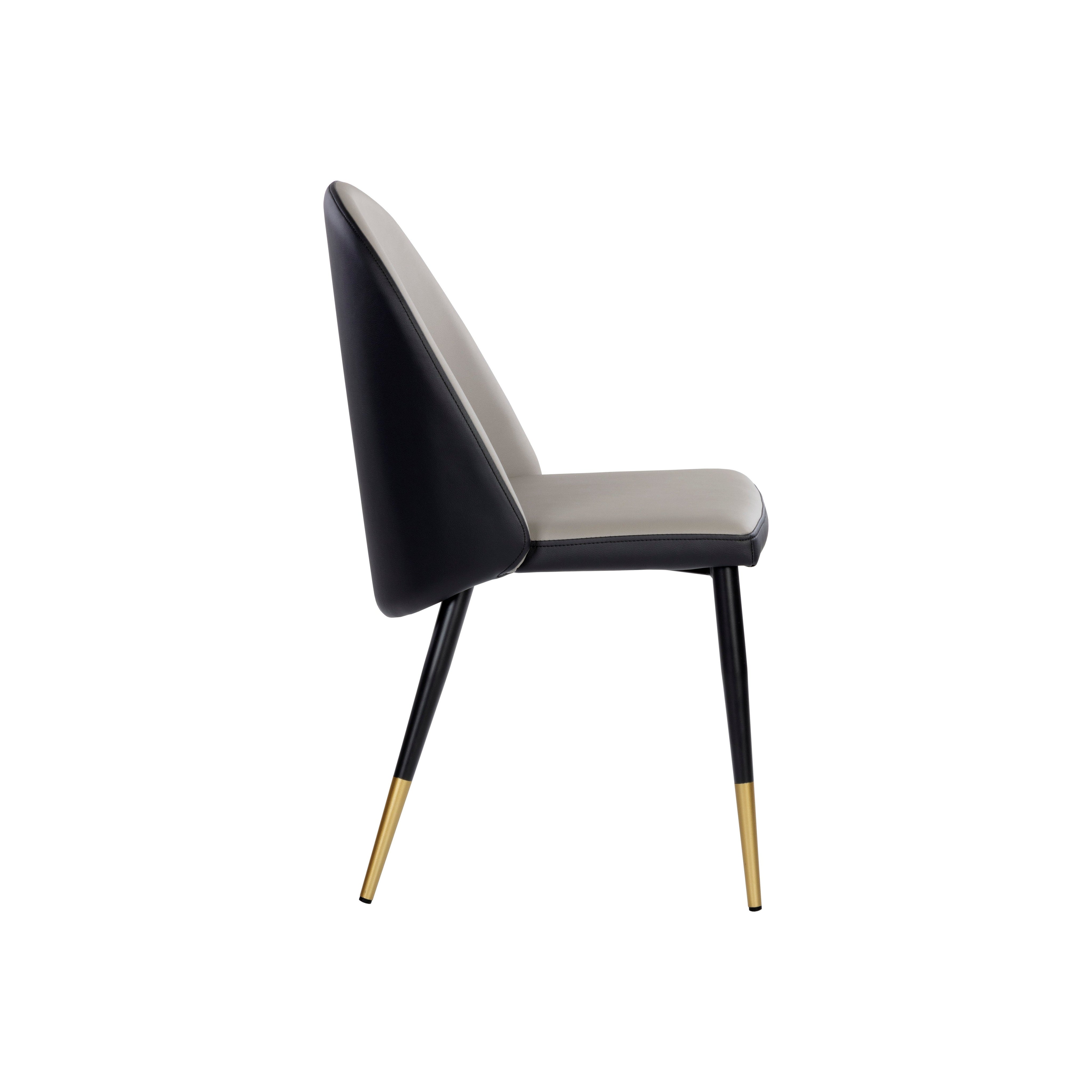 Smooth curves define this modern dining chair made distinct by its rounded seatback. The front is upholstered with dillon stratus faux leather and dillon black faux leather in the back. Completed with black powder-coated steel legs with gold caps. Handle With Care: This design has been crafted with faux leather. Faux leather is manufactured to reflect the natural characteristics of leather; as such, colour variations, markings wrinkles, grooves, and light scratches are appreciated characteristics. No two pieces will be alike. Visit our Product Care page for more information on how to ensure the lasting beauty of this piece.