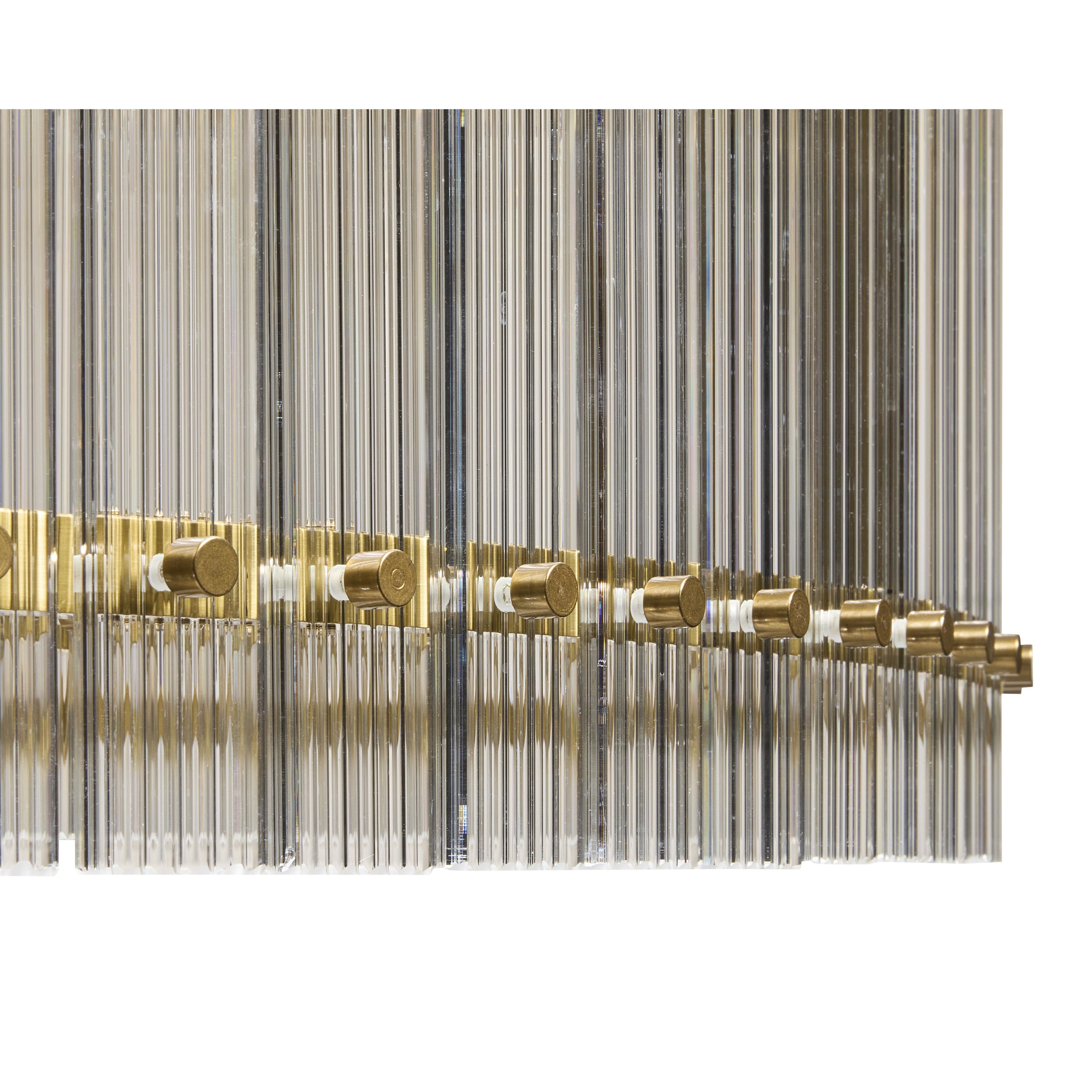 Dazzling and eye-catching, this large, modern chandelier will add a stunning display of radiance to any space. Features a clear fluted glass design with a complementing metal frame in a brass finish.