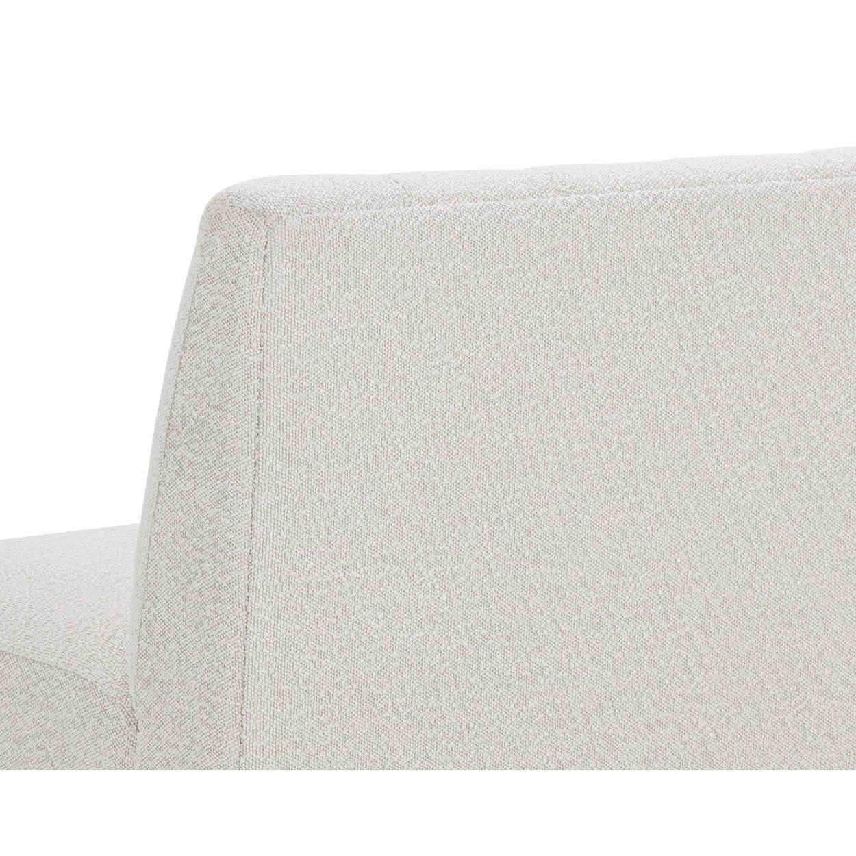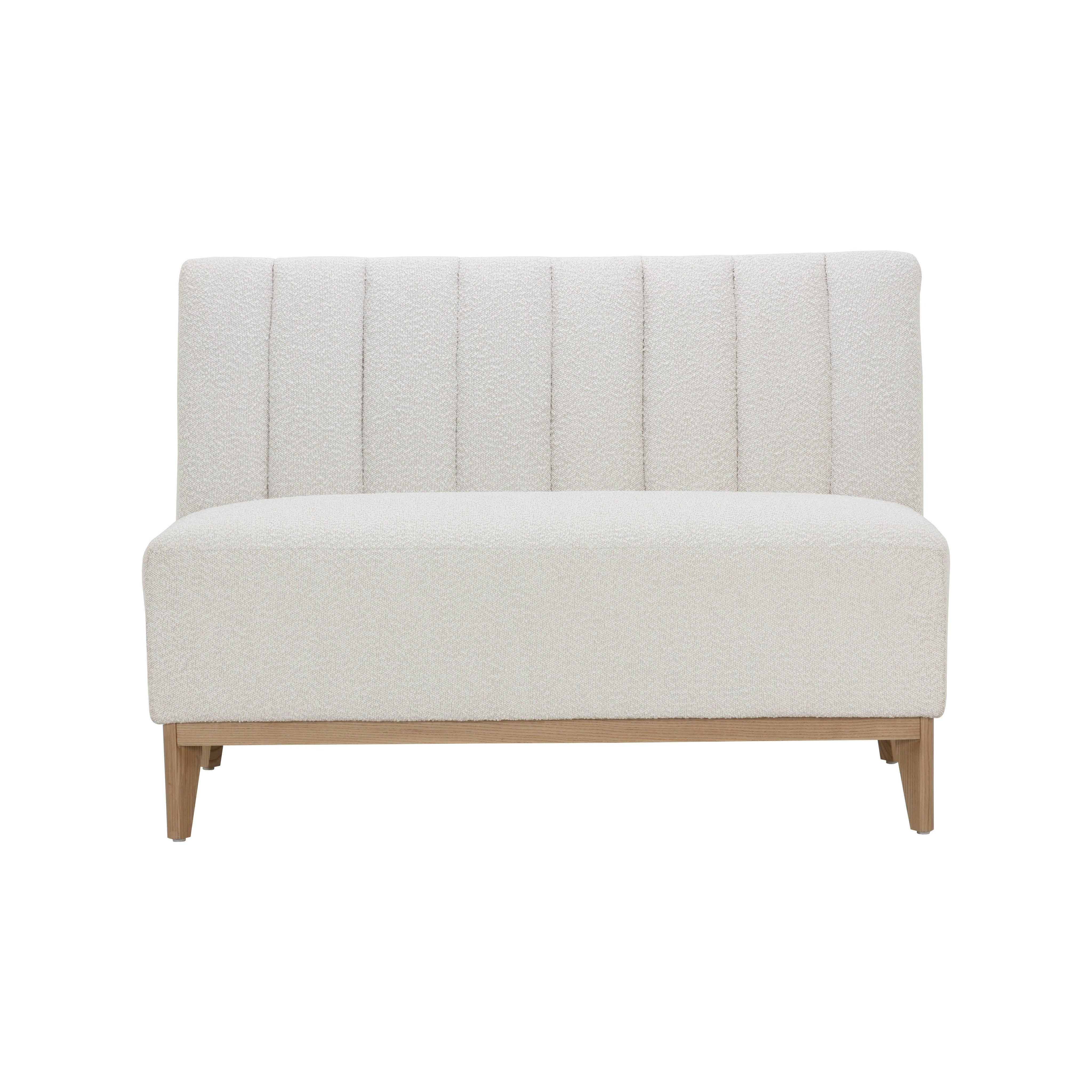 Elegantly designed, the Kosovo Banquette exudes luxe comfort. Upholstered in copenhagen white boucle fabric with vertical tufting, and completed with oak wood legs with a natural finish. As wood is an organic, porous material, these pieces will contain natural variation of texture and may also exhibit fine indentations and cracks. Wood pieces will also display a disparity of colour and grain, and visible knots and burls that add to the character of each piece.