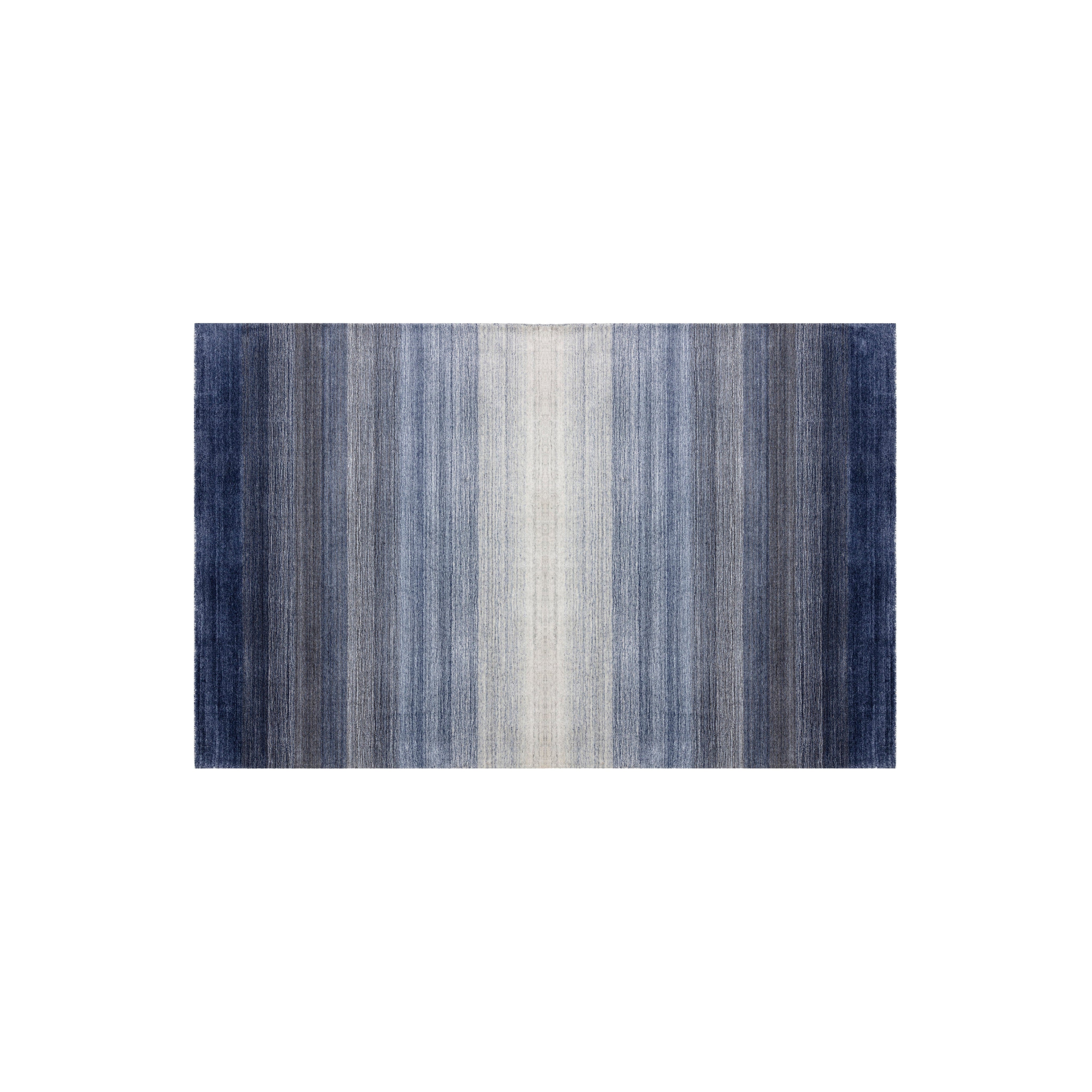 Create a dramatic space with this alluring handloomed rug that is made with a wool-blend. Made by skilled local artisans. Tight weaves create an ombre effect in blue or grey. Available in three sizes. Variations in colour, design and size are to be expected and embraced in each rug due to the distinctive weaving process followed by each artisan, resulting in a truly one-of-a-kind piece.