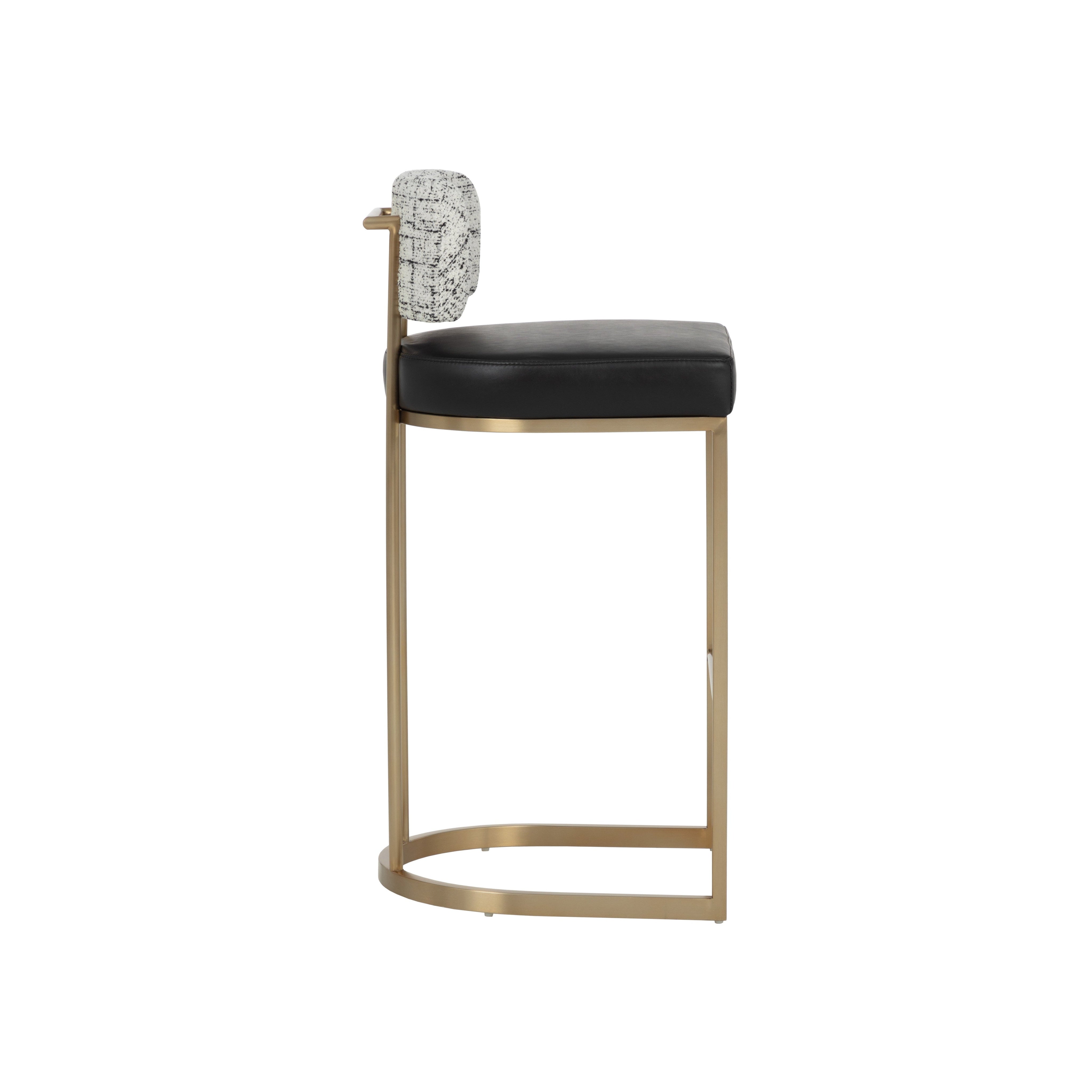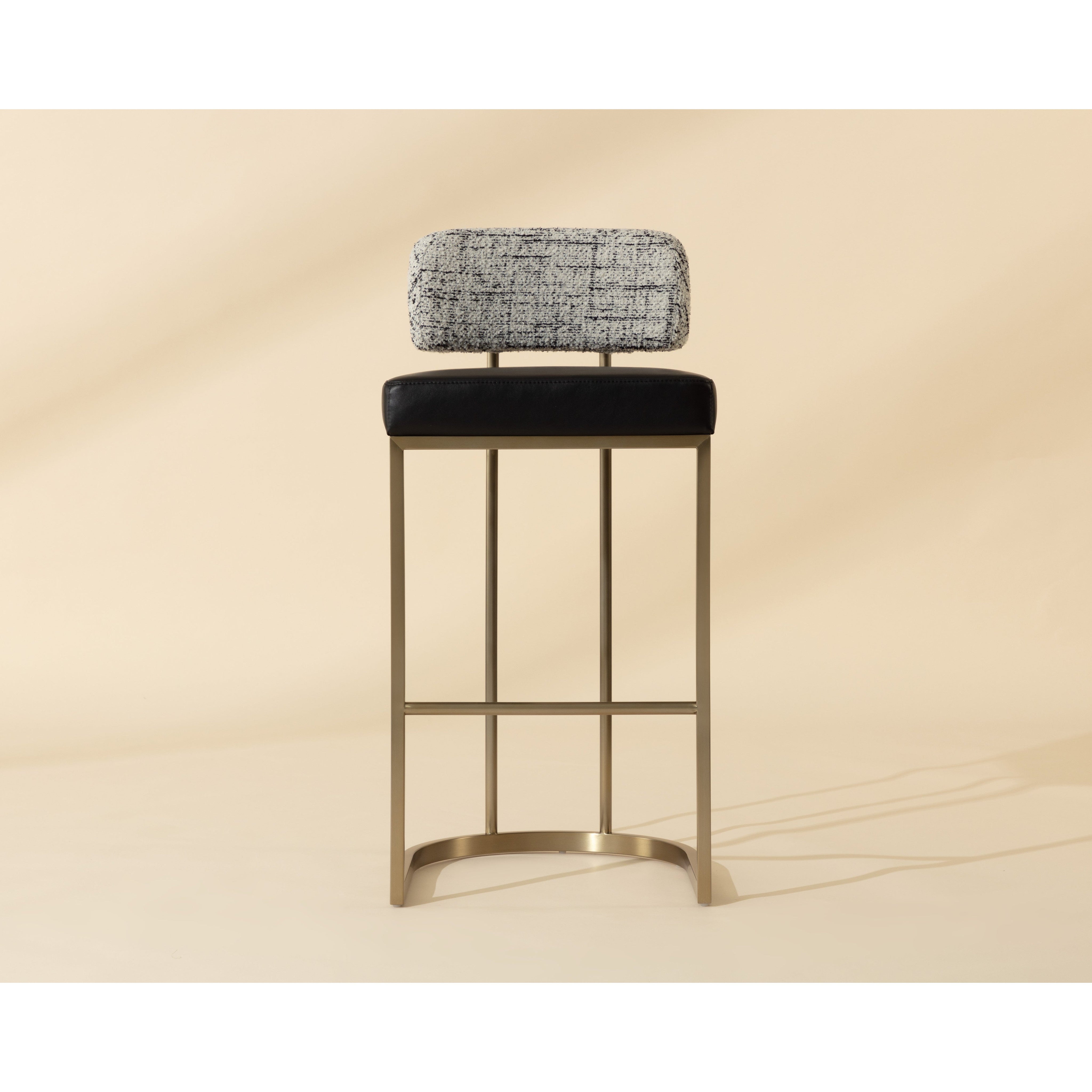 The Larissa Barstool brings together a beautiful display of mixed materials. A low seatback upholstered in rhea light barley fabric contrasts the warm tones of the seat upholstered in napa cognac faux leather for an elevated aesthetic. The antique brass stainless steel frame features a handle on the back for a functional and stylish addition. Handle With Care: This design has been crafted with faux leather. Faux leather is manufactured to reflect the natural characteristics of leather; as such, colour variations, markings, wrinkles, grooves, and light scratches are appreciated characteristics. No two pieces will be alike. Visit our Product Care page for more information on how to ensure the lasting beauty of this piece.