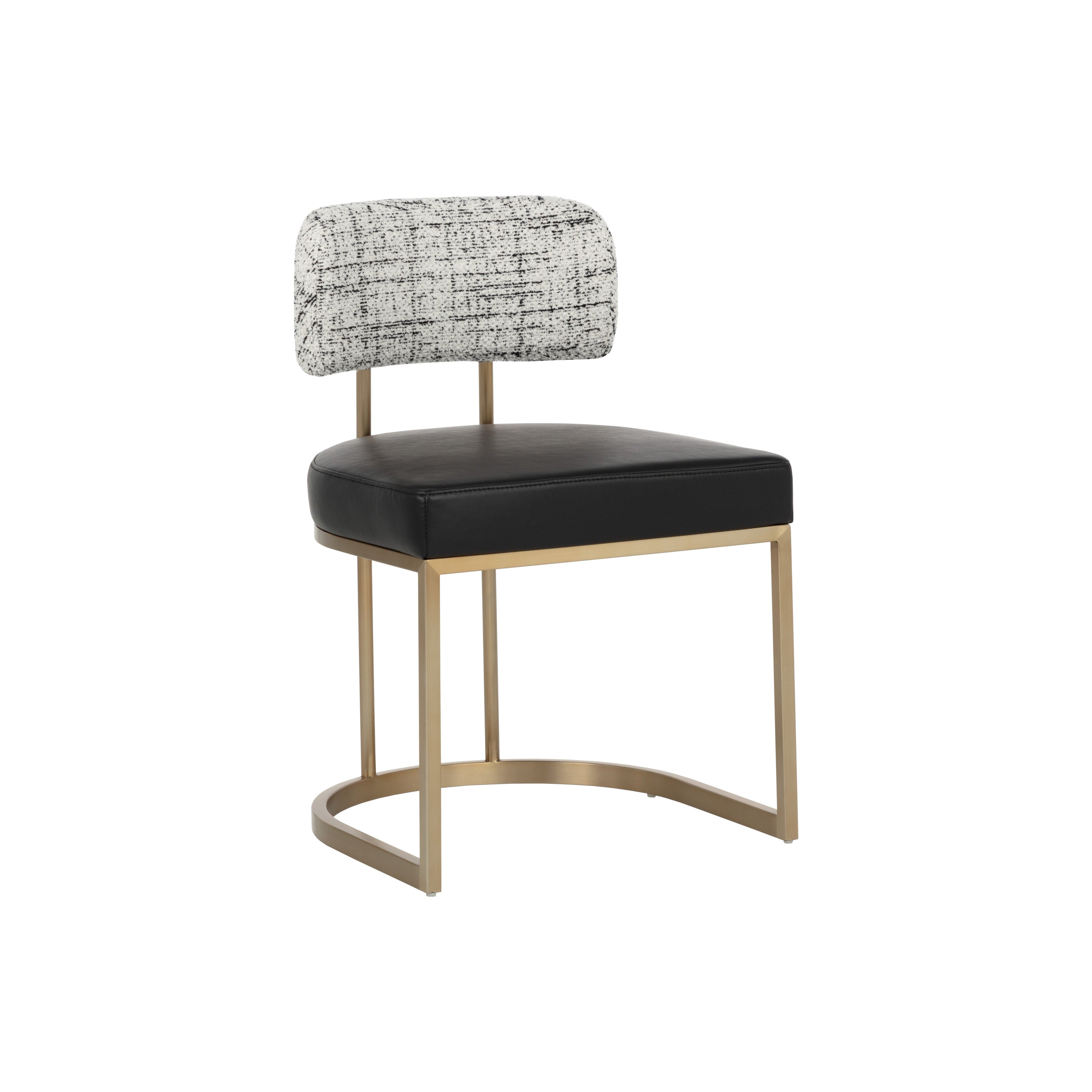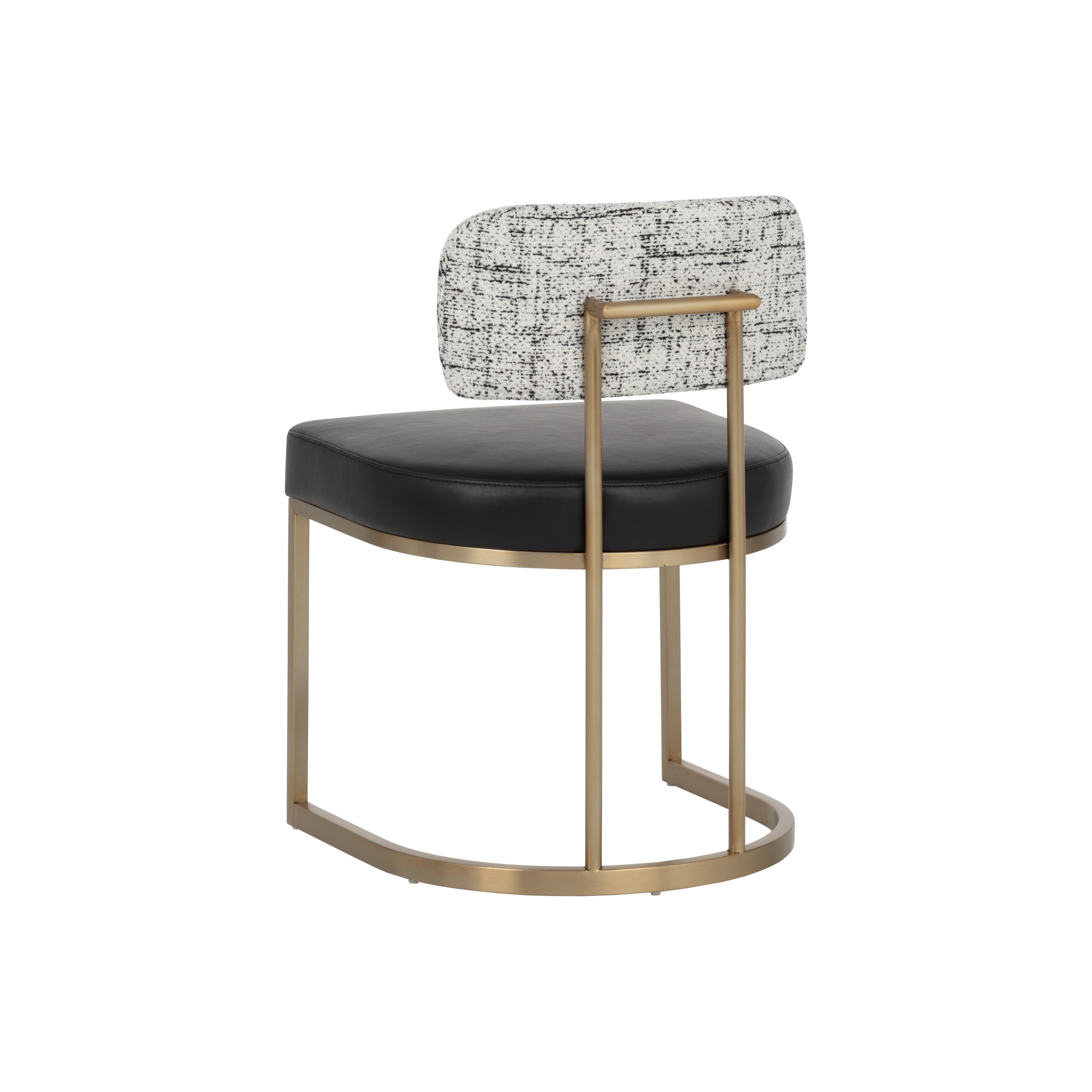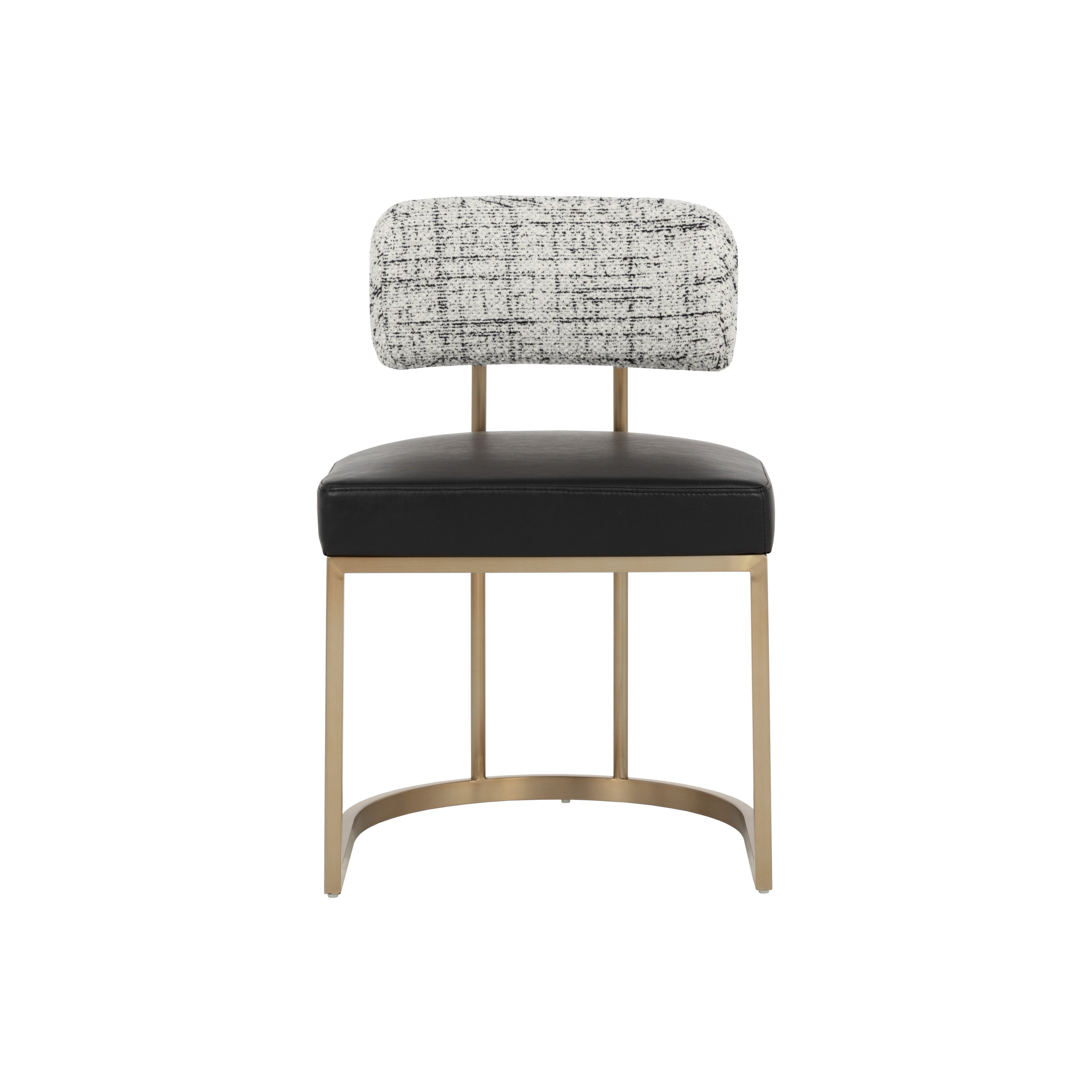 The Larissa Dining Chair brings together a beautiful display of mixed materials. A low seatback upholstered in rhea light barley fabric contrasts the warm tones of the seat upholstered in napa cognac faux leather for an elevated aesthetic. The antique brass stainless steel frame features a handle on the back for a functional and stylish addition.