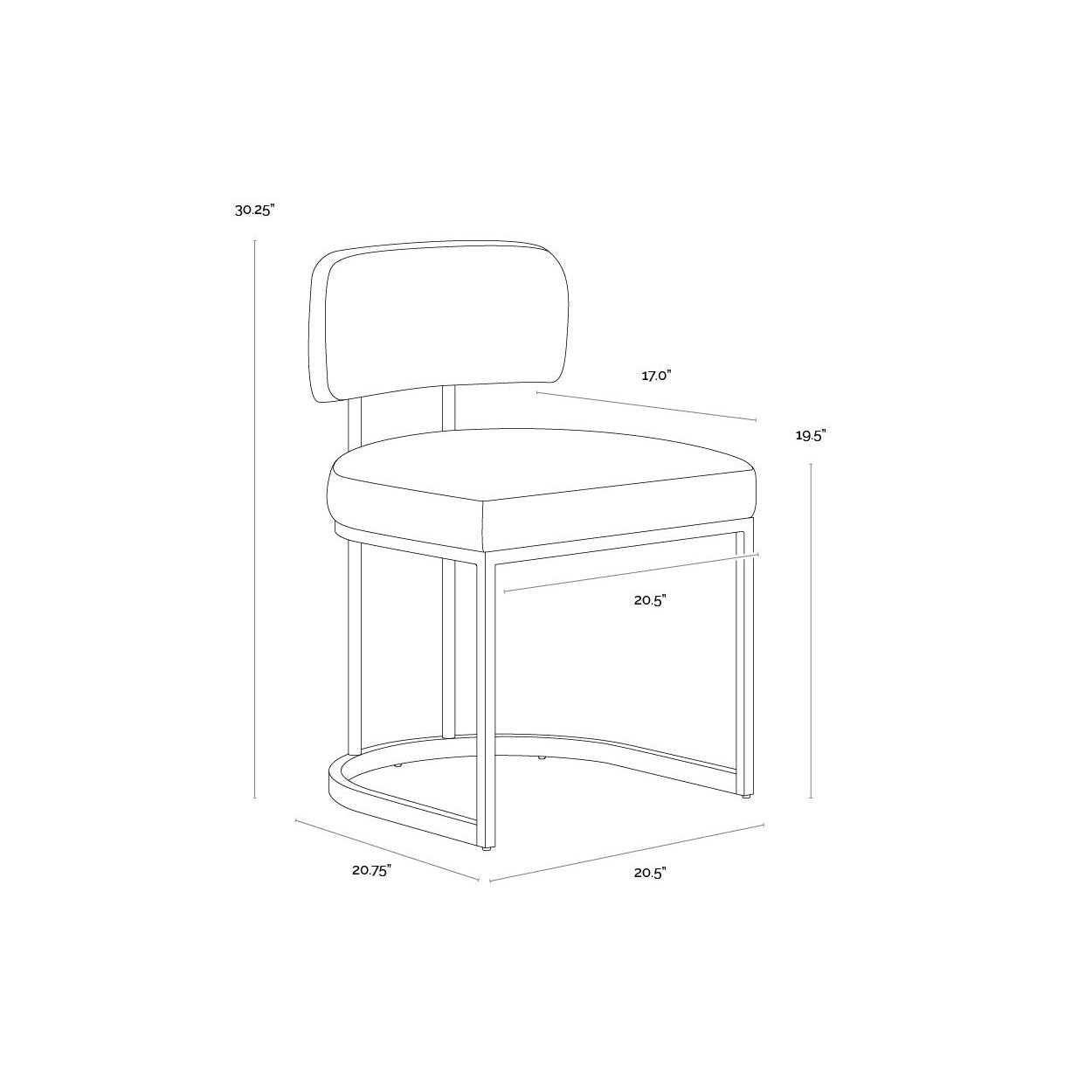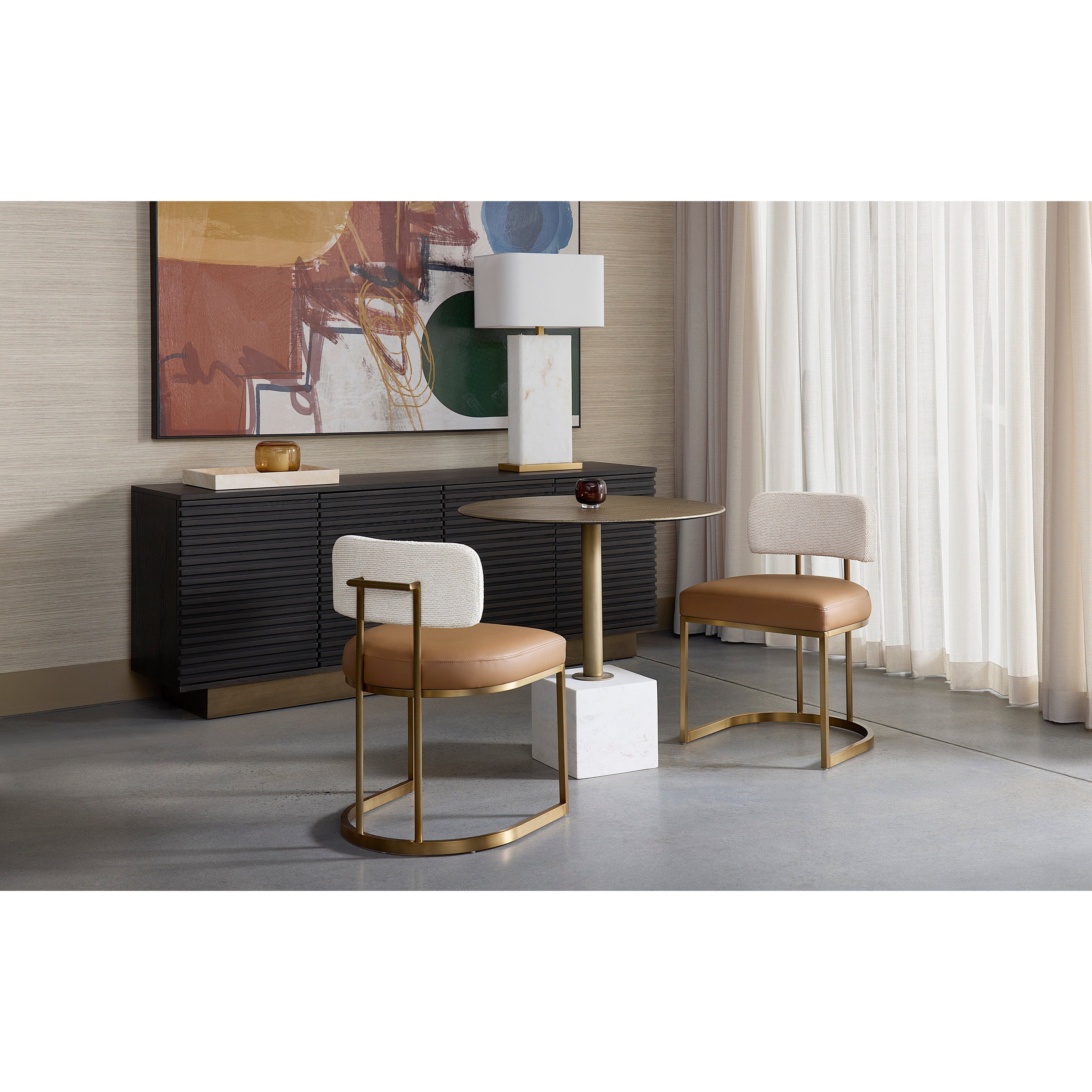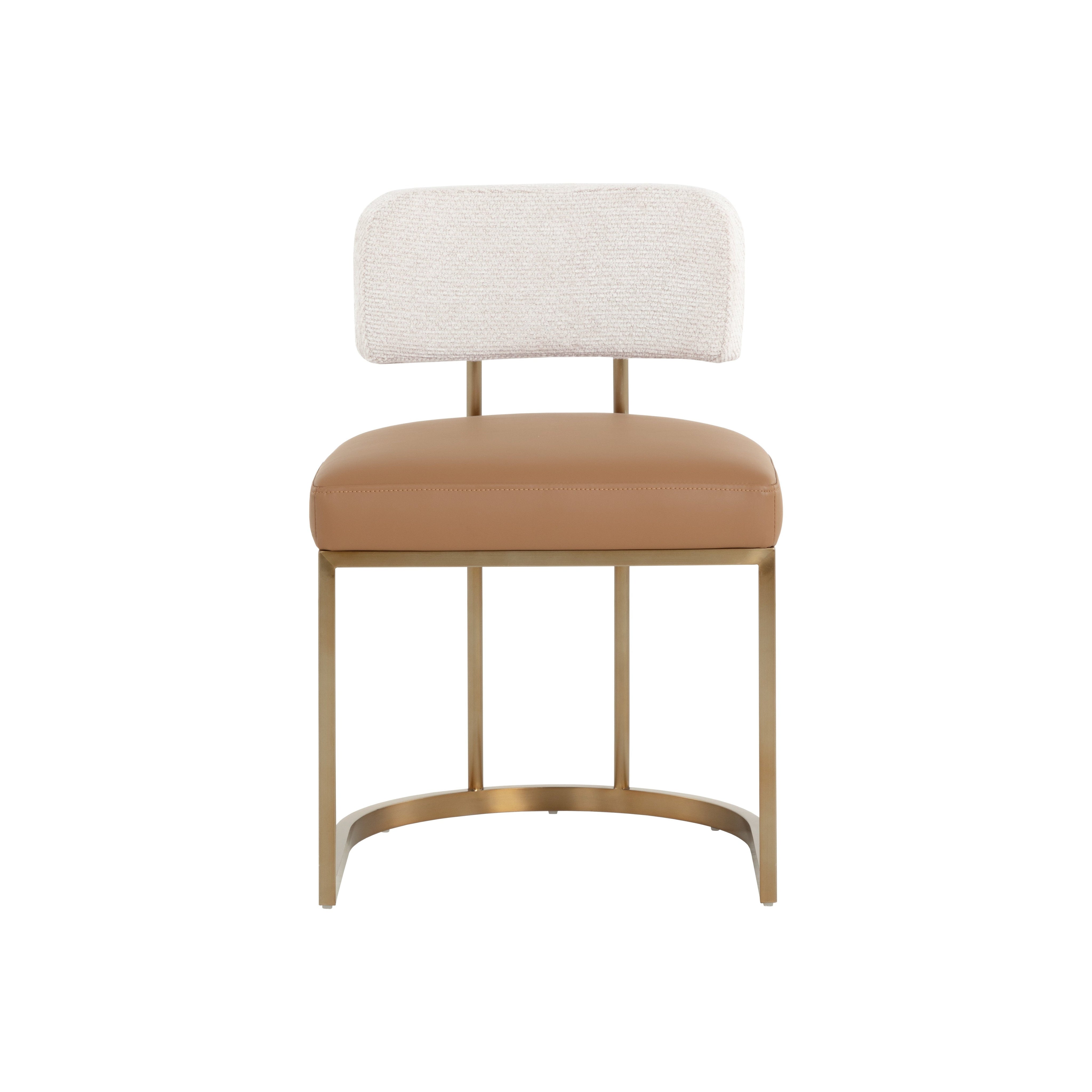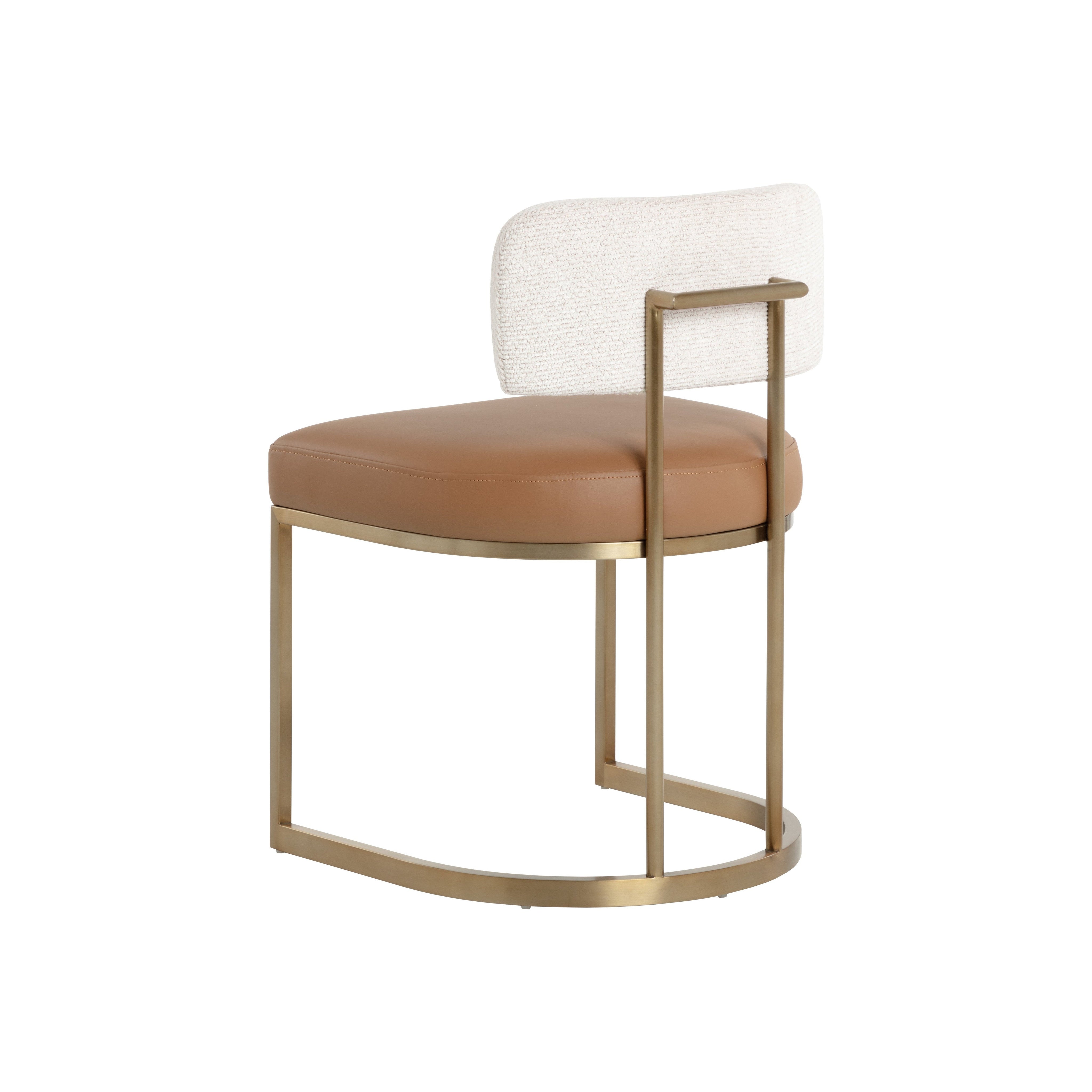 The Larissa Dining Chair brings together a beautiful display of mixed materials. A low seatback upholstered in rhea light barley fabric contrasts the warm tones of the seat upholstered in napa cognac faux leather for an elevated aesthetic. The antique brass stainless steel frame features a handle on the back for a functional and stylish addition.