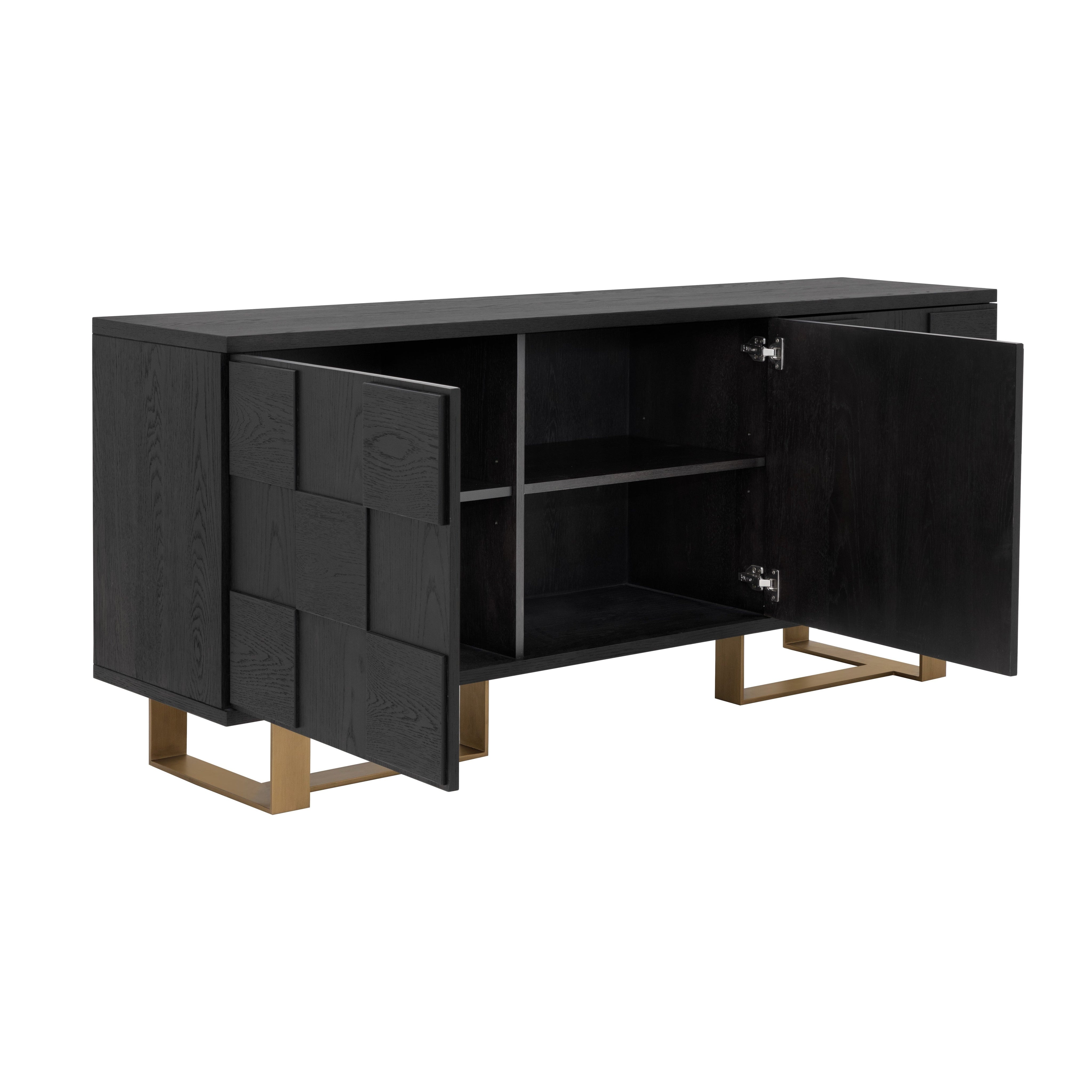 This bold sideboard will bring style and warmth to various dining and living spaces. Crafted with smoked acacia wood and an antique brass frame. Three large cabinets with three-dimensional checkered wood doors provide ample storage. Suitable for residential and contract environments. As wood is an organic, porous material, these pieces will contain natural variation of texture and may also exhibit fine indentations and cracks. Wood pieces will also display a disparity of colour and grain, and visible knots and burls that add to the character of each piece.