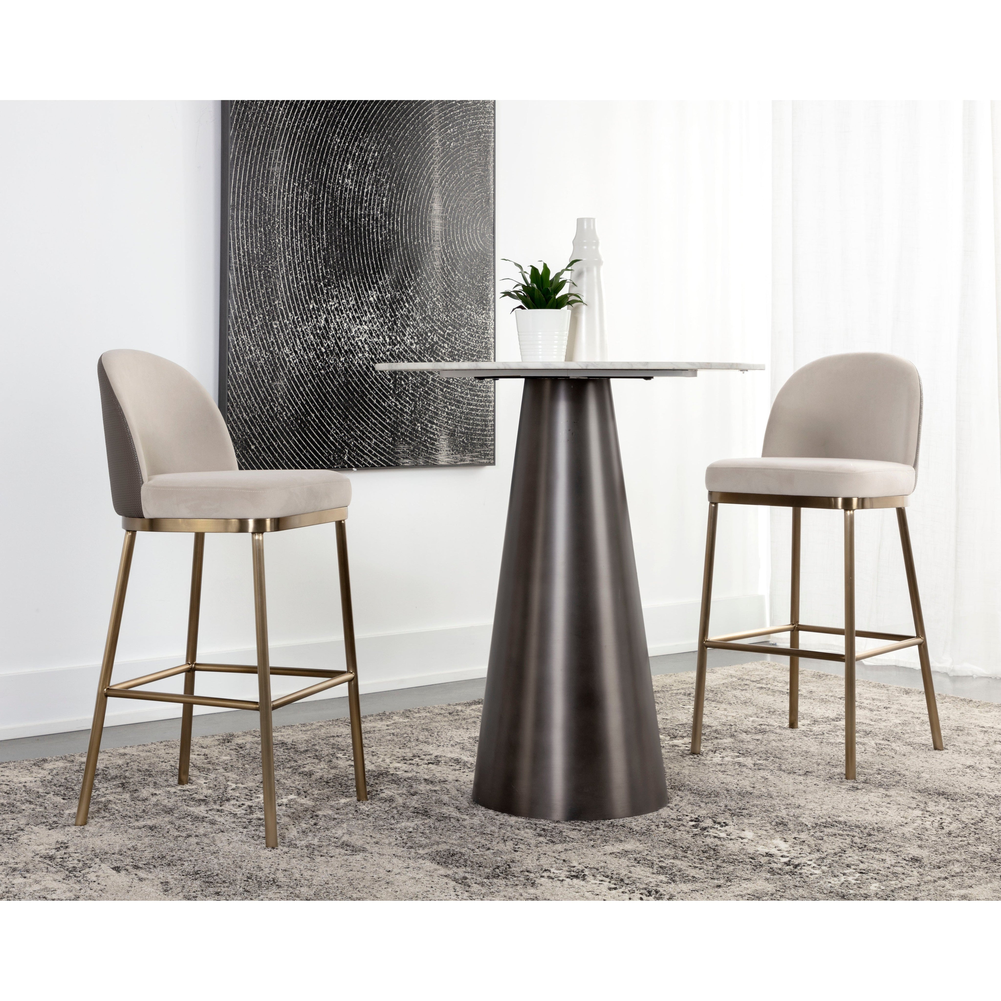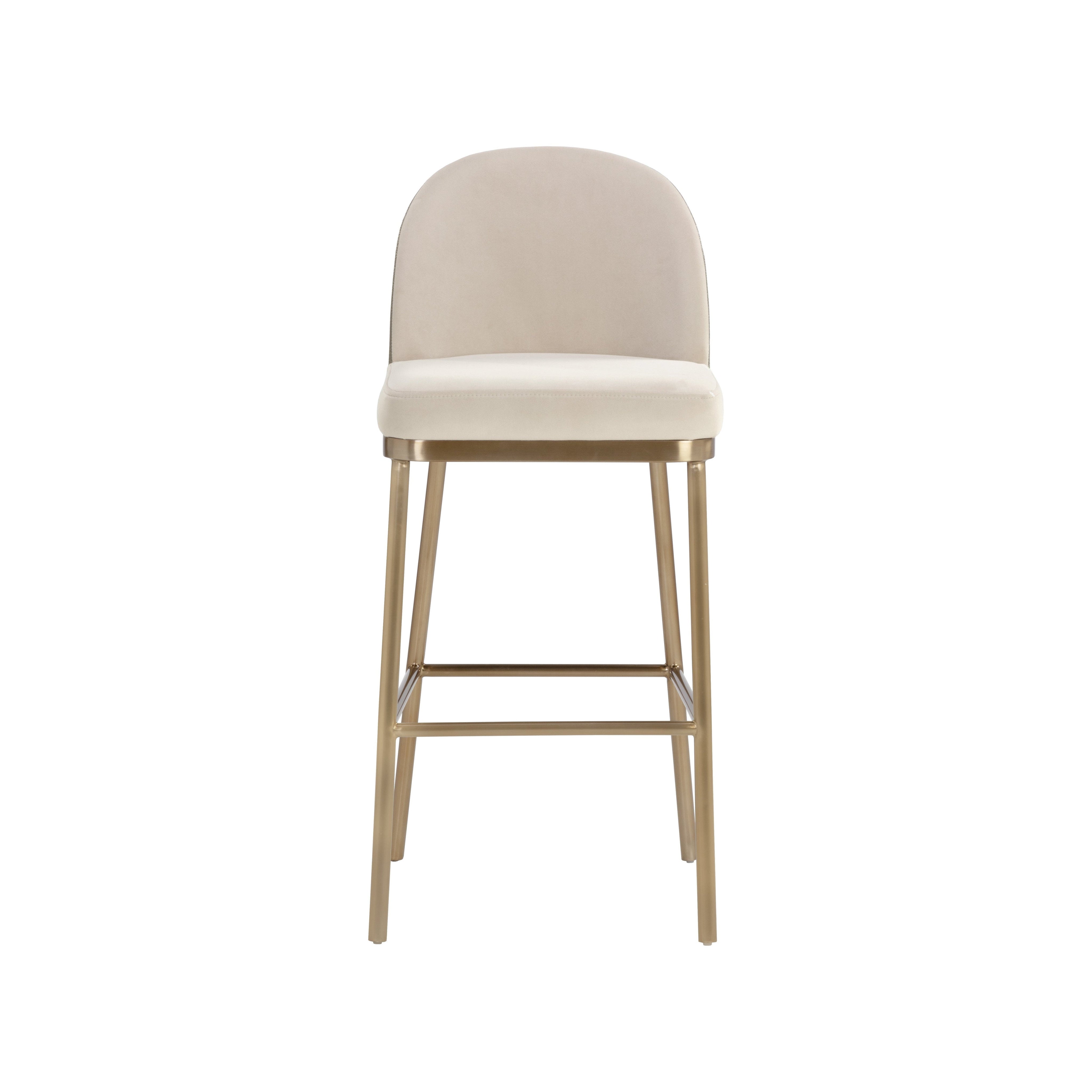 The minimalist frame of the Lavania Barstool is brought to life with an exquisite combination of two toned fabrics. Expertly upholstered with soft meg taupe fabric on the seat and interior while textured porcini taupe faux leather adds a tactile touch to the back exterior. The design is complemented with powder-coated antique brass stainless steel.