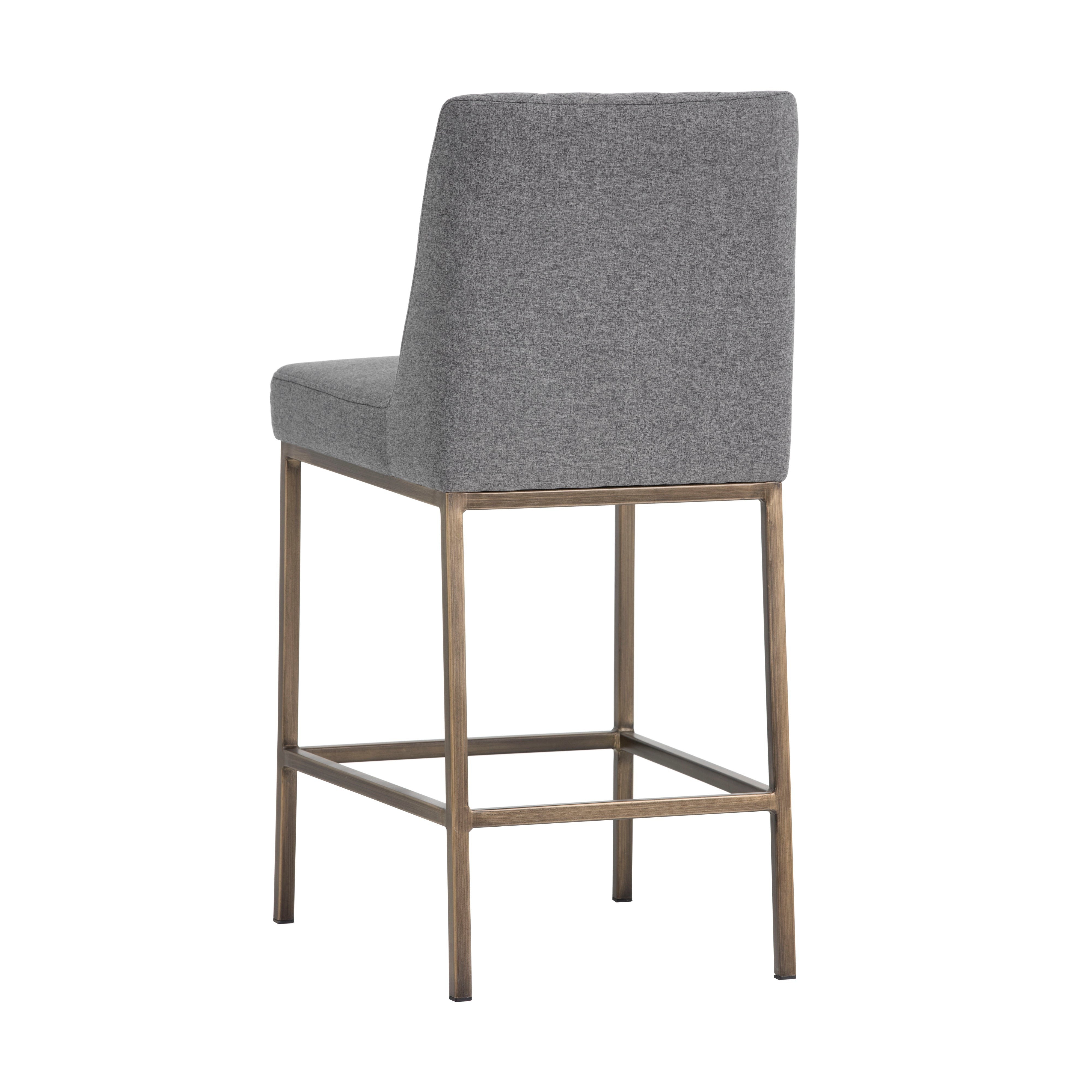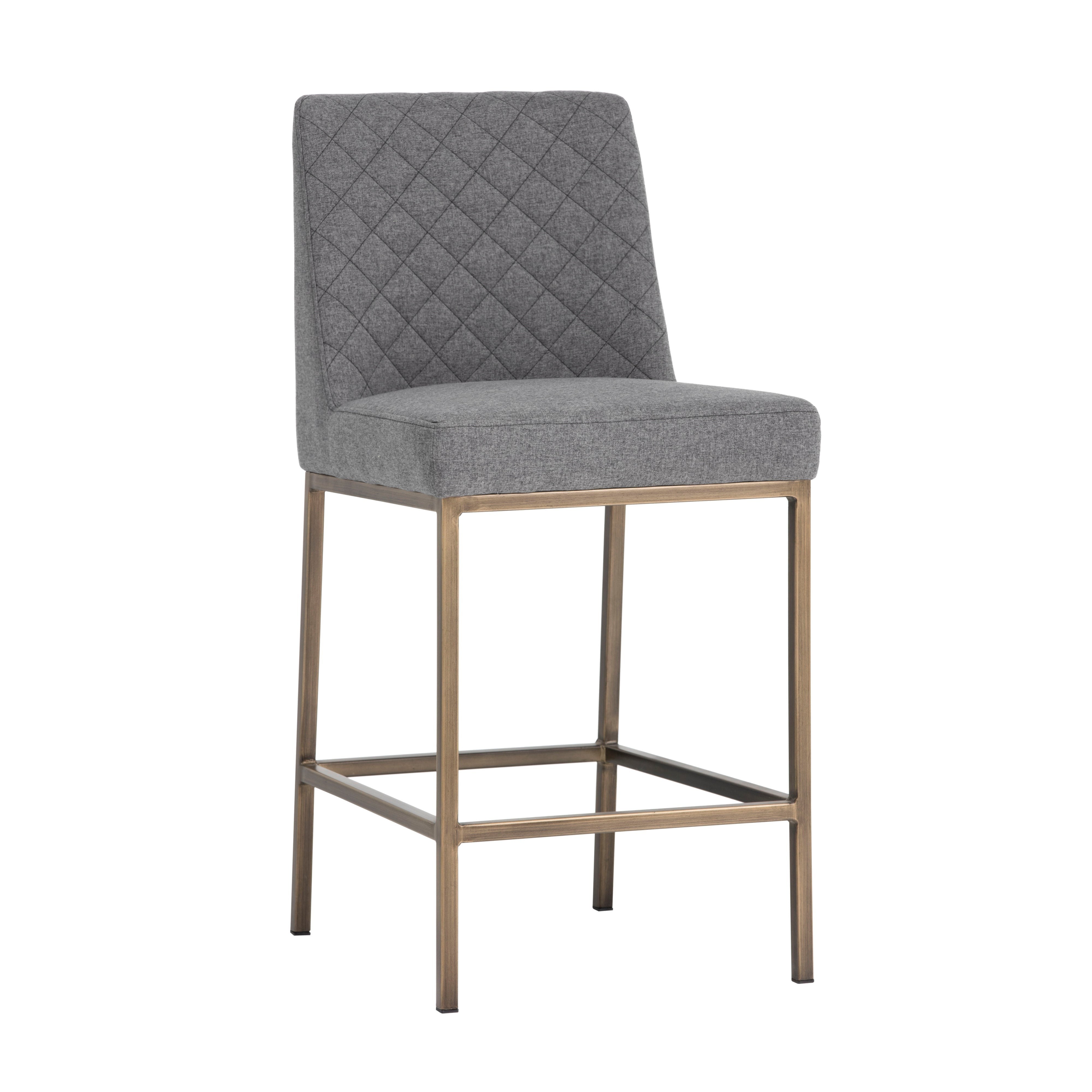 Transform bar and dining spaces with this classic counter stool. Stocked in dark grey fabric with diamond stitching on the interior seat back and an antique brass frame steel frame. Suitable for various dining, kitchen and bar spaces of all sizes.